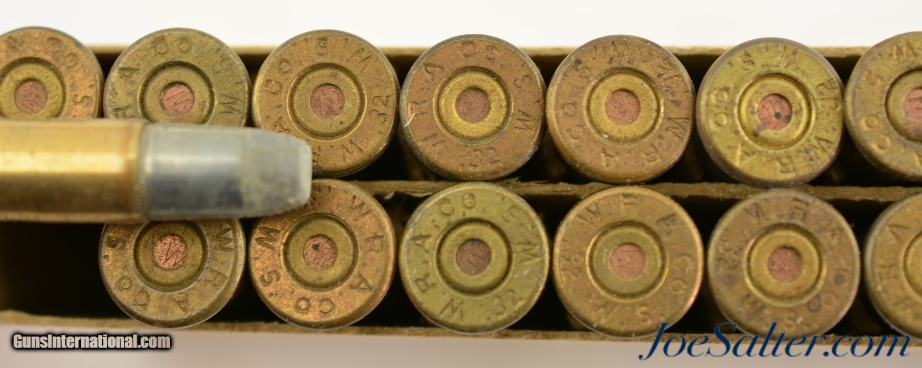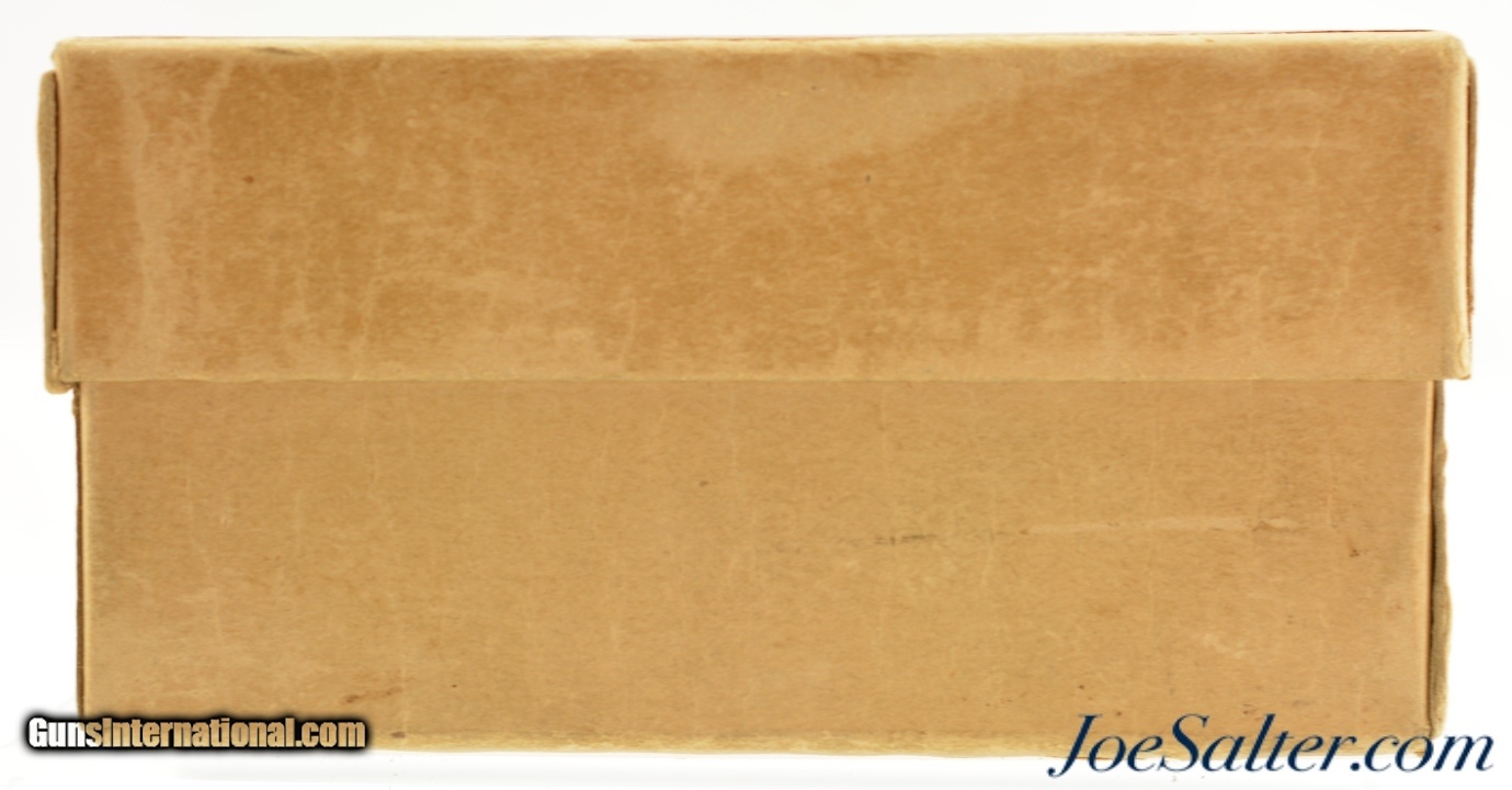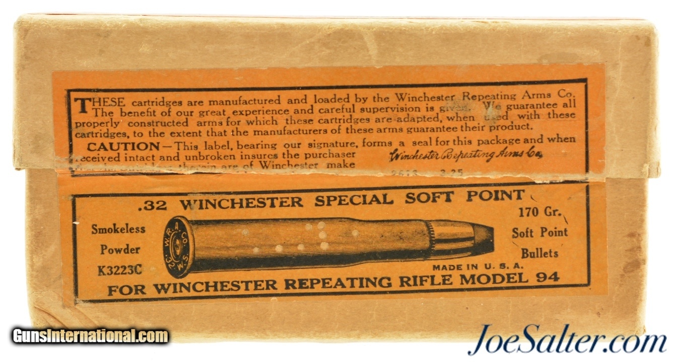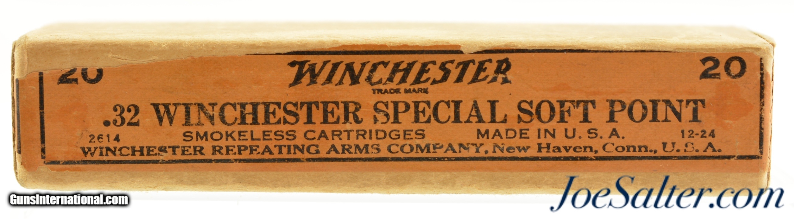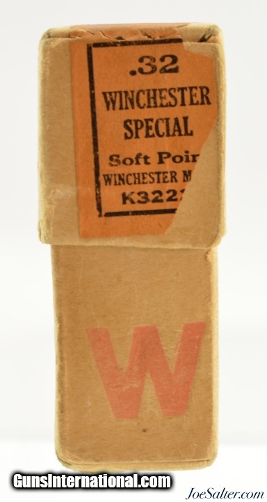 Description: This is a full box, 20 original rounds, of .32 Winchester Special ammunition manufactured by Winchester with 170 grain soft point bullets. The circa 1924-25 box with orange and black labels is solid with a slight left edge crush and is missing small pieces of the top and top side labels with intact side label. The cartridges are in near excellent condition with some slight age darkening. SOLD |