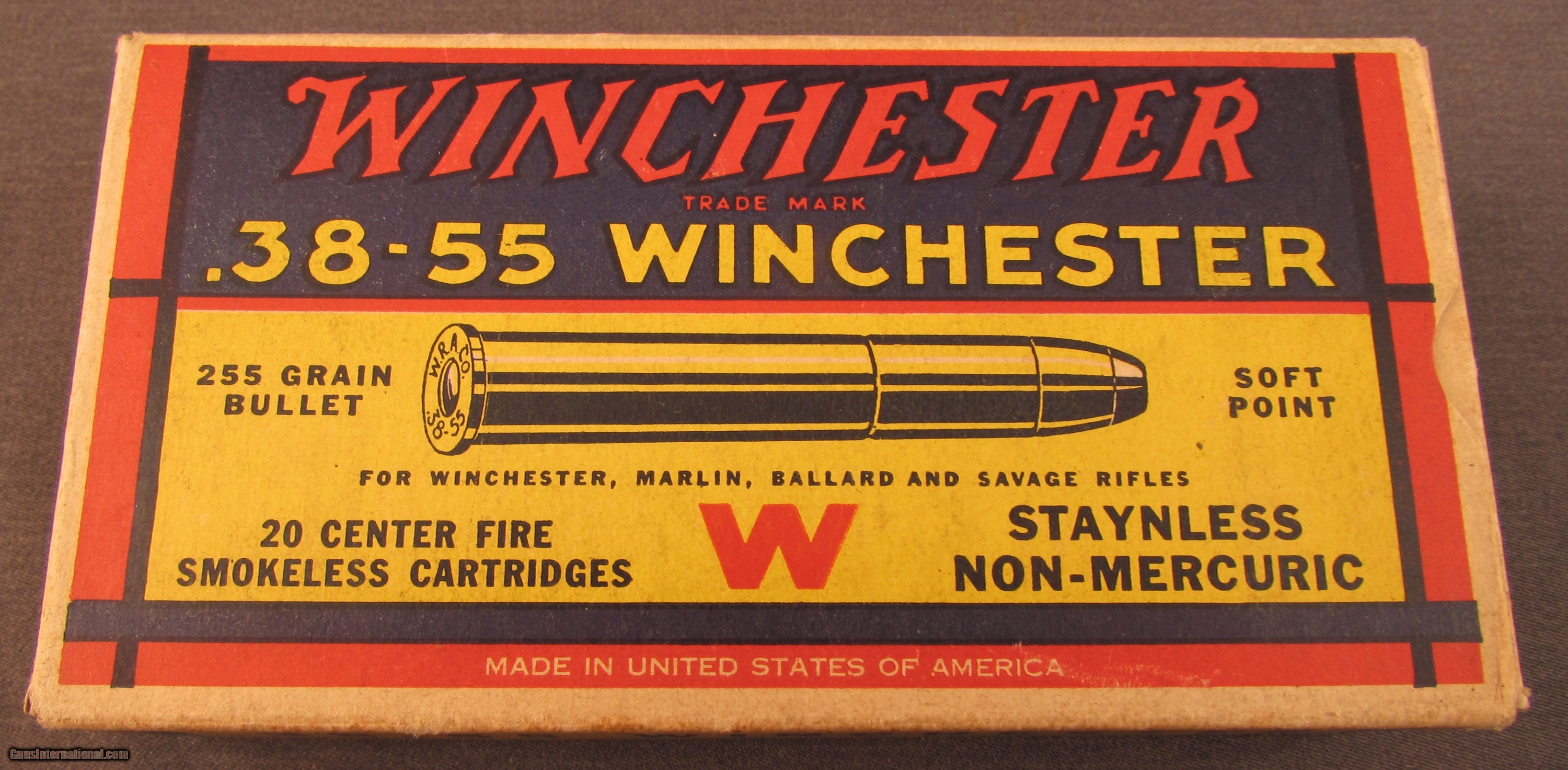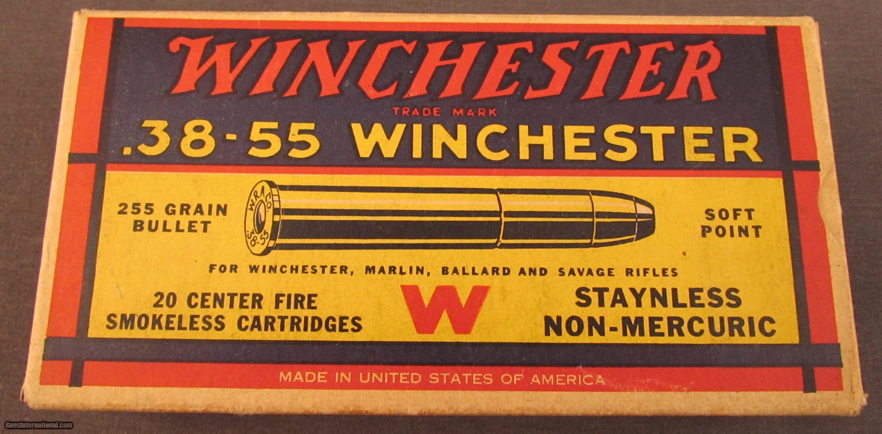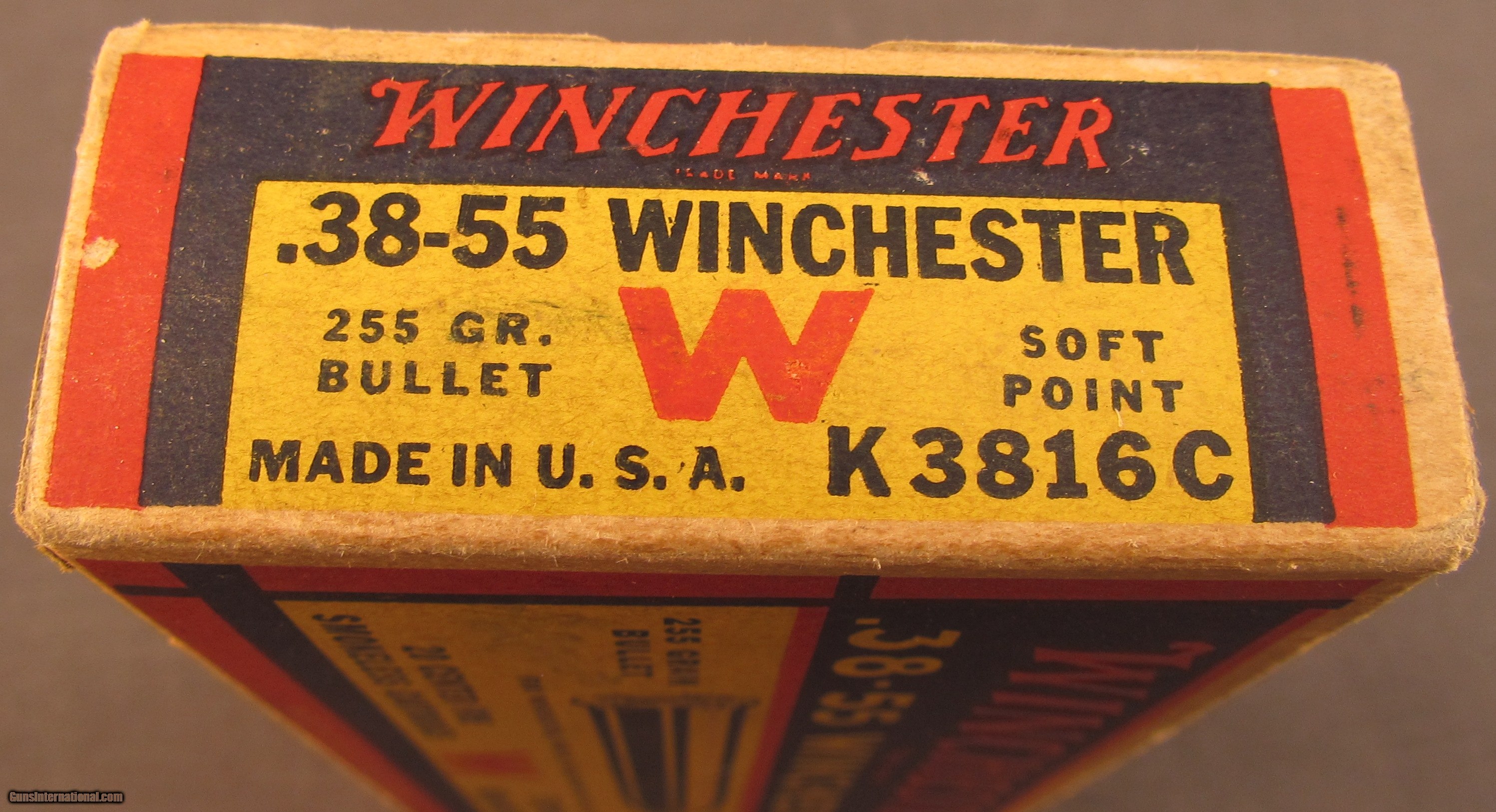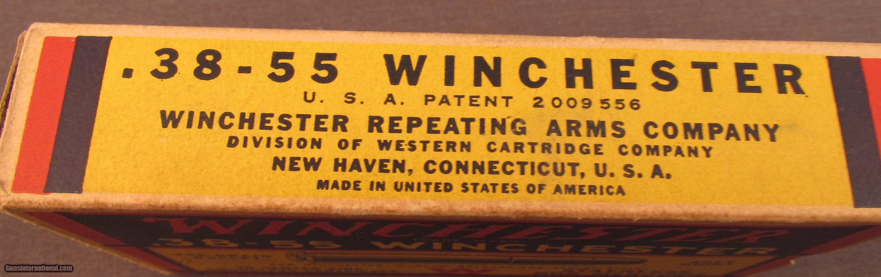 Description: Winchester 38-55 excellent box. See page 199 of "Winchester Cartridge Boxes" by Giles and Shuey. Referred to as the "1939" box with di and a pencil old price mark A nice collector box. vision of Western Cartridge Co call out.- All carts are original and excellent. The box shows bright color and rates excellent . the reverse side shows a slightly darker SOLD Manufacturer: Winchester Model: Ammo Caliber Info: .38-55 Gauge Info: .38-55 |