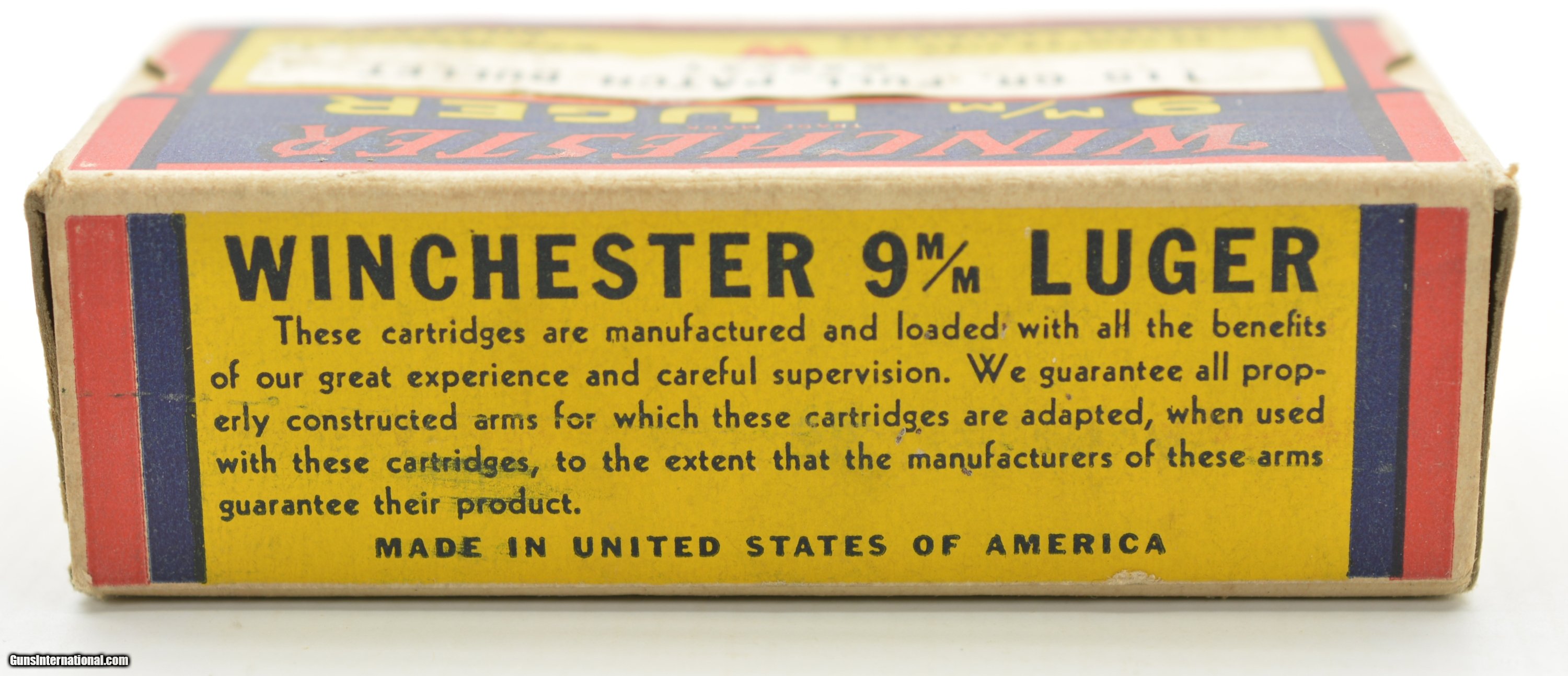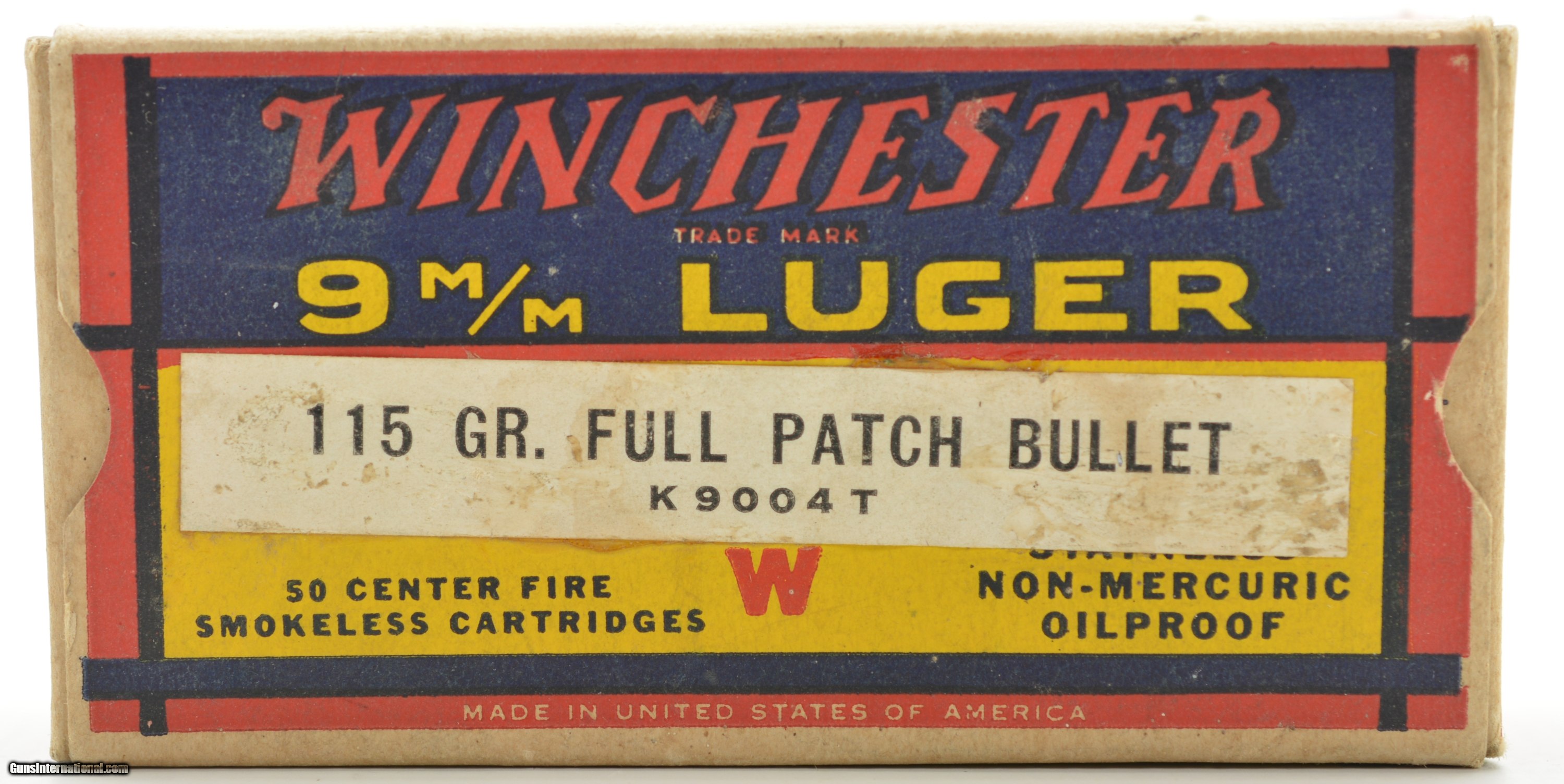 Description: This is a full box of 9mm Luger bullets from Winchester in a “1939" style box that has the factory applied transition label showing the 115 Grain bullet loading. These older boxes showed the original 125 Grain loading and marked the change to the lighter bullet with applied label and new “K9004T" code using up old supplies of boxes. The box is in excellent condition with crisp graphics showing light handling and storage wear with excellent ammunition. SOLD Manufacturer: Winchester Model: Ammo Caliber Info: 9mm Gauge Info: 9mm |