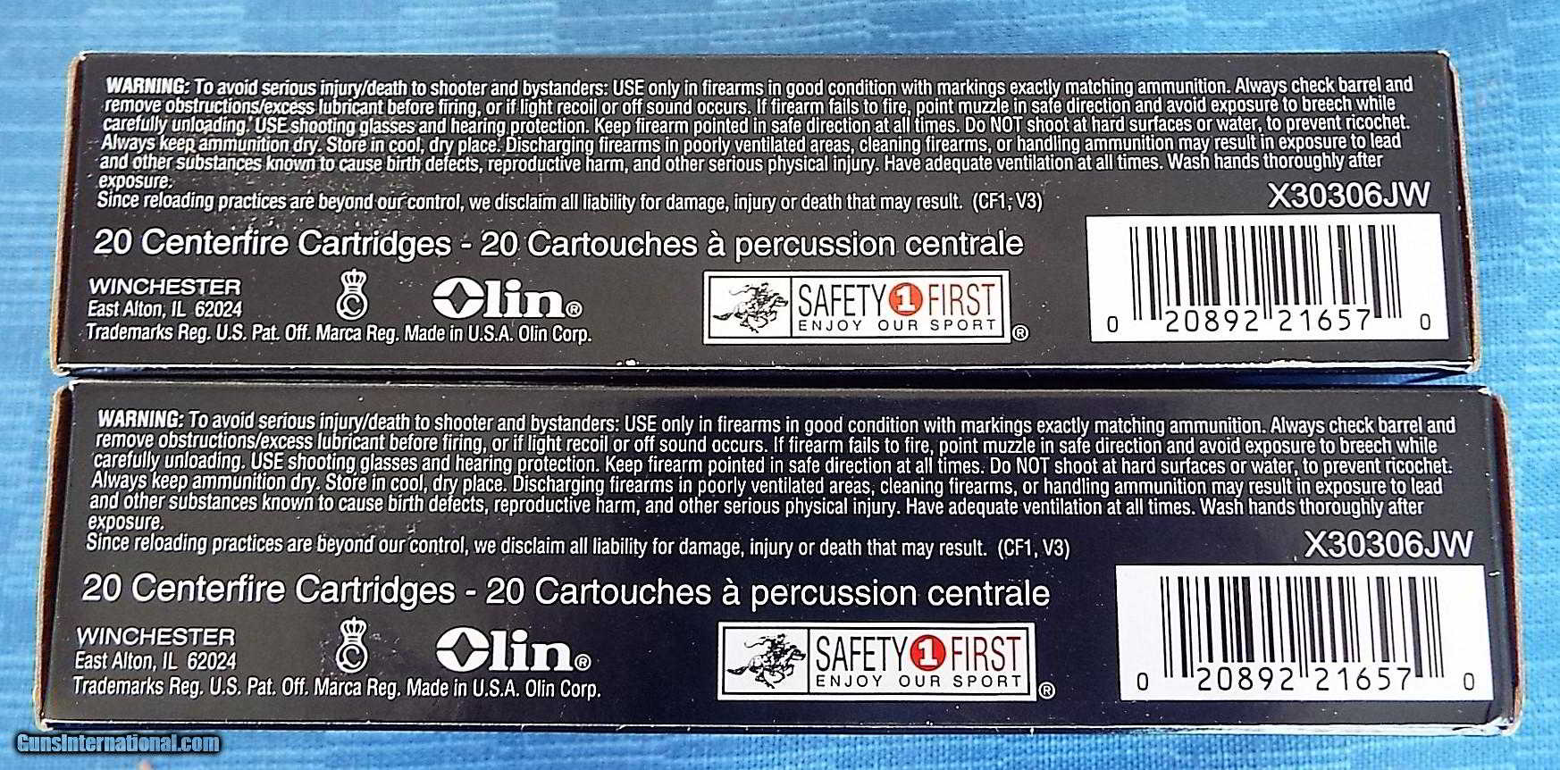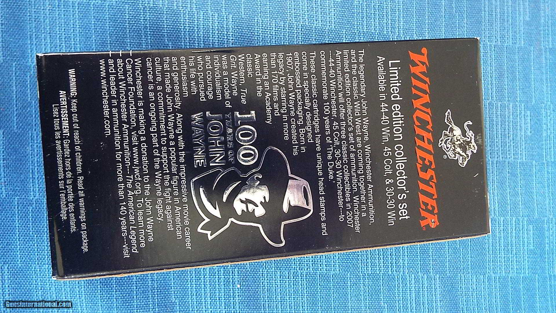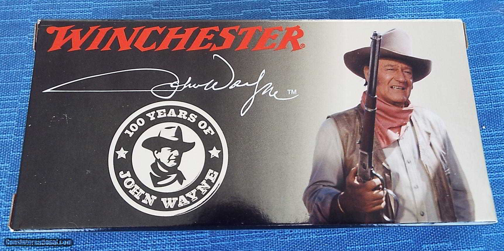 Description: : WINCHESTER ~ X30306JW FOR SALE ARE( 2) BOXES OF COLLECTABLE "JOHN WAYNE" 30-30 WINCHESTER RIFLE CARTRIDGES. EACH BOX HAS 20 CARTRIDGES OF WINCHESTER 150 GRAIN PP. THIS AMMO WAS ONLY MANUFACTURED IN 2007 TO COMMEMORATE 100 YEARS OF JOHN WAYNE. AMMO IS IN PRISTINE NEW CONDITION. EMBOSSED BOXES ARE IN EXCELLENT SHOWCASE CONDITION!. FIRM, ALL FLAPS INTACT. . ALL AMMO IS HEADSTAMPED "DUKE" W & 30-30 WIN. GREAT GRAPHICS OF JOHN WAYNE WITH WITH HIS LEVER ACTION RIFLE ON THE TOP & HIS SIGNATURE,AND AN EMBLEM WITH DUKES PROFILE & 100 YEARS OF JOHN WAYNE EMBOSSED ON IT . THIS WOULD BE A GREAT ADDITION TO ANY COLLECTION! PLEASE VIEW ALL PICTURES AS THEY ARE PART OF THE DESCRIPTION.** PLEASE ABIDE BY ALL YOUR LOCAL LAWS AND REGULATIONS. BY PURCHASING THIS AMMO YOU ARE ASSURING US THAT YOU ARE OVER 18 YEARS OF AGE , AND LEGALLY ABLE TO HAVE THIS AMMO IN YOUR POSSESSION! ** ( ANY QUESTIONS PLEASE CALL 772-349-0334 ) PLEASE CHECK OUT OUR OTHER LISTINGS, AS WE HAVE NO PROBLEM COMBINEING SHIPPING, (LOWER 48 ONLY) 6.5 % TAX WILL BE ADDED ON ANY SALES IN FLORIDA. $16 SHIPPING FLAT FEE, LOWER 48 ONLY!! THANKS FOR LOOKING!! SOLD |