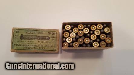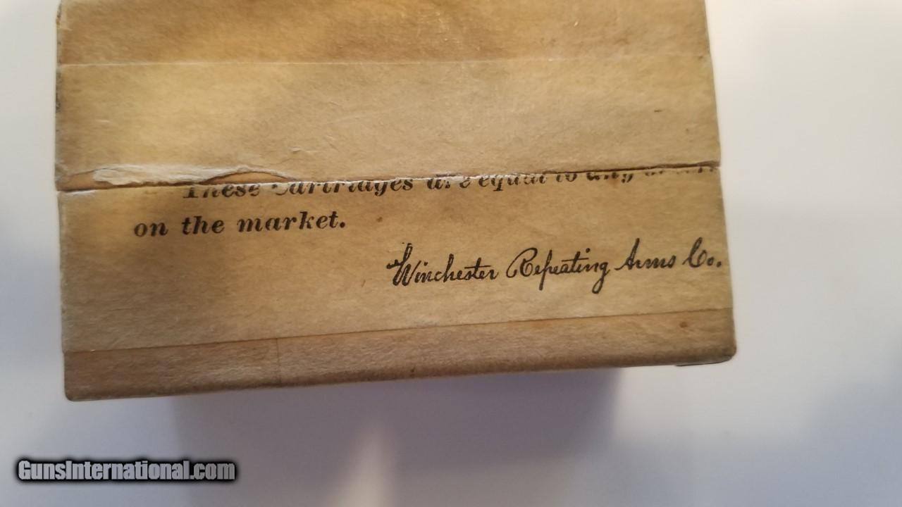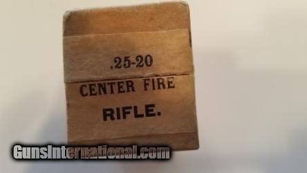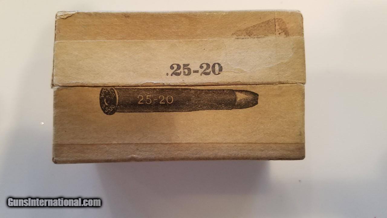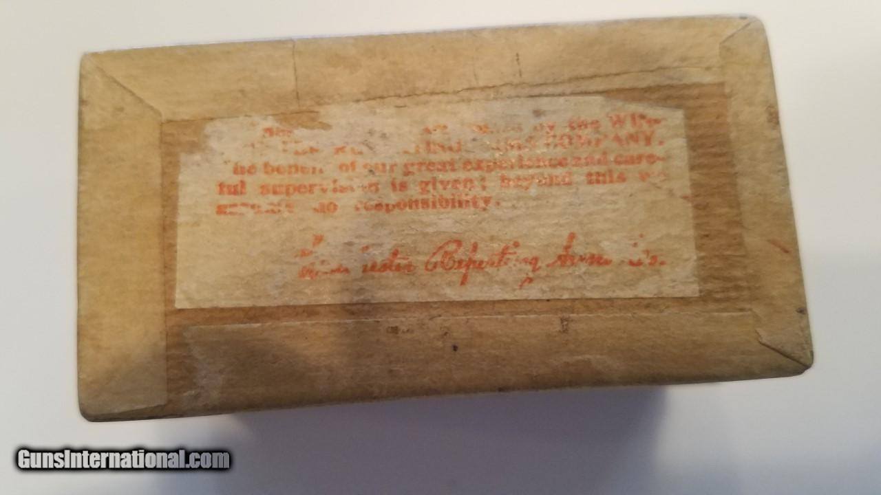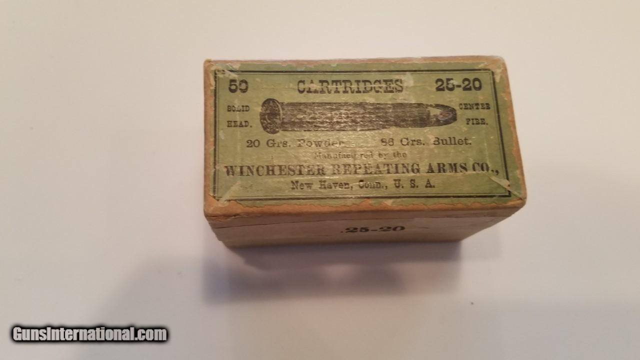 Description: A full box of Winchester 25-20 cartridges.. 2 Pc box dates to mid 1890s vintage. Has been shrink wrapped and stored for years.Box is in great condition. Cartridges have WRA headstamp. SOLD |