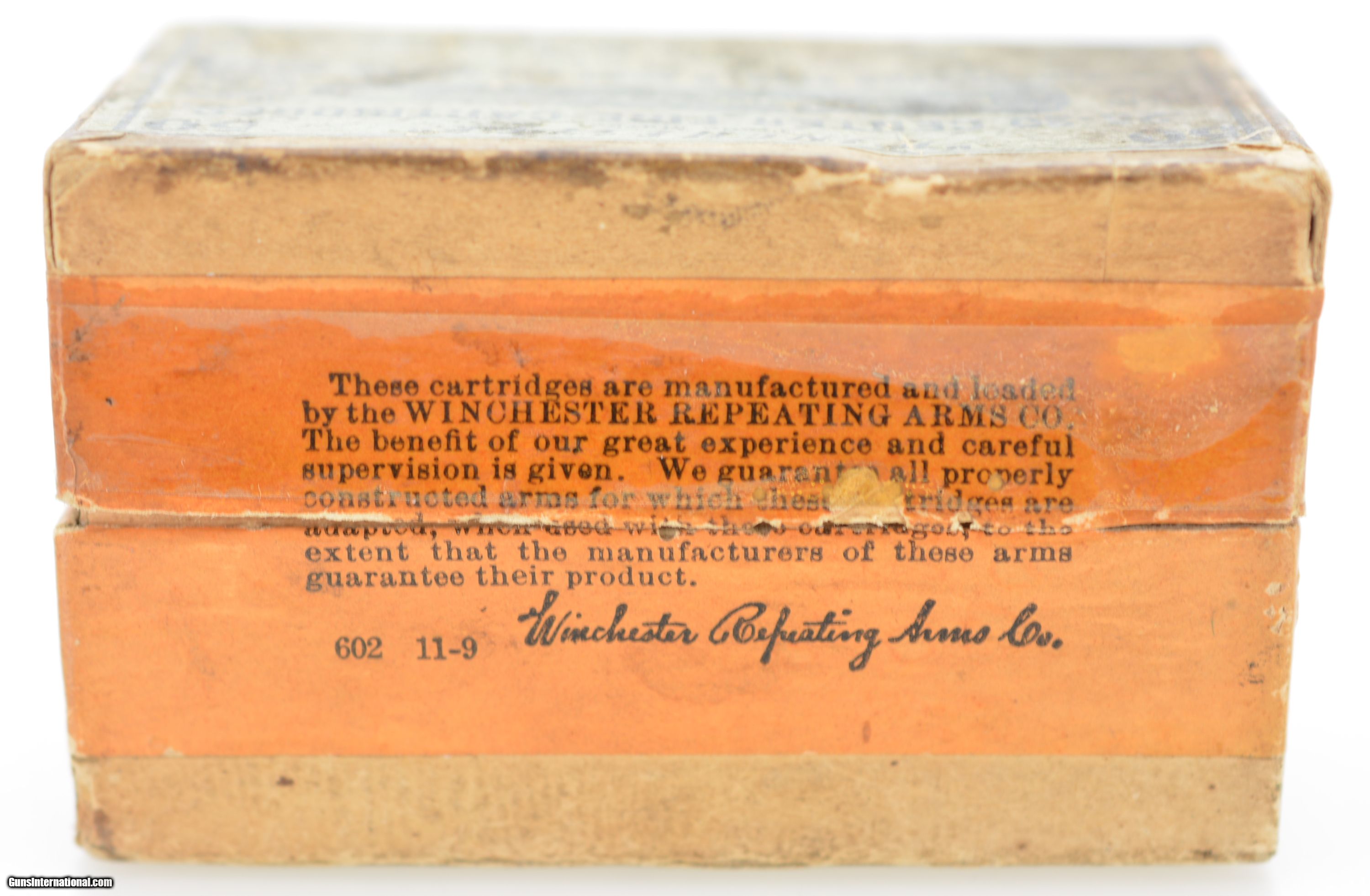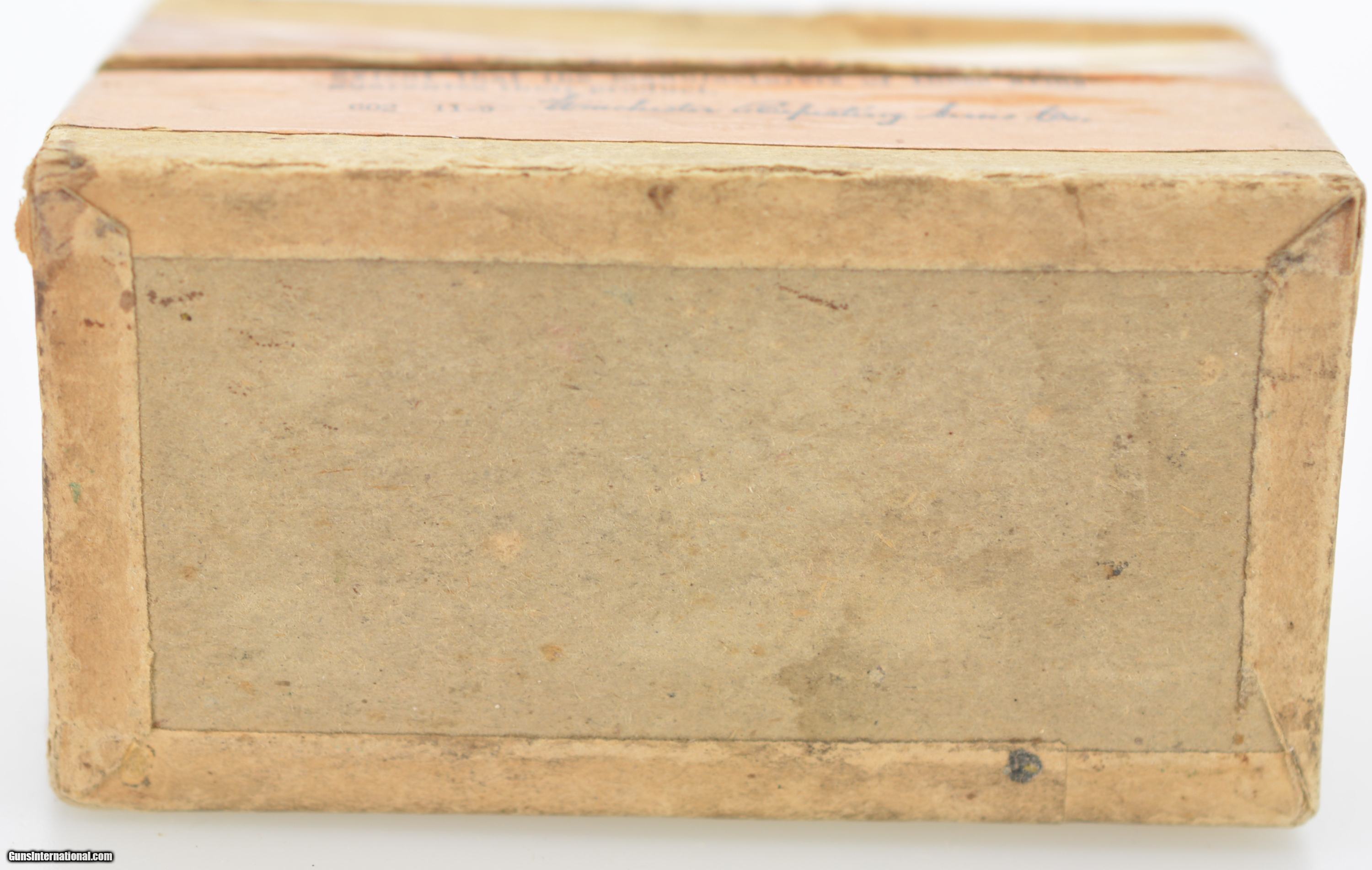 Description: This is a partial, two piece, 1910-12 period, partial box (20 rounds) of .25-20 Single Shot (.25-20 Stevens). The box is in good condition with an intact primary label showing light soiling, worn edges and old tape repair to side label and repairable seam splits on the bottom and slight indents on the top. The ammunition is excellent and appears native to the box with “W" primers and “W.R.A. Co" headstamp. SOLD Manufacturer: Winchester Caliber Info: .25-20 Gauge Info: .25-20 |