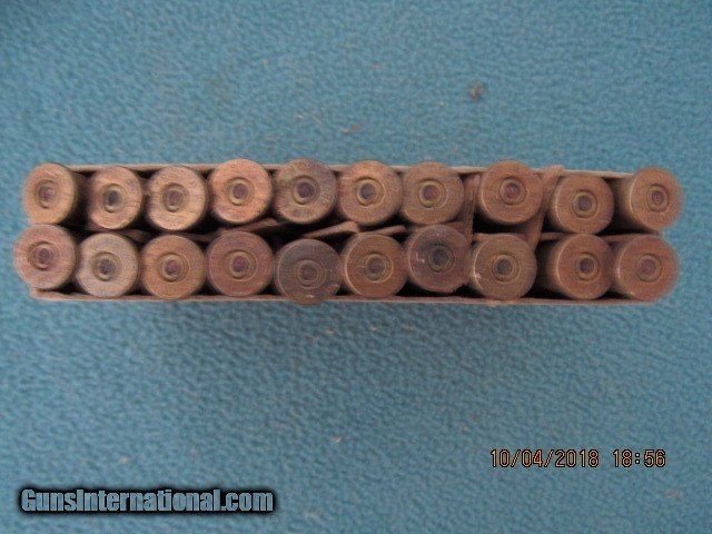 Description: Full box of the original 20 unfired rounds with matching headstamps and primers. Winchester 25-35 ammo with top label date of 8-22 design and bottom label of 12-22 design. Box shows significant staining and some wear, some tape on bottom, and peeling of the cardboard in spots of the lid. Most of the lettering remains very clear and readable. Marked "For Winchester Model 94 And Savage Rifles" Payment via money order, bank check or PayPal. Ships to US addresses only via UPS Ground. Buyer pays actual shipping cost plus $3 for packing materials. Will combine shipping for multiple ammo boxes purchased so check my other listings. Please be sure this is legal for you to purchase and own; must have copy of photo ID included with payment. SOLD |