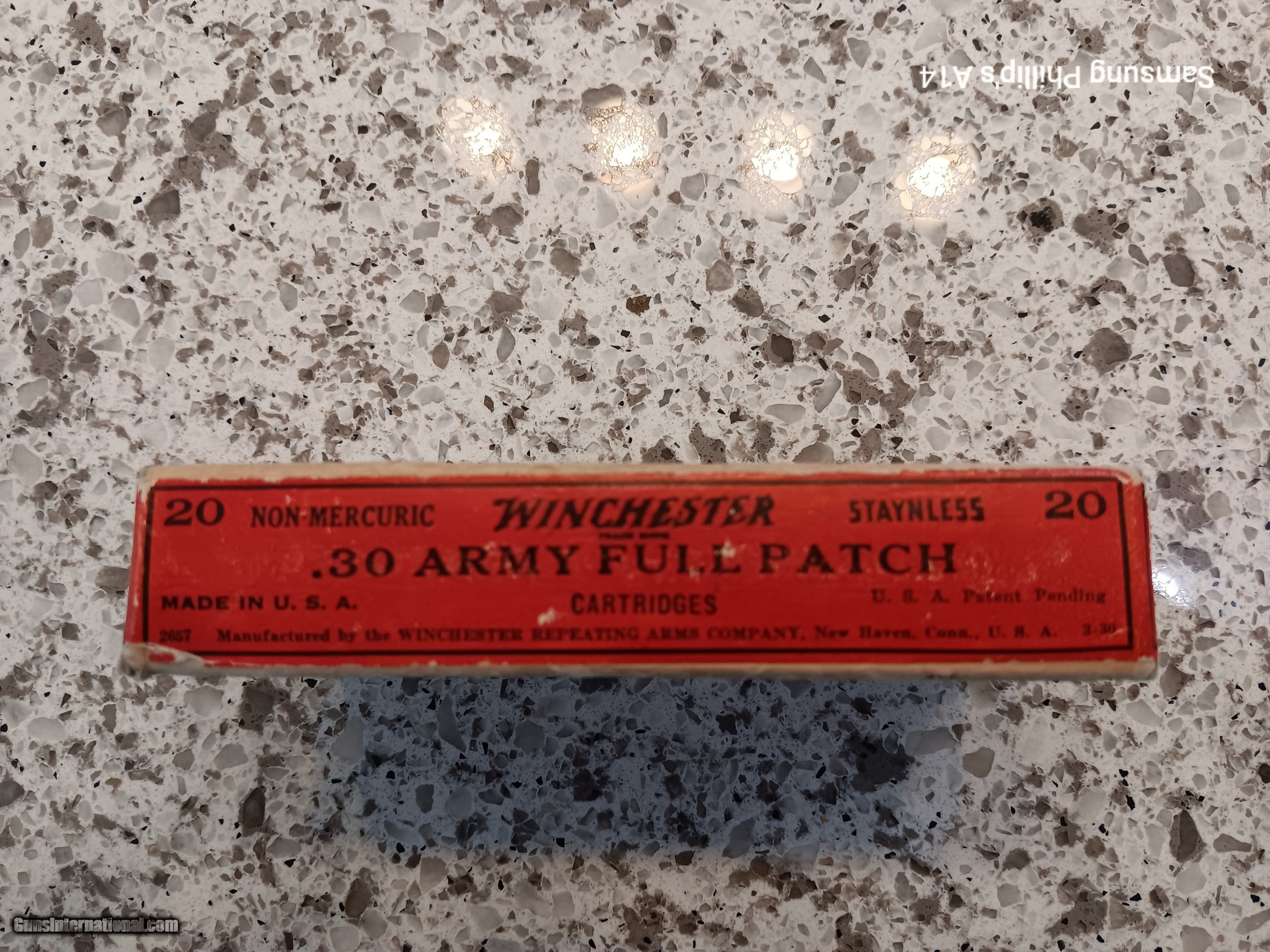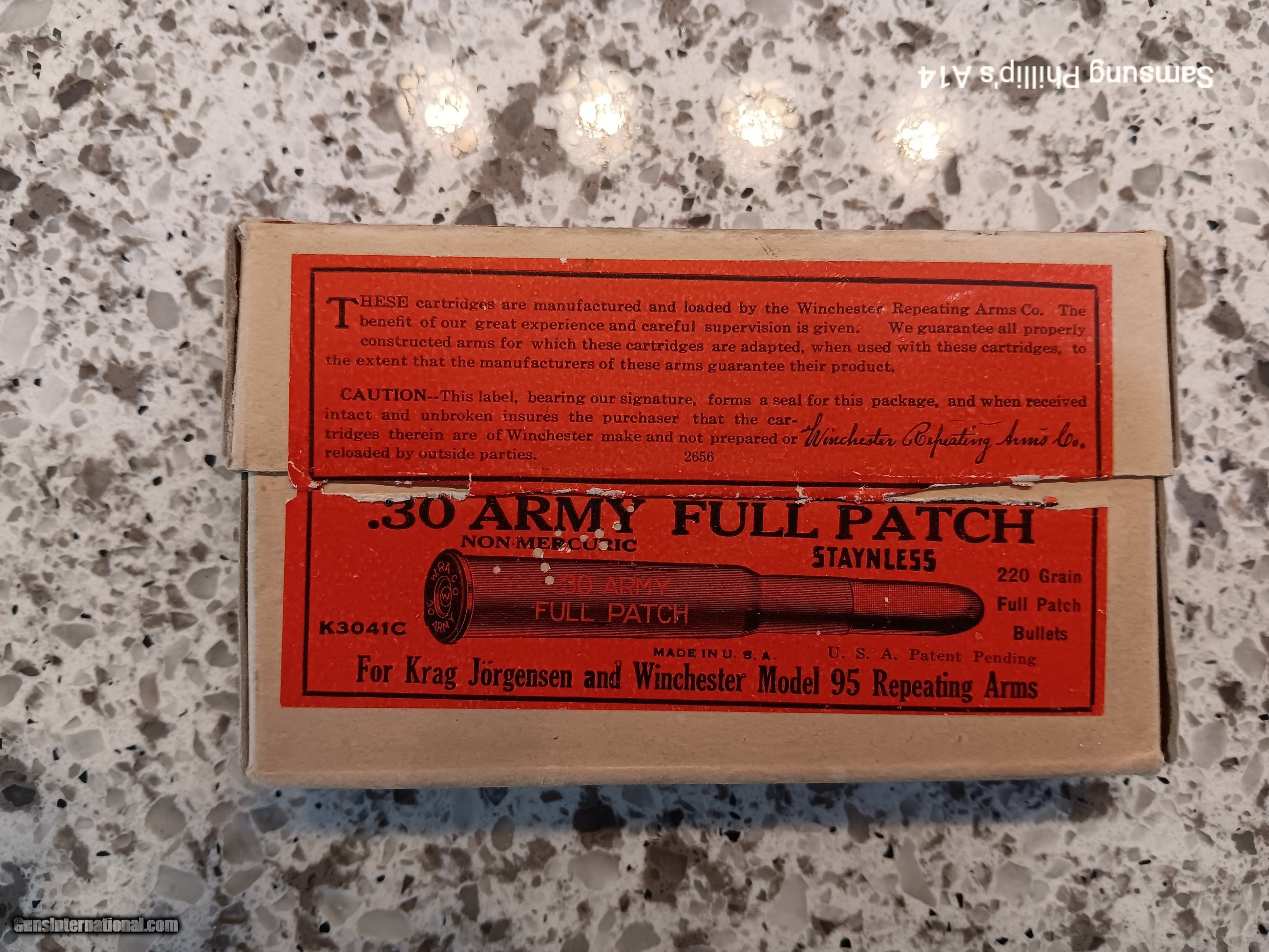 Description: Winchester 30-40 KRAG ammo. FULL PATCH BULLETS in great two piece box. 220gr stainless BULLETS. BOX AND LABELS ARE IN GREAT CONDITION. These cartridges are designed for the krag jorgensen and the winchesters model 95 rifles. BUYER PAYS SHIPPING SOLD Rifle Caliber: .30-40 Krag |
