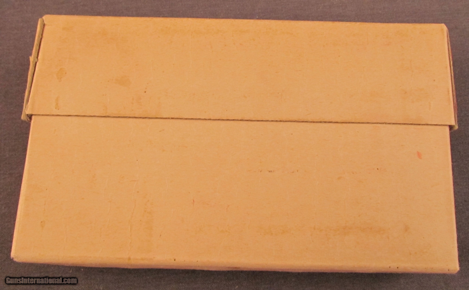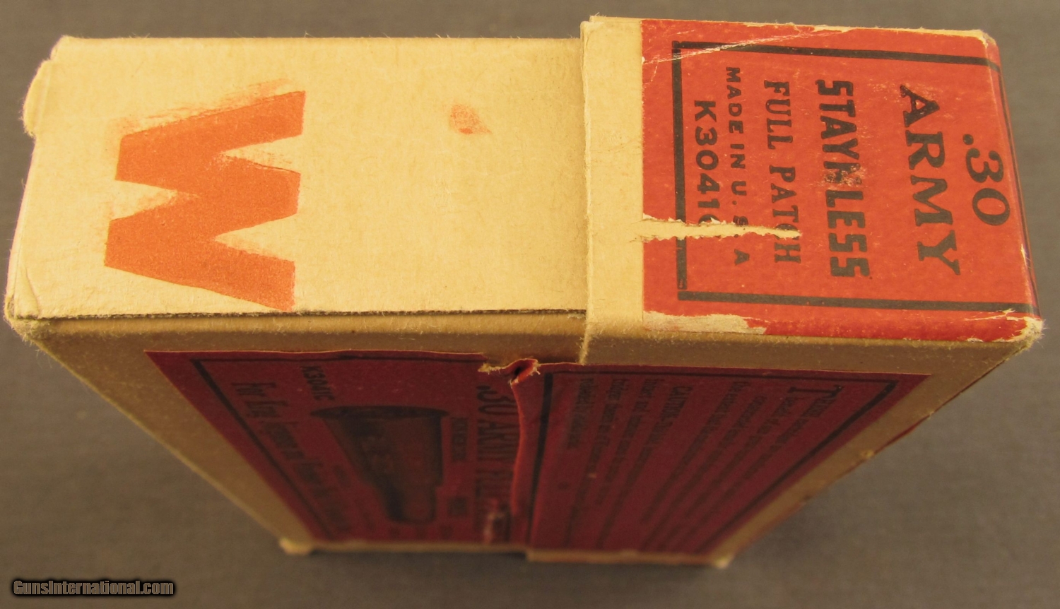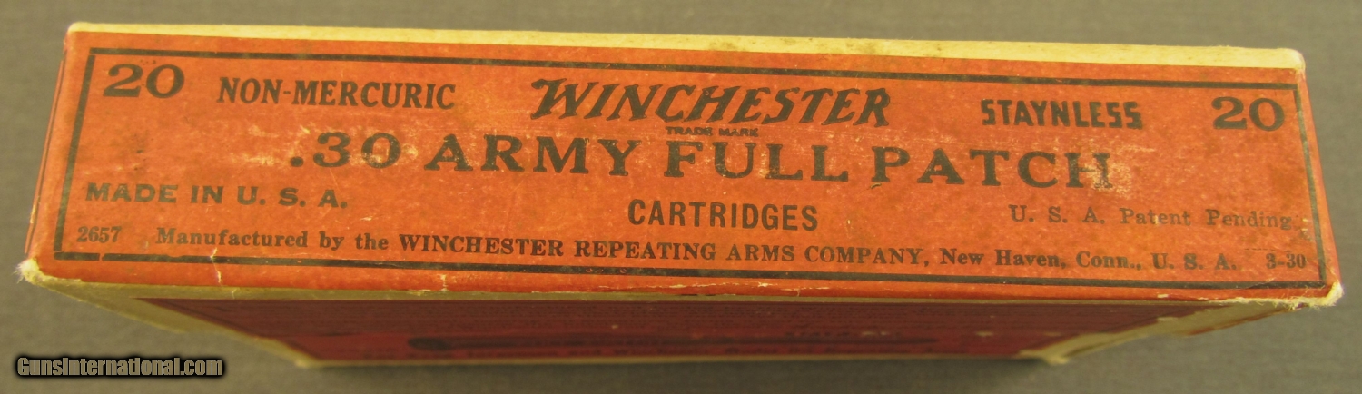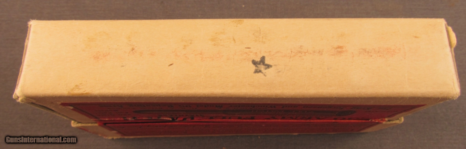 Description: This full sealed two piece box of 30 Army full patch remains in excellent condition with very little shelf wear and bright labels. Front label shows holes from a Cummings Cryptograph Machine. A very clean Winchester full patch box. SOLD Manufacturer: Winchester Model: Ammo Caliber Info: .30-40 Krag Gauge Info: .30-40 Krag |