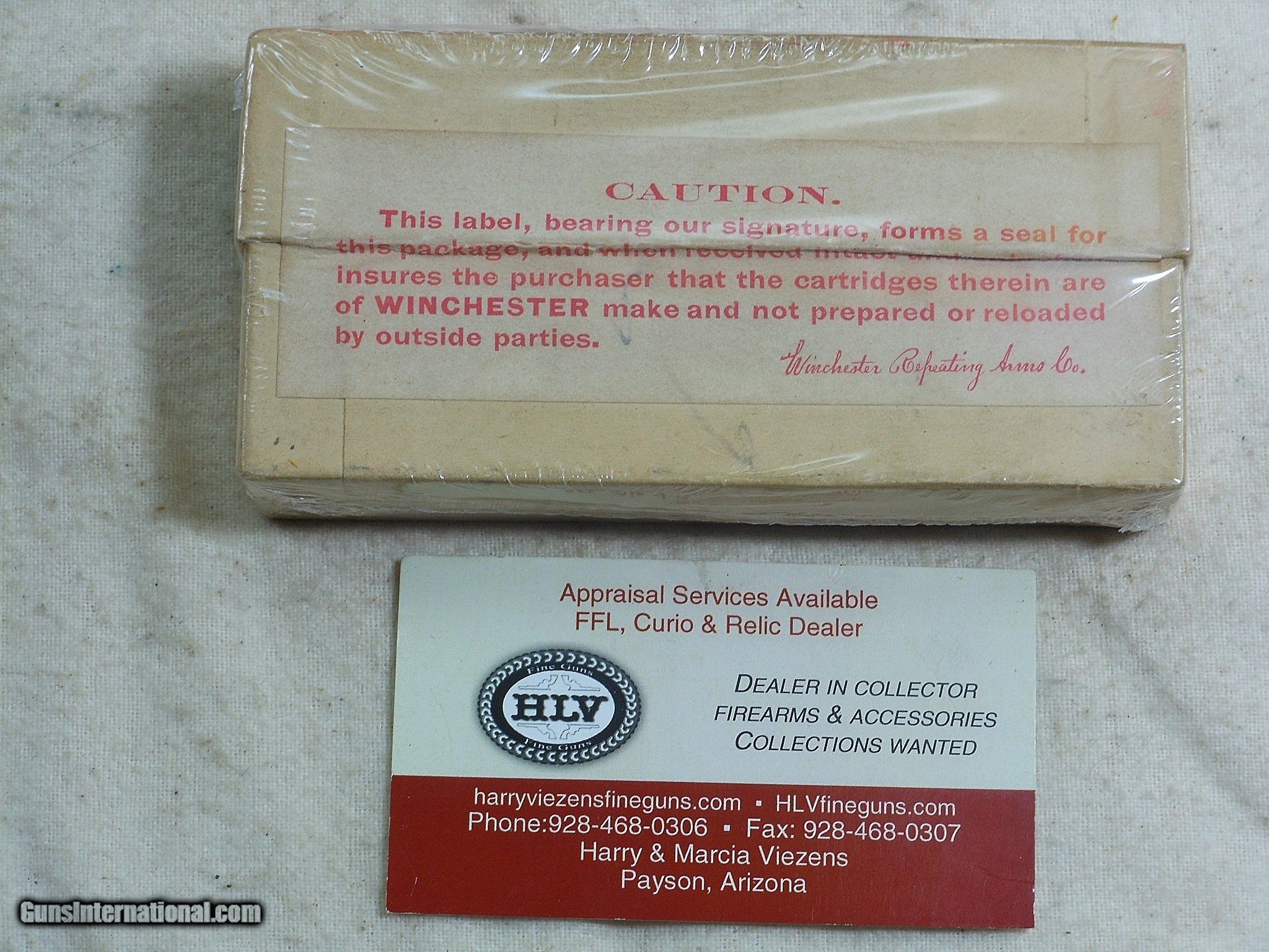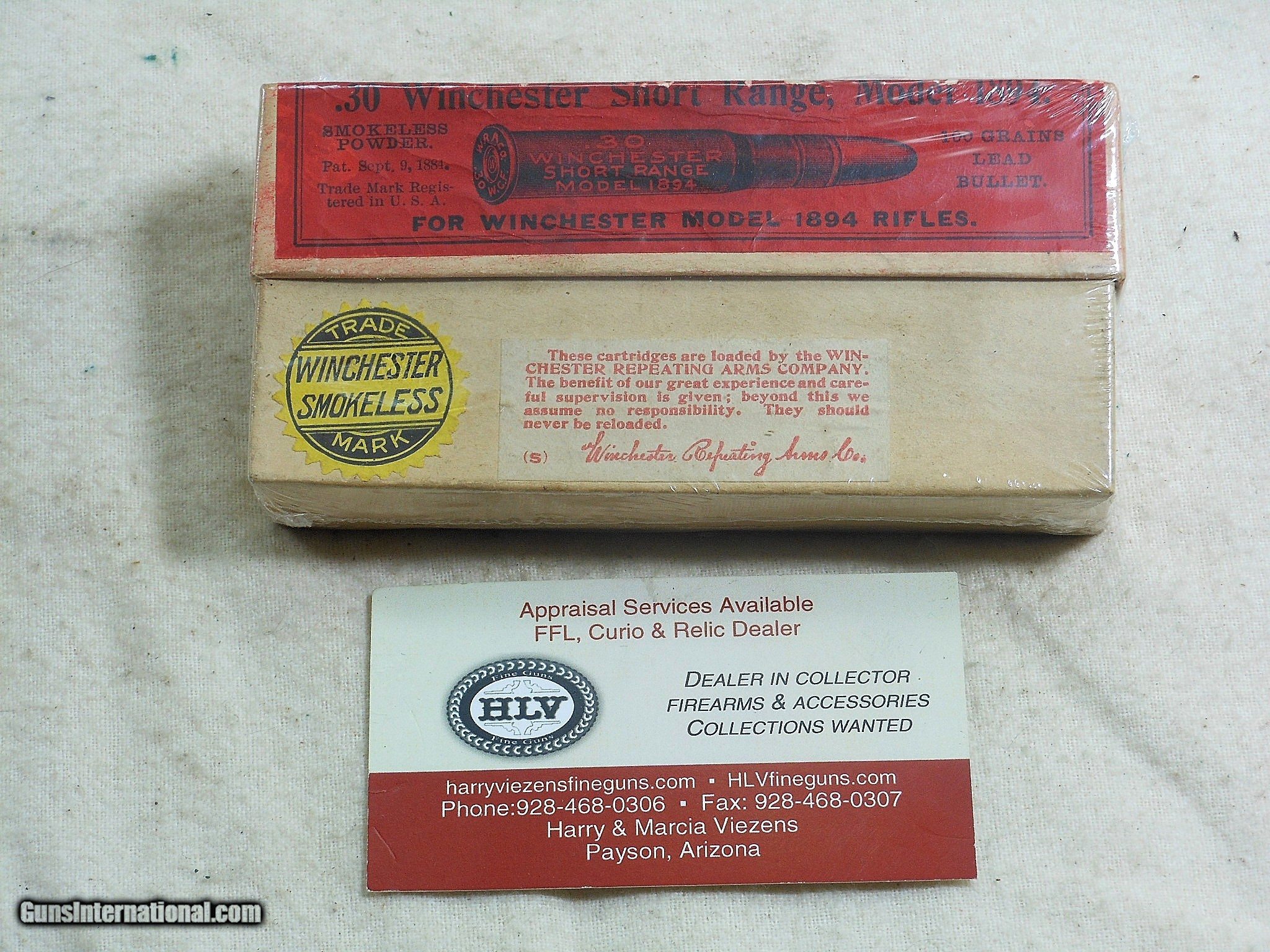 Description: This is a full sealed box of original shells. It has the yellow Sun Burst Label on the front. The label states that the loading is for the Model 1894 rifles. The bullet is the 100 grain lead bullet. This box is in near minty condition. The The labels and graphics are bright and new looking. The square cornered box is in like new condition. This is a rare loading for the 30 W.C.F. (30-30 Winchester). To find a early box in this fine of condition is a rare find! Here is one of the nicest! Search for hlvfineguns on google for more details BCC (10) F. No. 572 -21 SOLD Rifle Caliber: .30-30 Winchester |