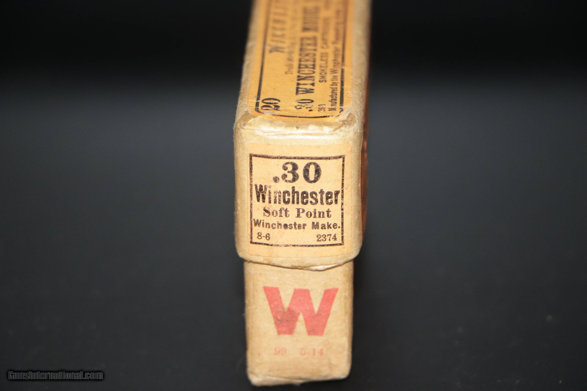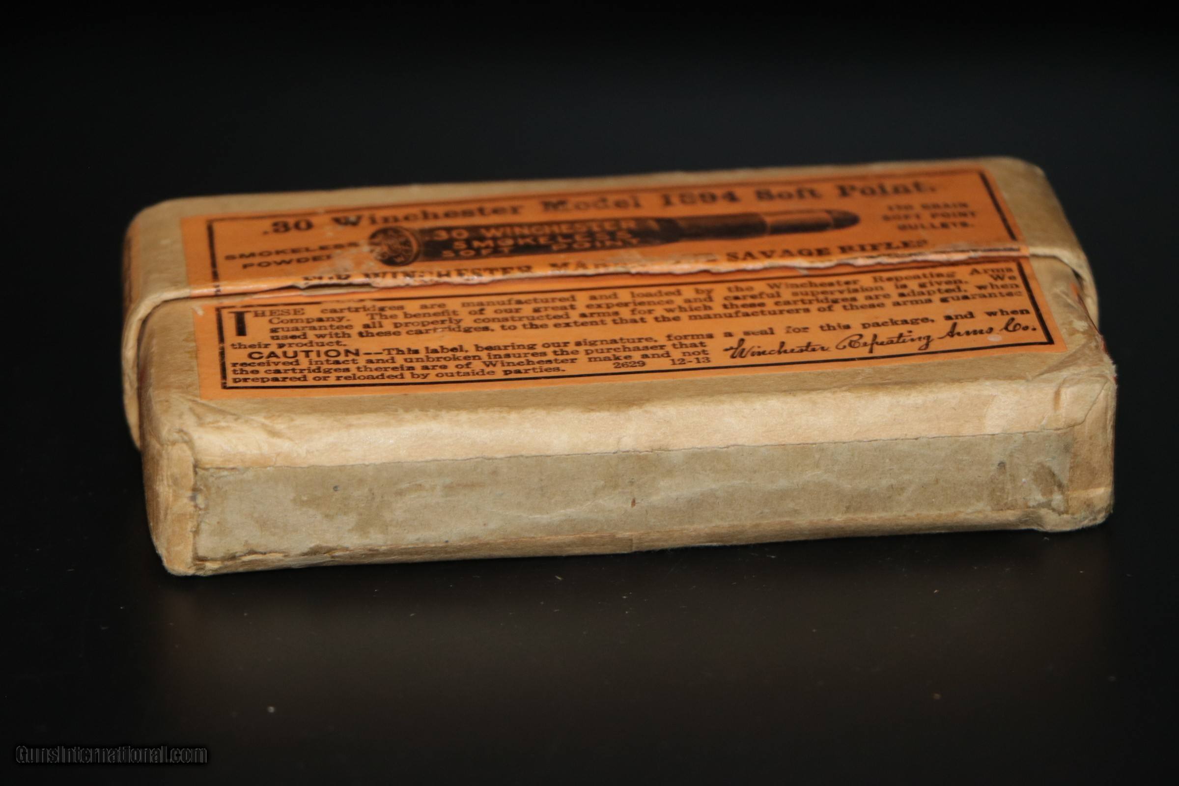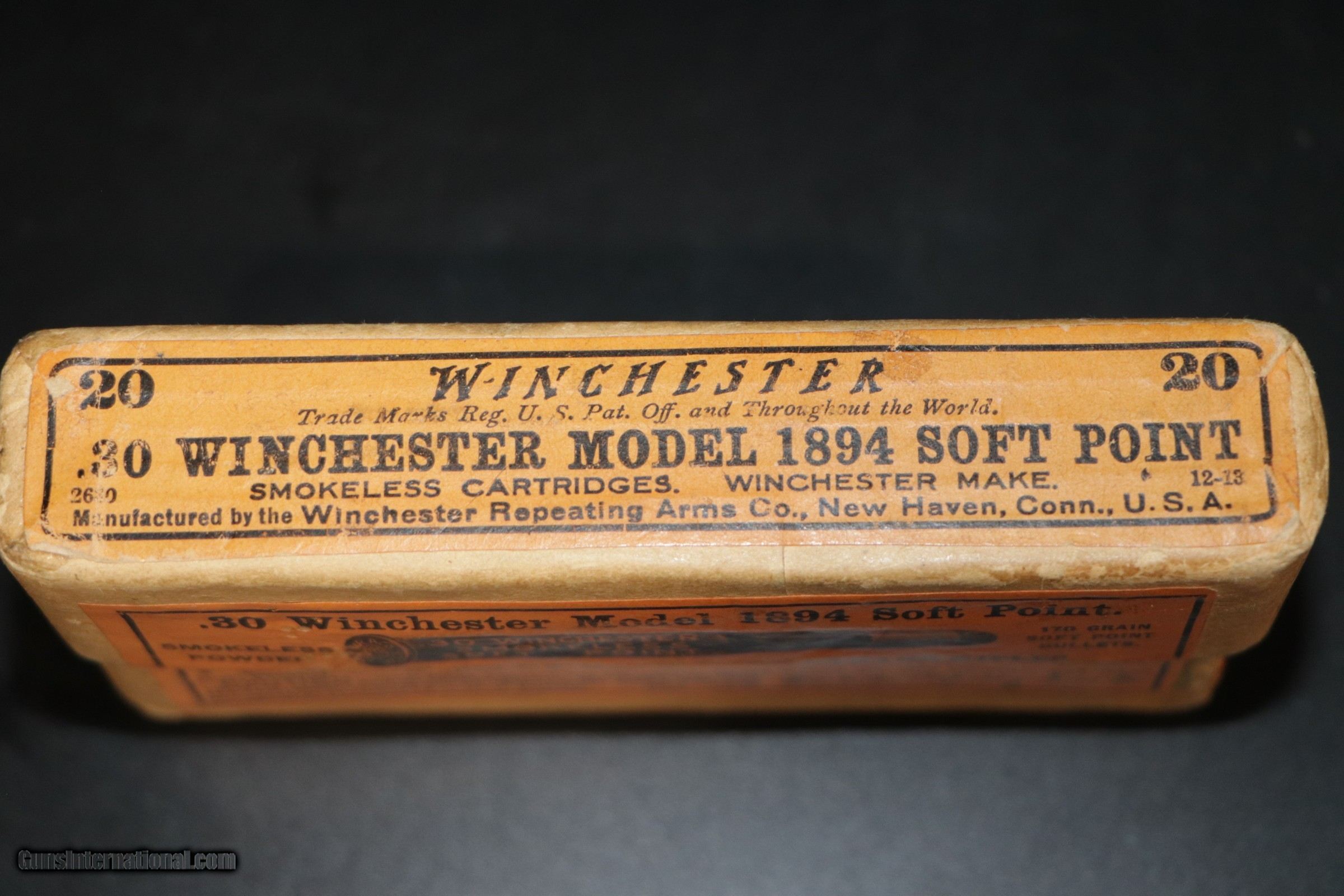 Description: Winchester 2-Piece, .30 (30-30), Smokeless Powder, 170 Gr. Soft Point Bullets, Full box with orange label. Box is solid with light age soiling and edge wear. Cartridges appear to be native to the box - Ammo VG-Exc. Add $14.50 S+H SOLD Rifle Caliber: .30-30 Winchester |