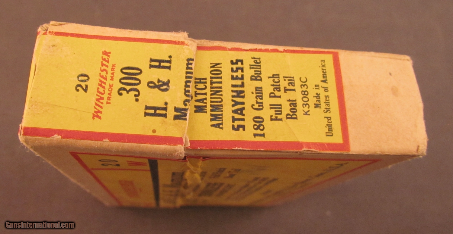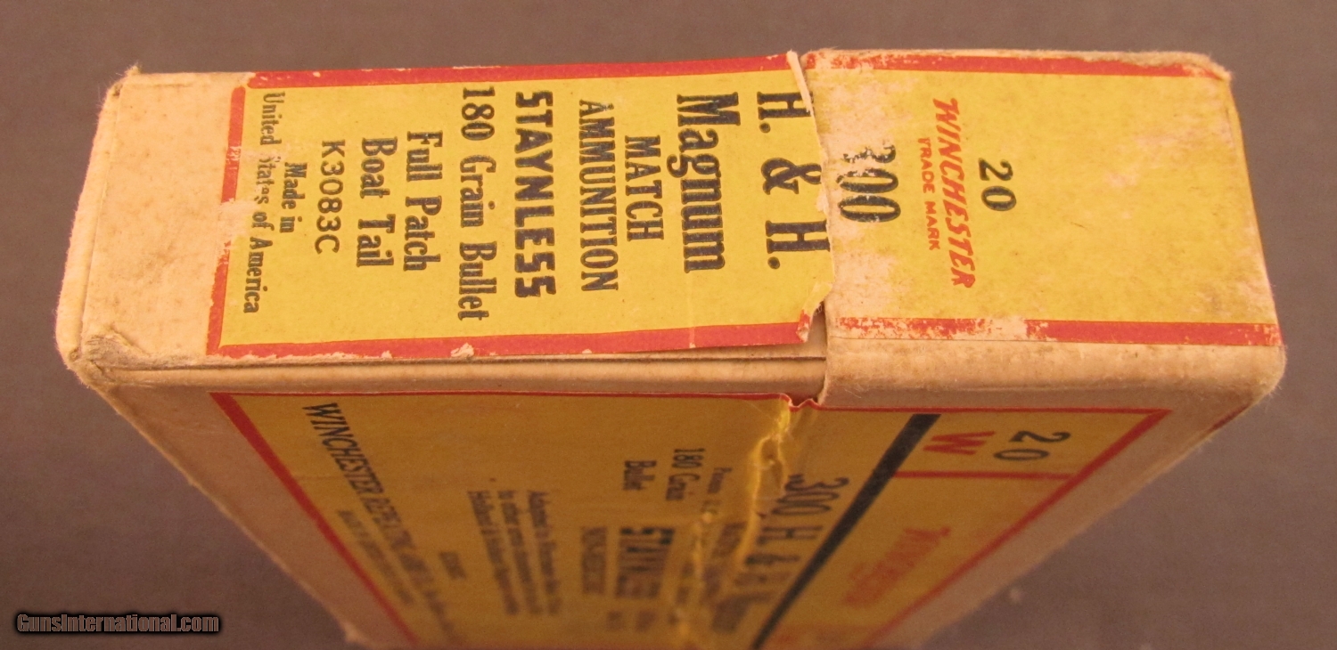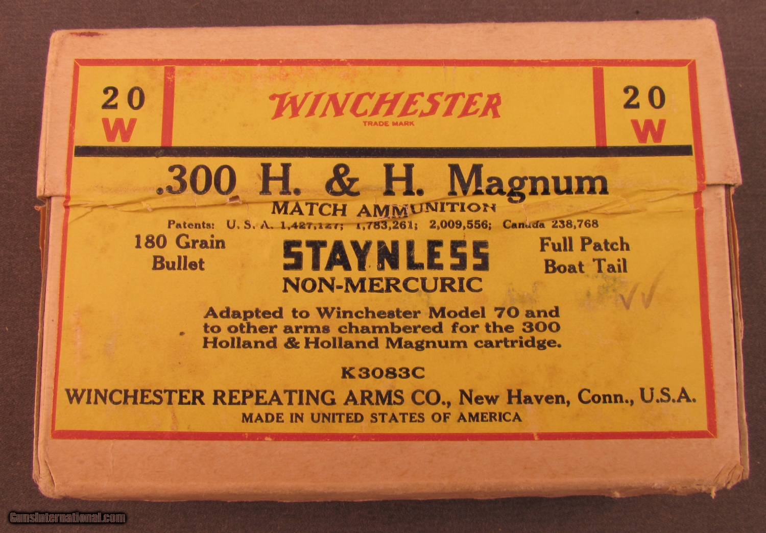 Description: This full sealed 20 round two piece box has a Winchester label but it was made at Western's East Action facility before WWII. Box shows light soiling and side labels have broken from the box top moving. Box bottom has a couple holes from bullet points peeking out. This is the only two piece box made in this caliber. The primers in this load are stainless non-mercuric, however post war boxes used Mercuric primers for more reliable and consistent ignition. SOLD Manufacturer: Winchester Model: Ammo Caliber Info: .300 H&H Gauge Info: .300 H&H |