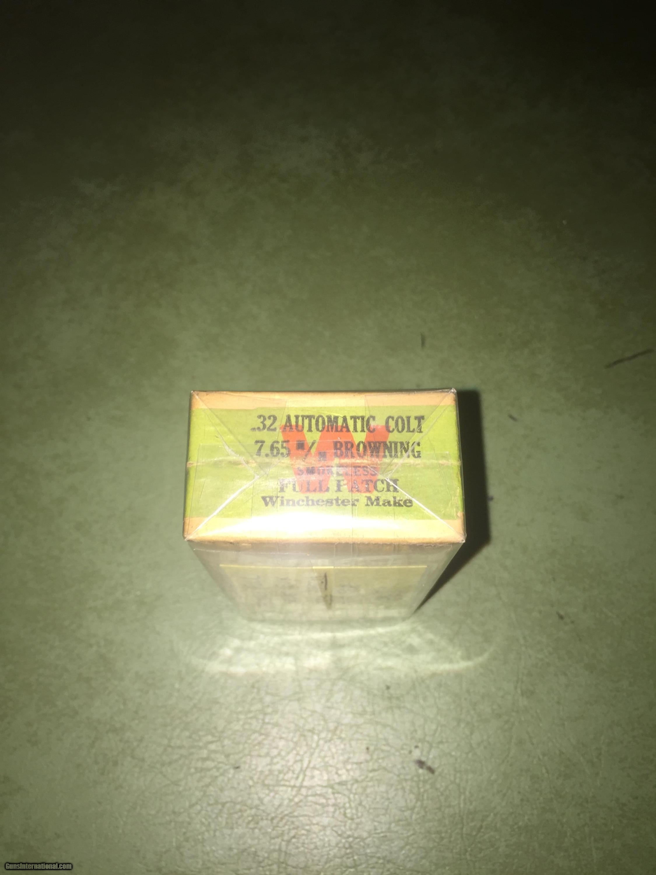 Description: Very nice two piece Winchester box in .32cal Colt automatic full patch. This box has very nice color and is dated 12-19 and factory full! has been opened before at the seam but is a very clean cut there. SOLD |