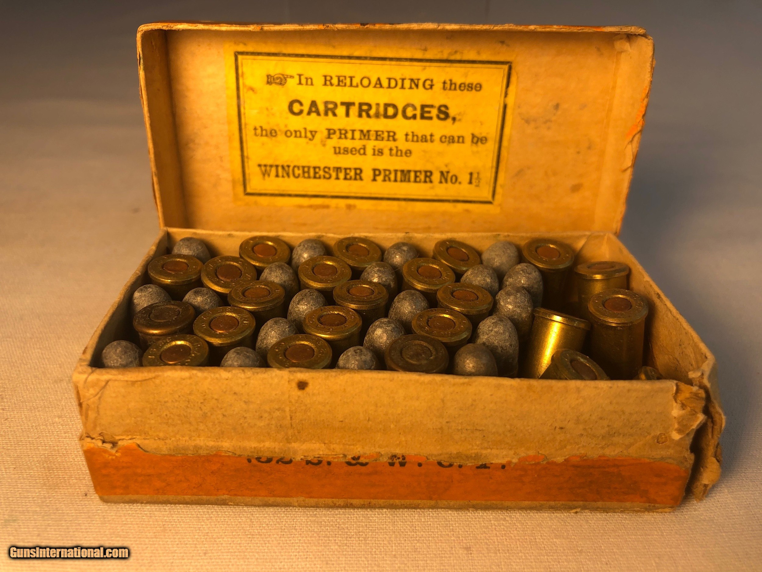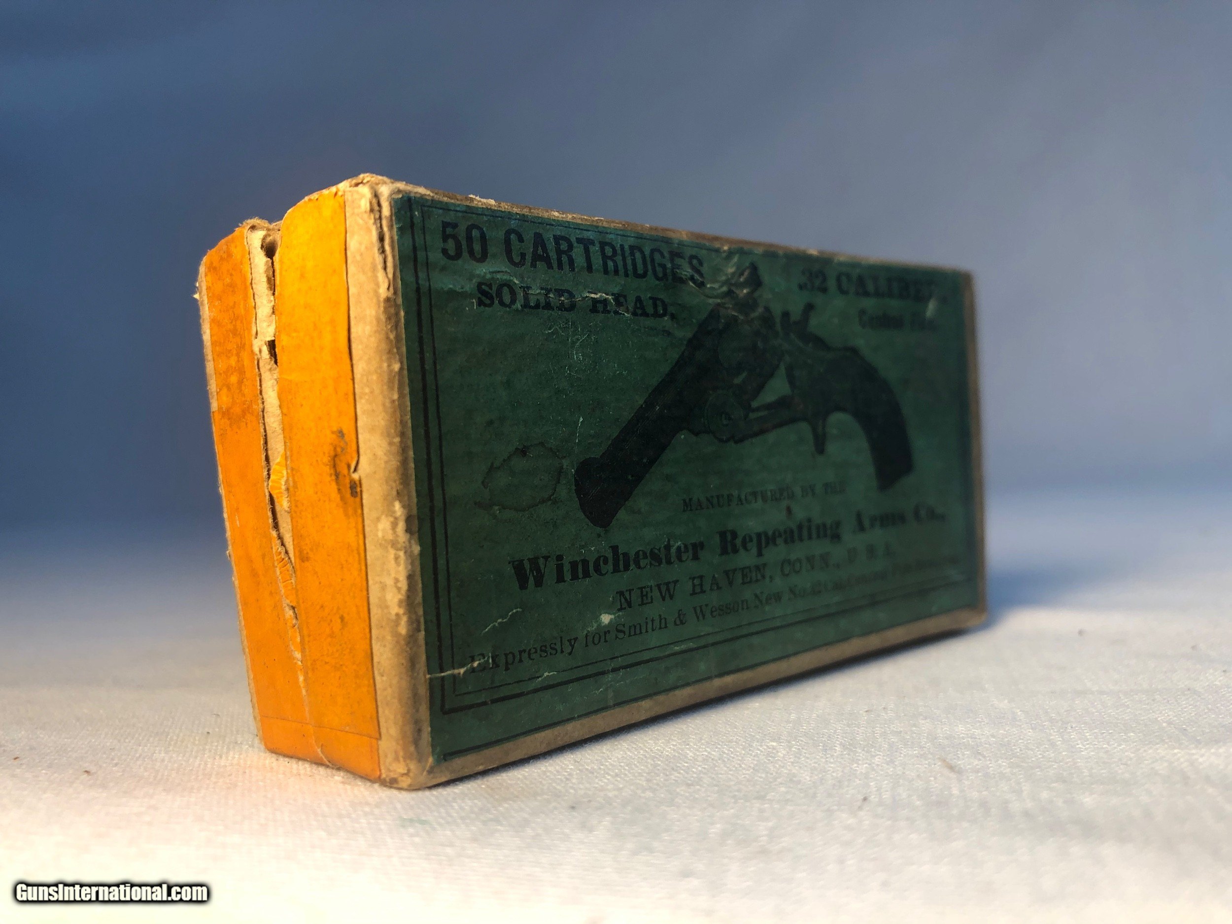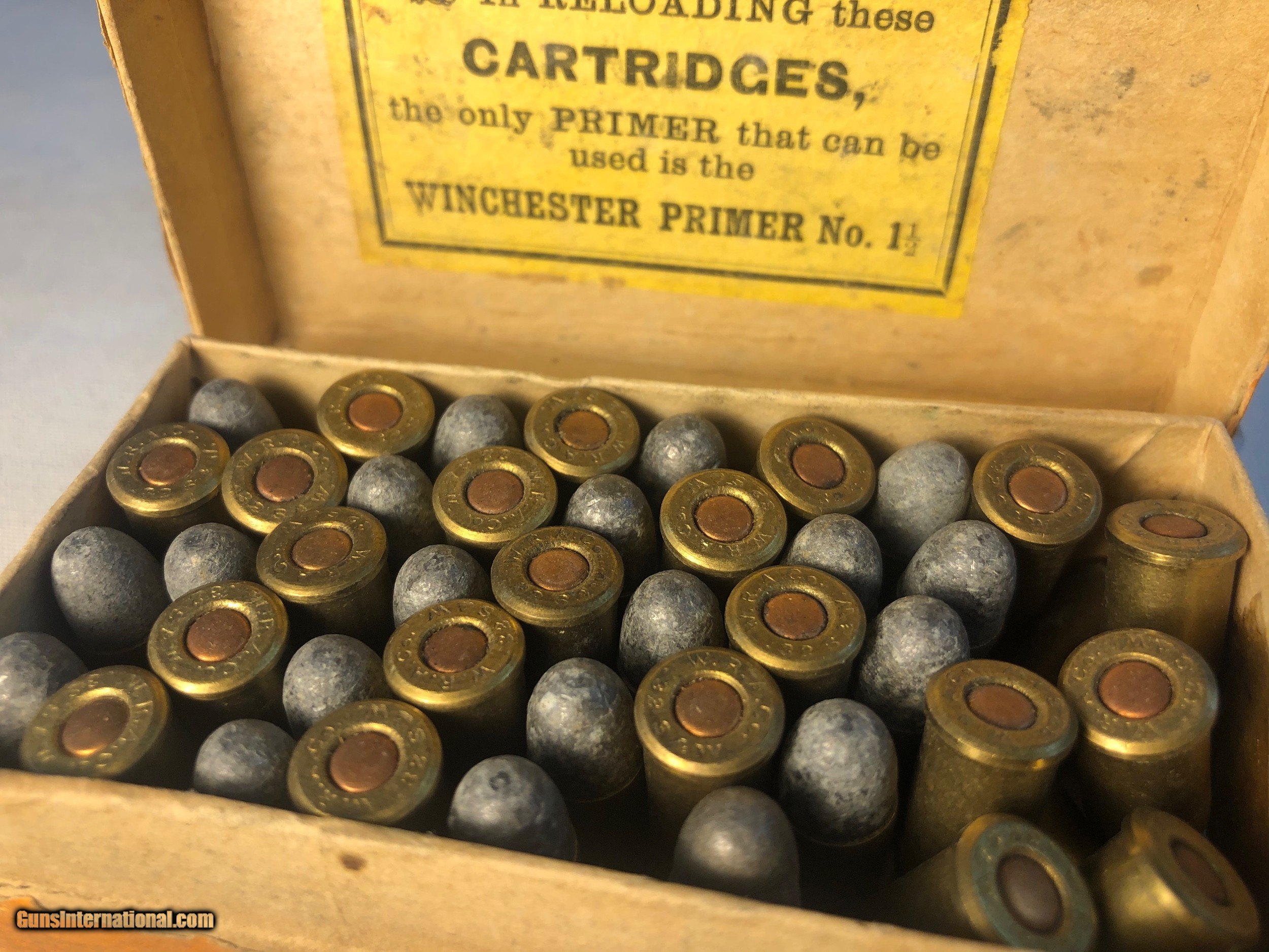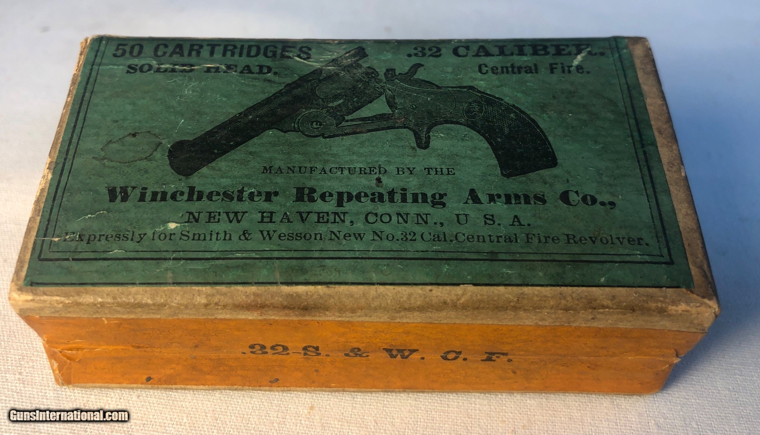 Description: This box of Winchester 32 caliber central fire were made expressly for Smith & Wesson 32 caliber center fire revolvers. The box contains 43 rounds of .32 caliber cartridges stamped 'WRA Co, S&W 32' The box condition is good condition except for one corner that isnt intact. The labeling along the back side of the box has never been split (See Photos) Ground shipping and handling cost is extra to the lower 48 states. (Except no ship to CA and NJ) This ammunition is sold as a collectors item only and we make no quarantees to its quality or functionality. Please know and abide by your local laws in regards to purchasing ammunition. Signature required upon delivery. We accept Master Card and Visa, personal check, or money order. SOLD |