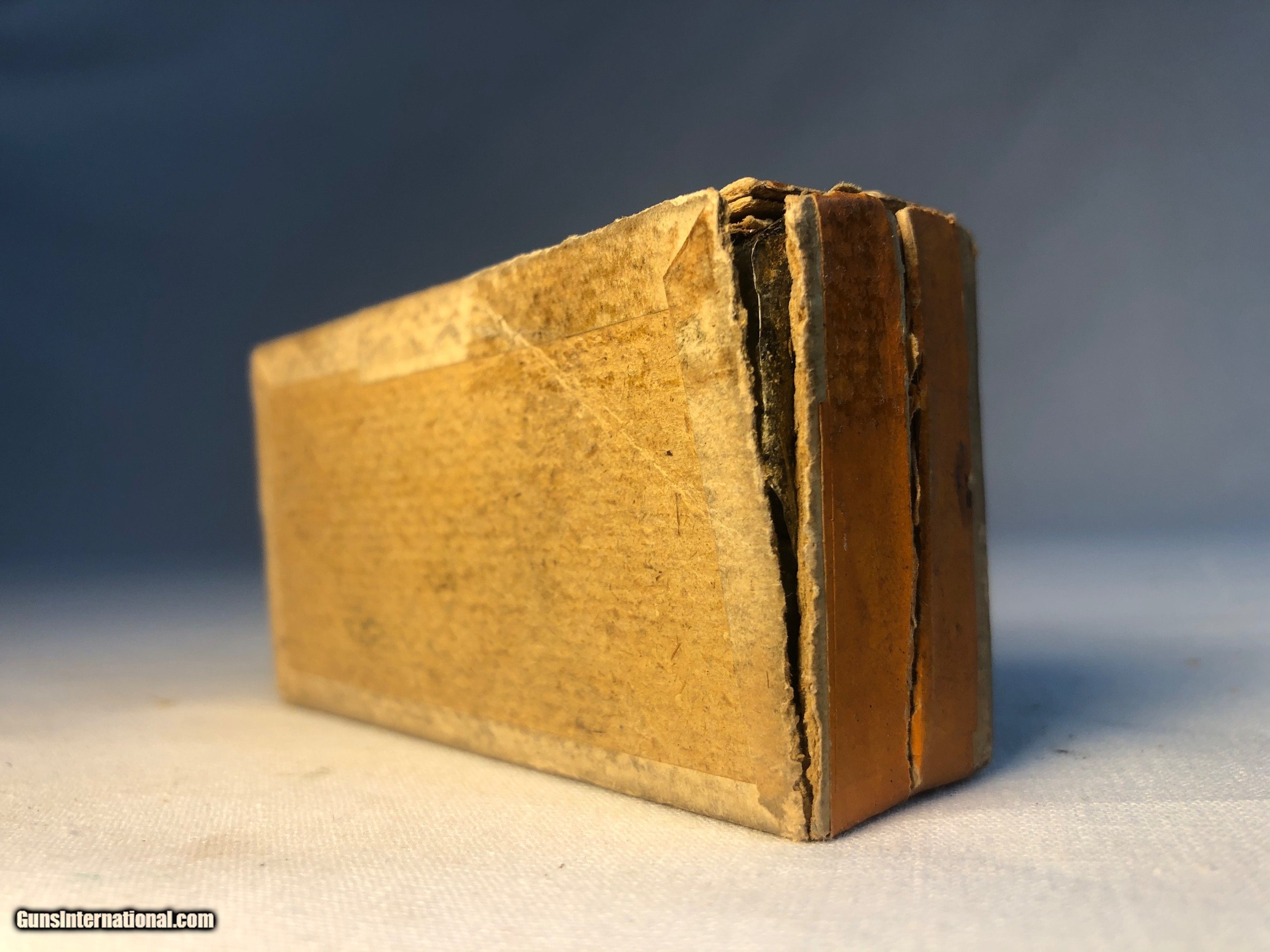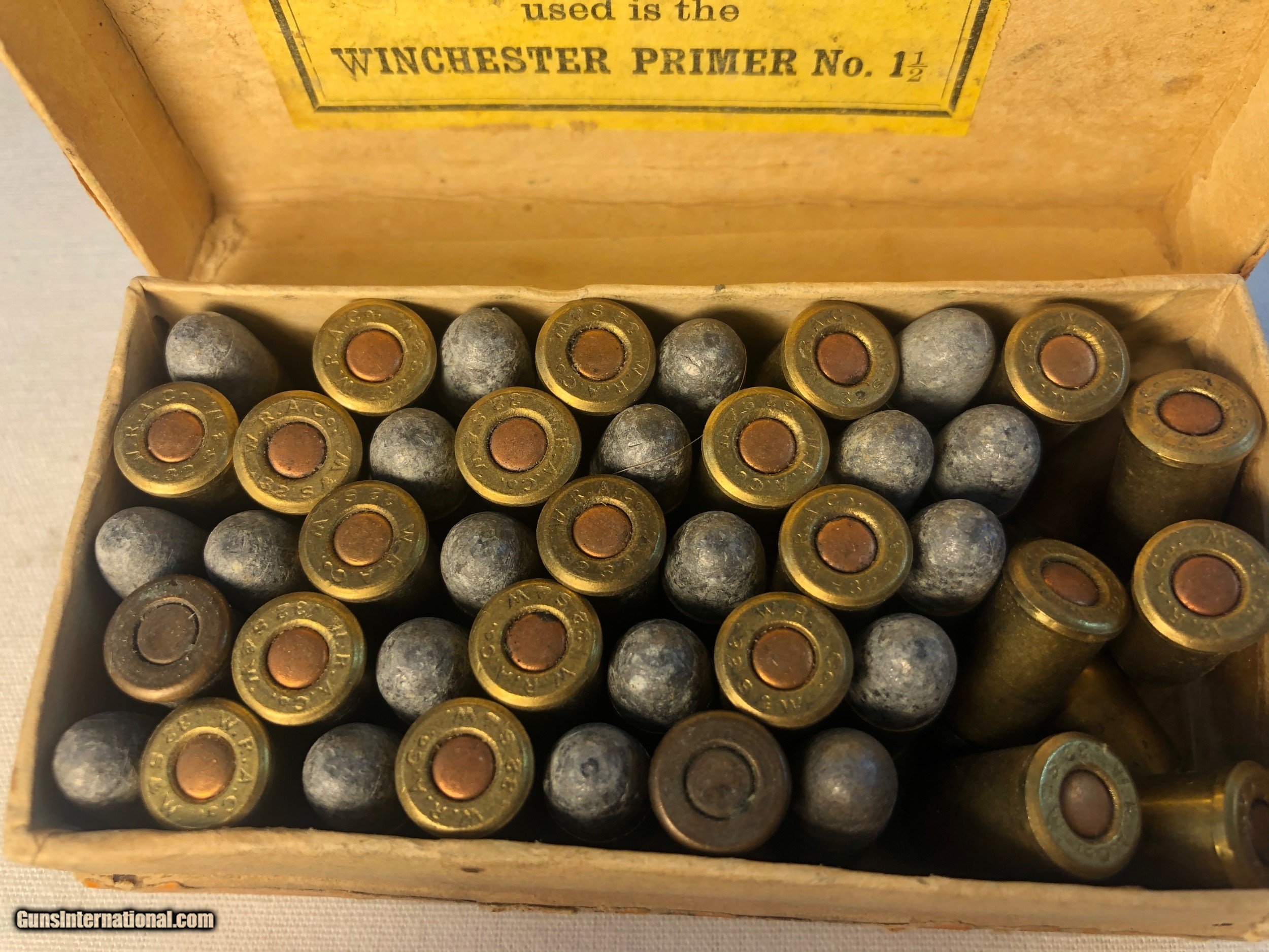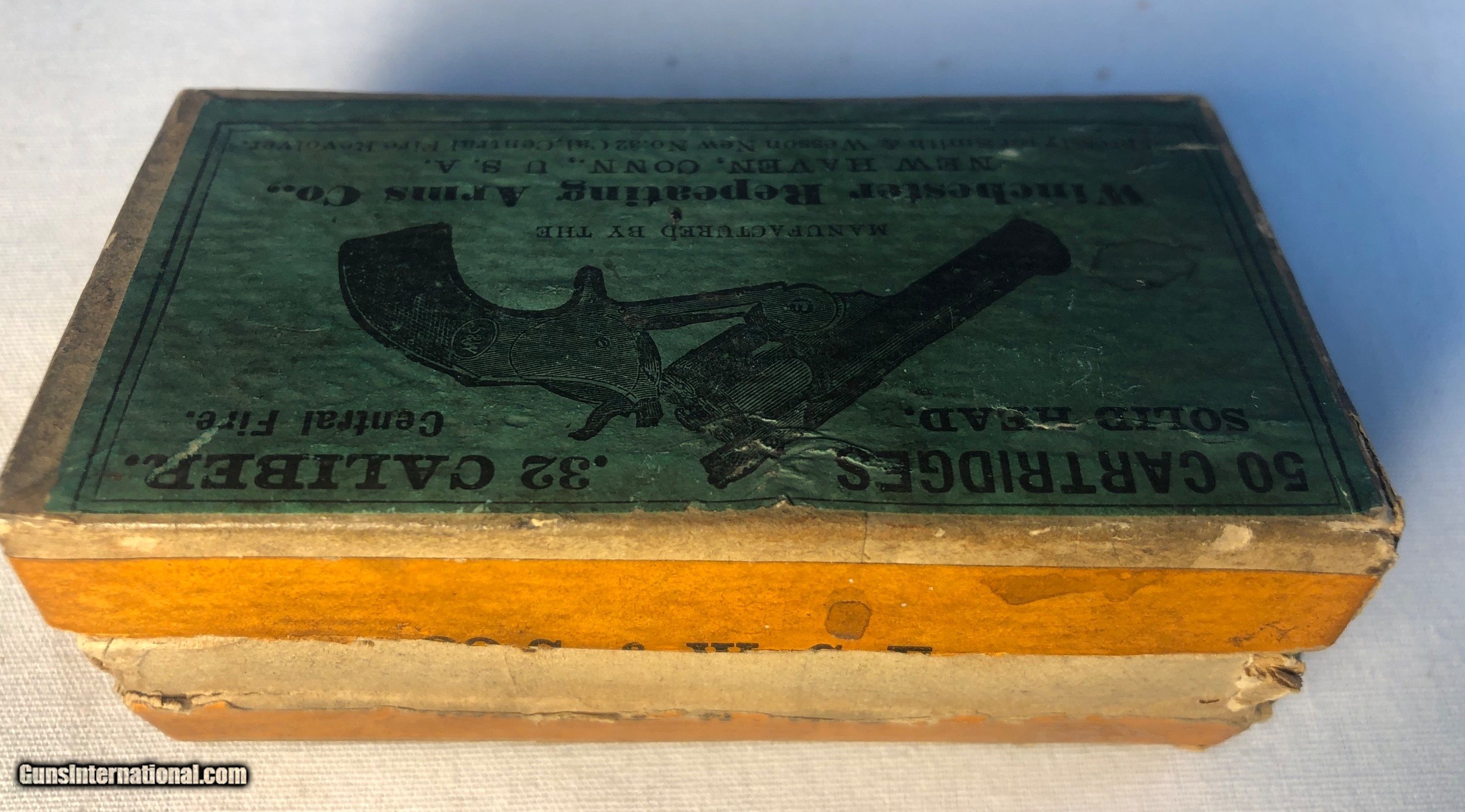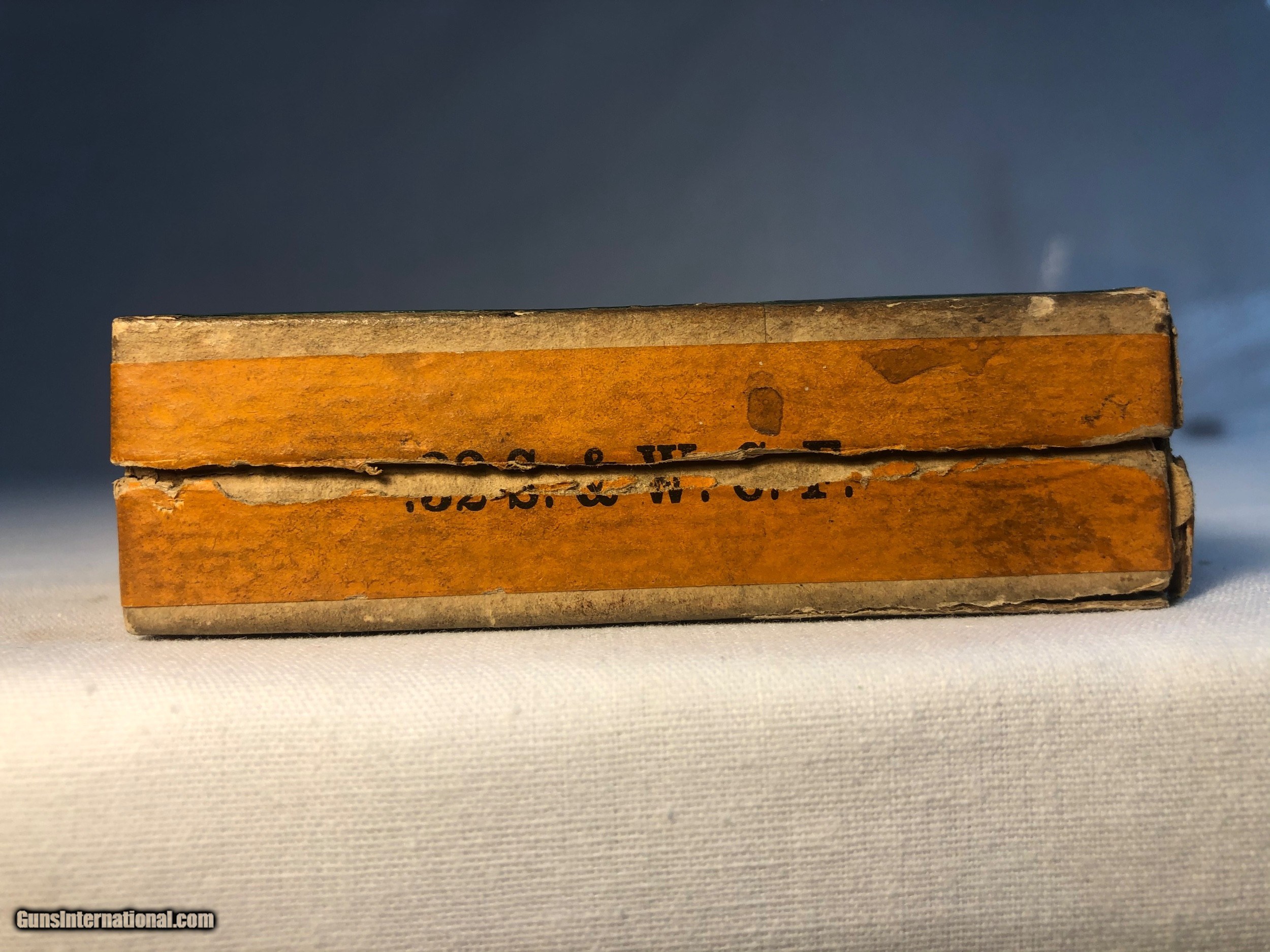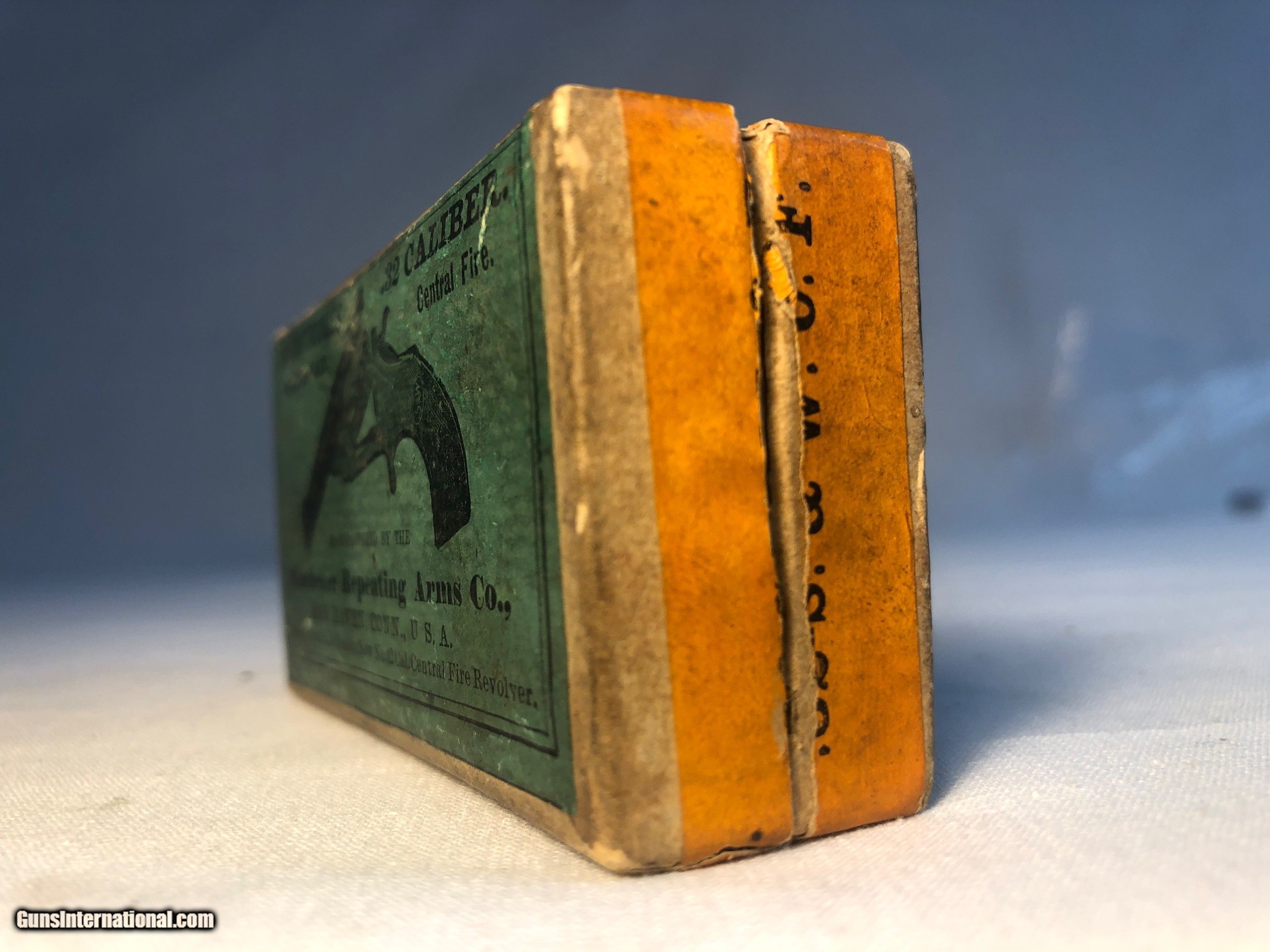 Description: This box of Winchester 32 caliber central fire were made expressly for Smith & Wesson 32 caliber center fire revolvers. The box contains 43 rounds of .32 caliber cartridges stamped 'WRA Co, S&W 32' The box condition is good condition except for one corner that isnt intact. The labeling along the back side of the box has never been split (See Photos) Ground shipping and handling cost is extra to the lower 48 states. (Except no ship to CA and NJ) This ammunition is sold as a collectors item only and we make no quarantees to its quality or functionality. Please know and abide by your local laws in regards to purchasing ammunition. Signature required upon delivery. We accept Master Card and Visa, personal check, or money order. SOLD |