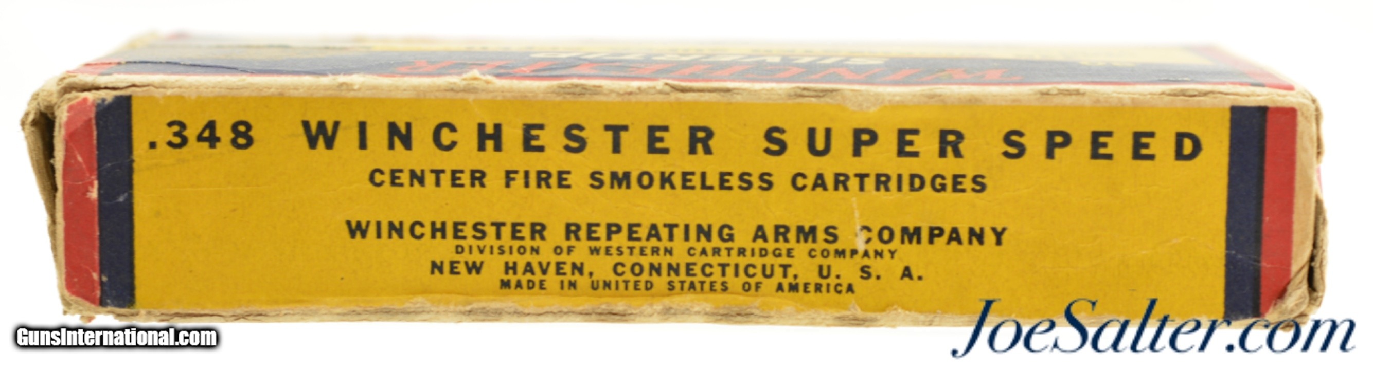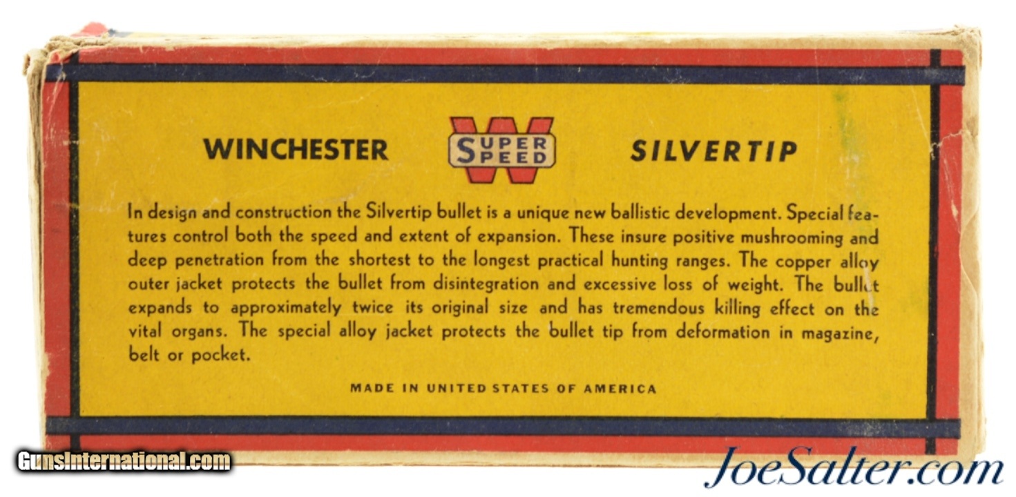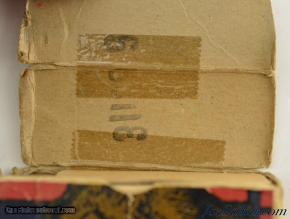Description: This is a full box, 20 original rounds, of .348 Winchester ammunition manufactured by Winchester starting in January of 1940 with 250 grain Super Speed, Silvertip bullets. The one piece box has excellent color and graphics with the box having old tape repairs to the flaps with corner and edge wear and with a small bit of seam separation on the outer edges. The cartridges are in excellent condition with a few showing some verdigris around the primers. A desirable "Grizzly Bear" box in a very desirable caliber perfect to display with your model 71. SOLD |