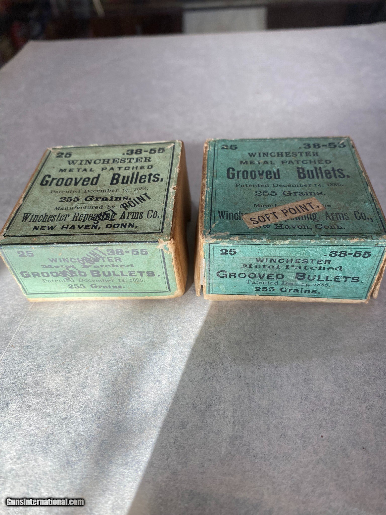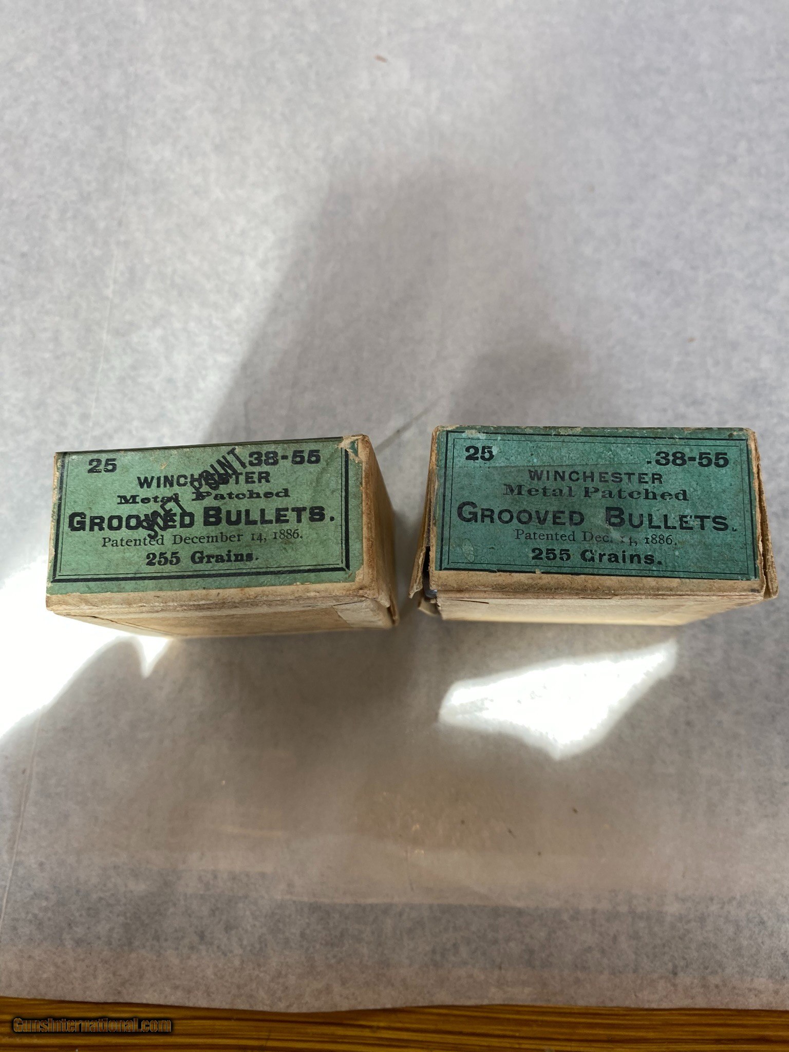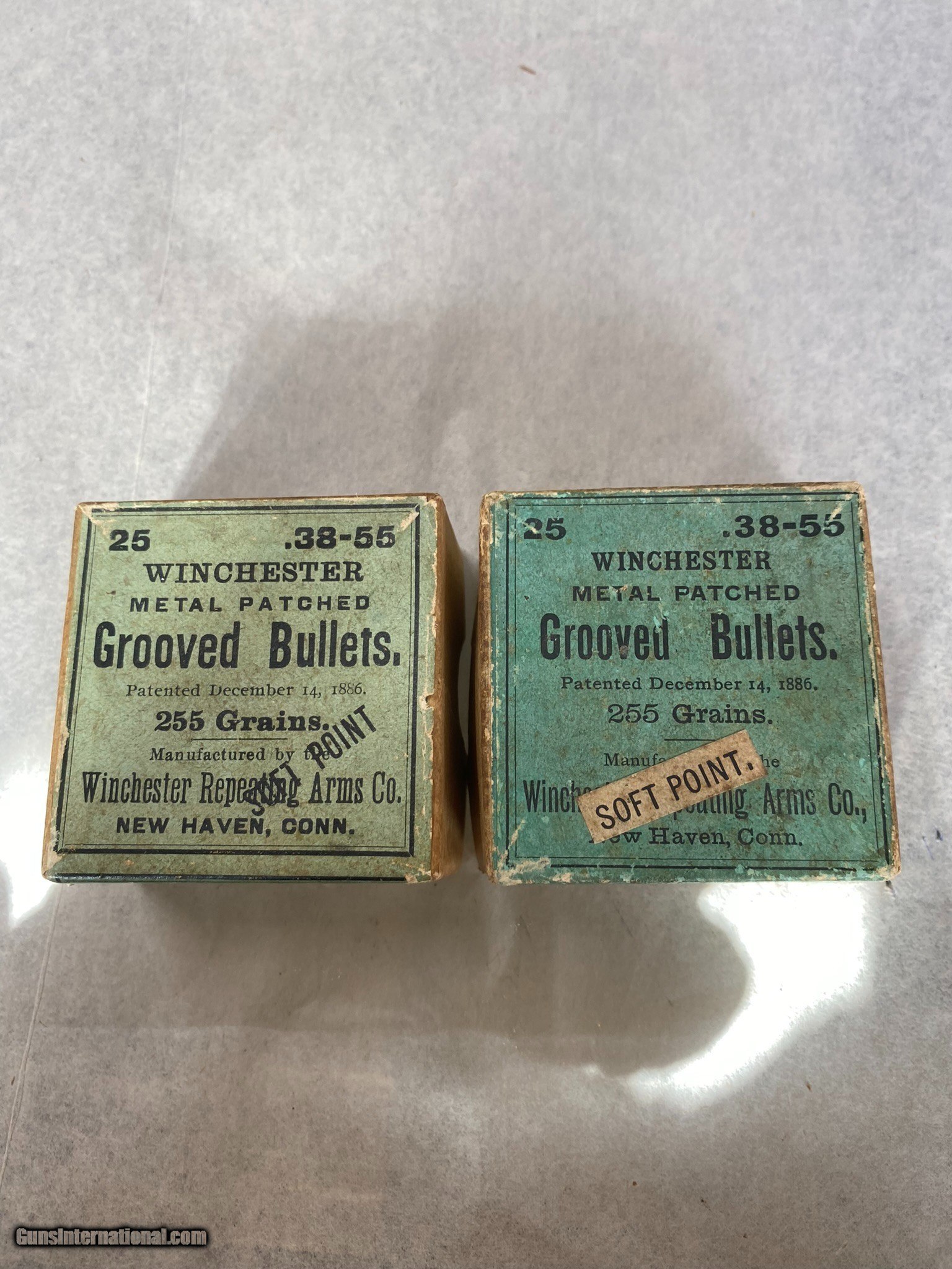 Description: 2 full boxes of 38-55 bullets. One box shows damage, one side is missing, allowing bullets to fall out if not careful. 2nd box is good. 255 grains, soft point. Please review photos for full details. Buy one or two boxes $5.00 postage one box, $8.00 postage both boxes $35.00 one box, $60.00 both boxes SOLD Rifle Caliber: .38-55 Winchester, .38-55 Winchester |