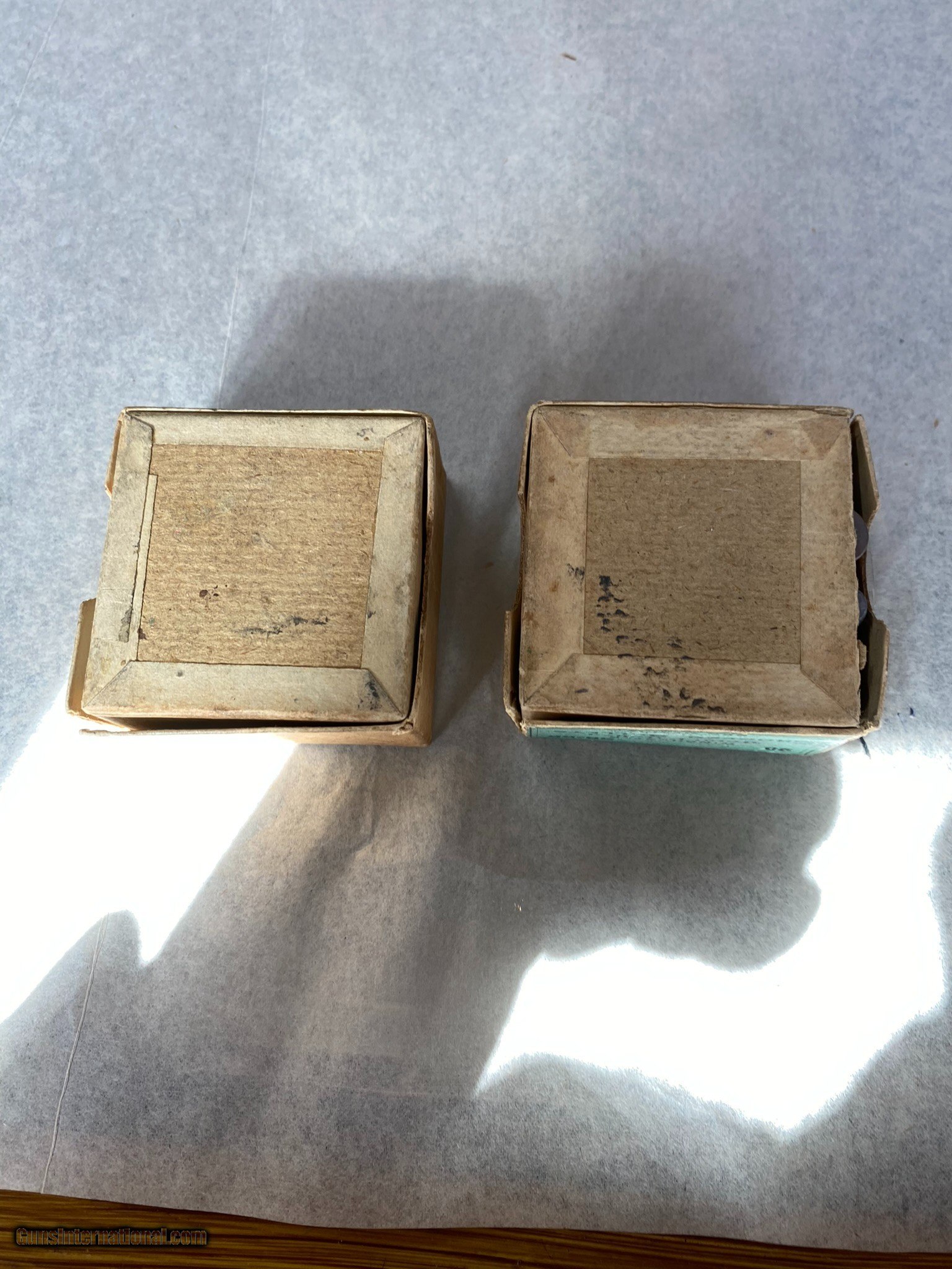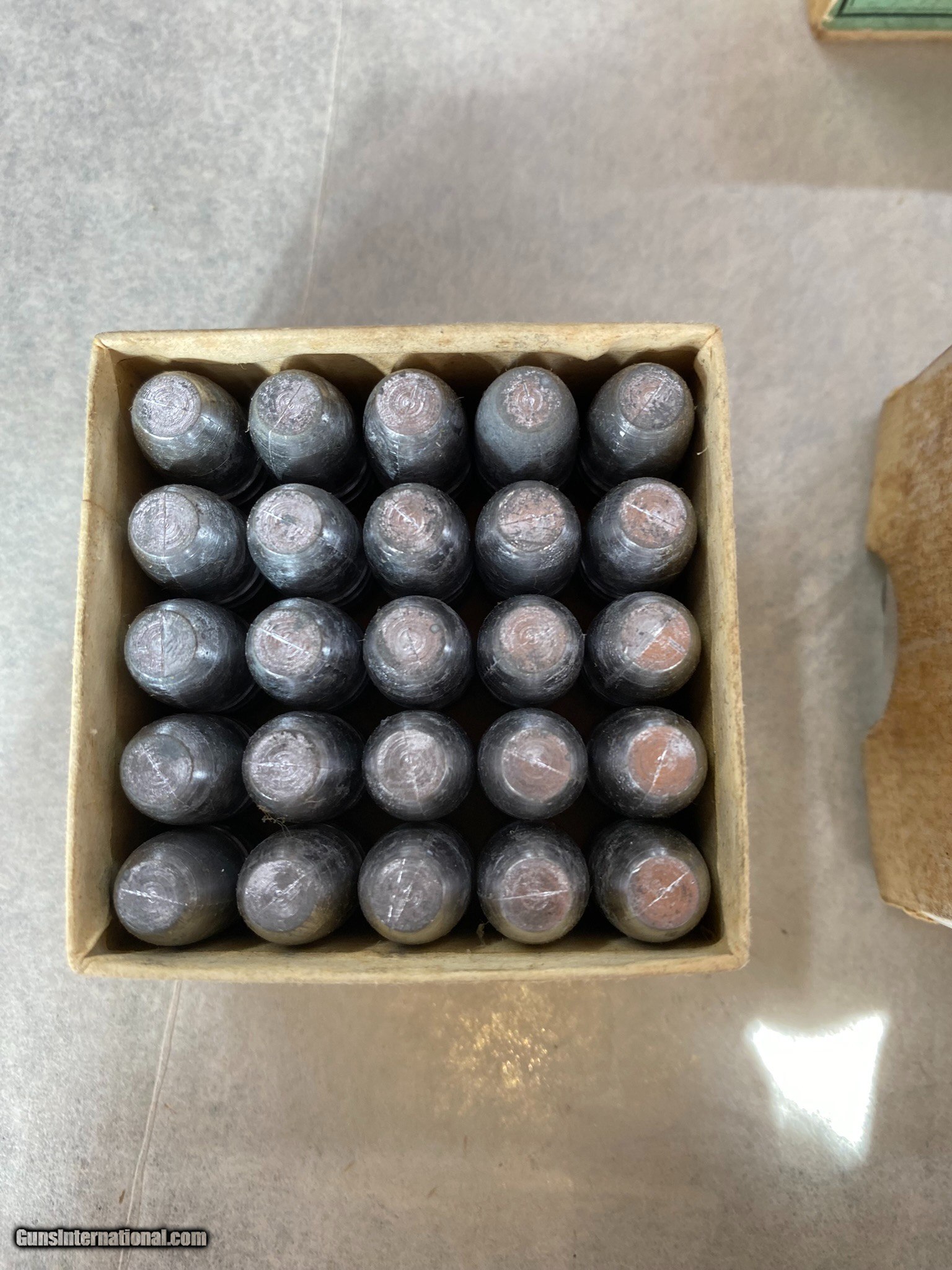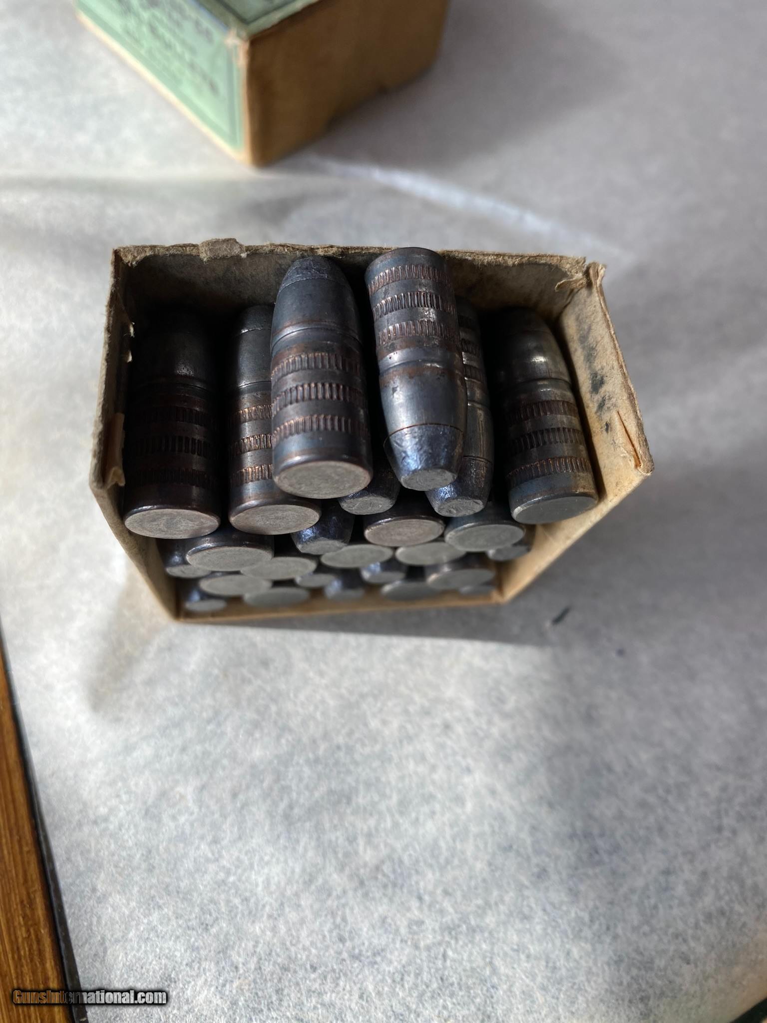Description: 2 full boxes of 38-55 bullets. One box shows damage, one side is missing, allowing bullets to fall out if not careful. 2nd box is good. 255 grains, soft point. Please review photos for full details. Buy one or two boxes $5.00 postage one box, $8.00 postage both boxes $35.00 one box, $60.00 both boxes SOLD Rifle Caliber: .38-55 Winchester, .38-55 Winchester |