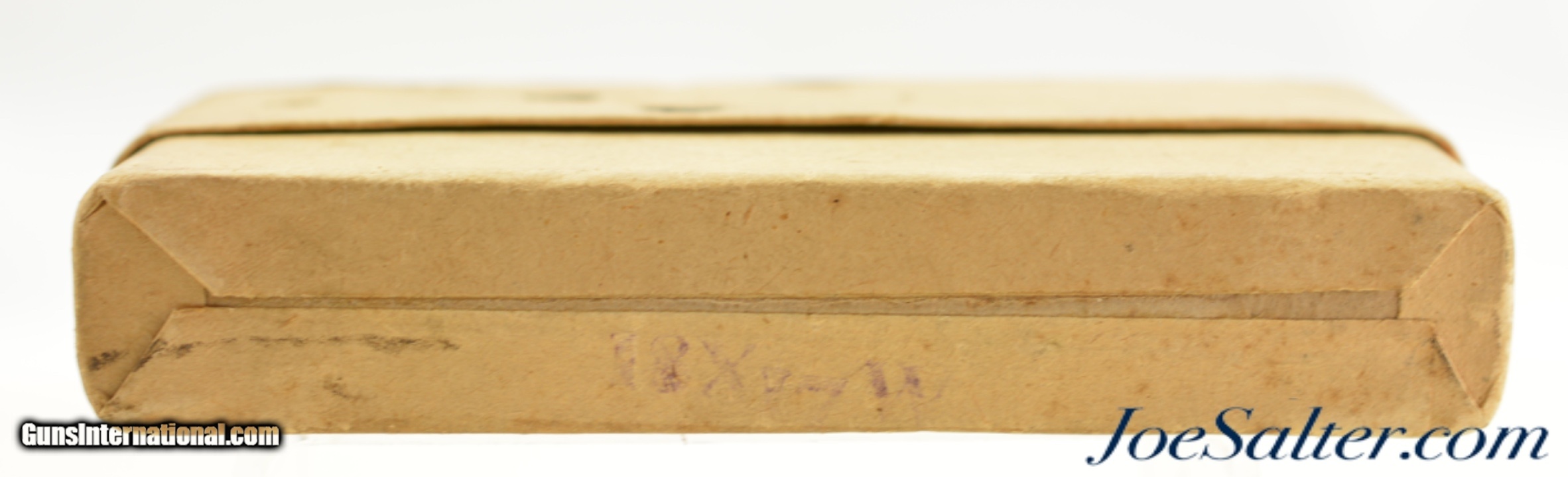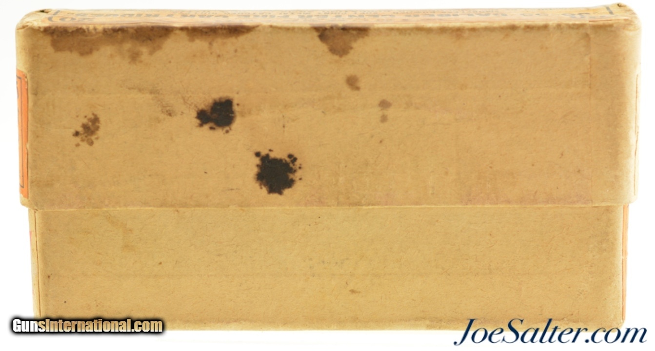 Description: This is a full box, 20 original rounds, of .38-55 WCF smokeless ammunition manufactured by Winchester with 255 grain metal patched soft point bullets. The two piece, round corner orange label box has a "6-6" date code on the side labels. The labels remain intact with an excellent cartridge cut having call outs for Winchester, Marlin and Ballard rifles. The box is solid with slight overall age soiling, bright colors and crisp graphics with scattered flaking on the side labels. The cartridges are in excellent condition with "w" primers and are native to the box. An excellent box to pair with your rifle or for an advanced Winchester box collection. SOLD |