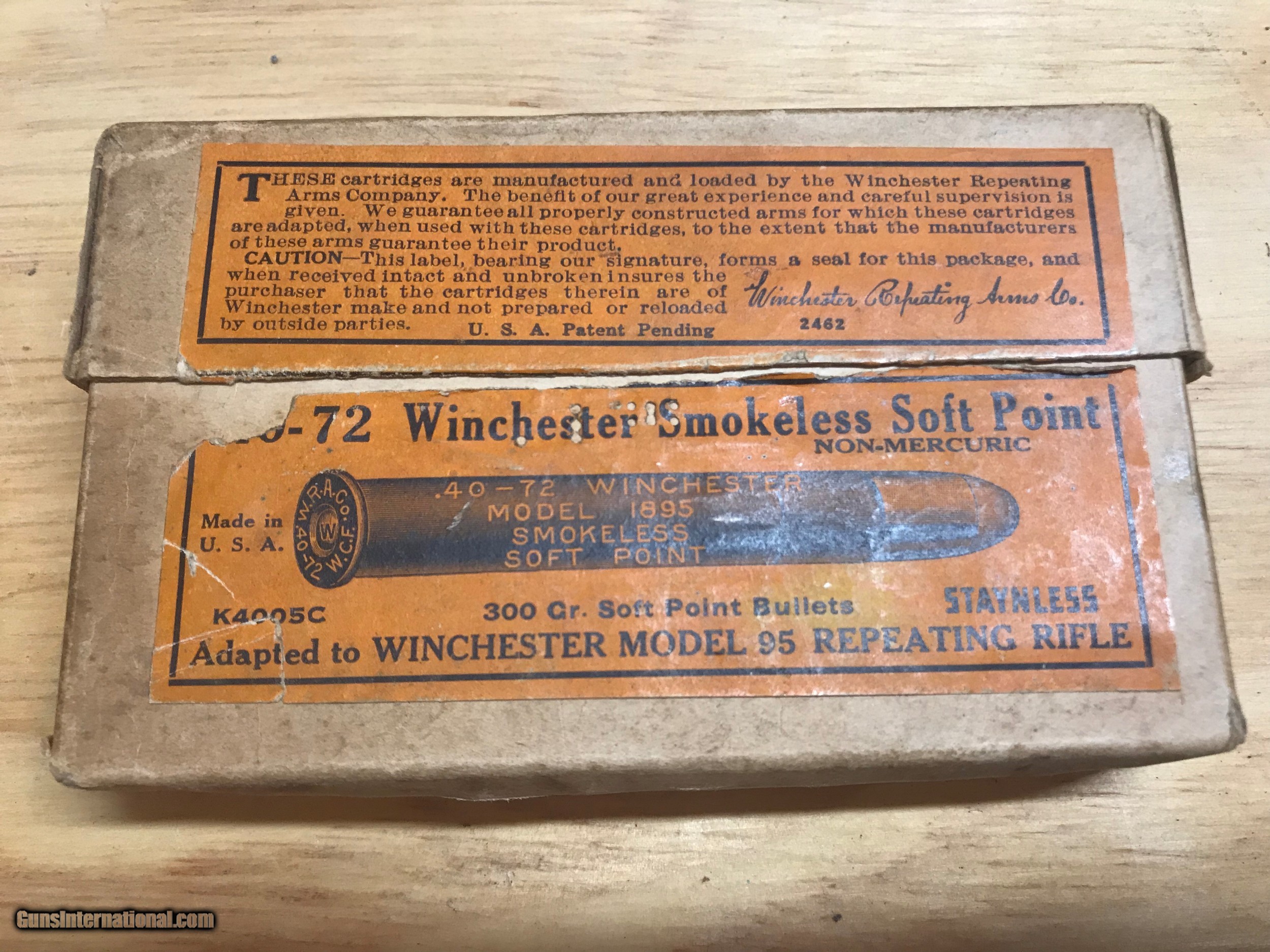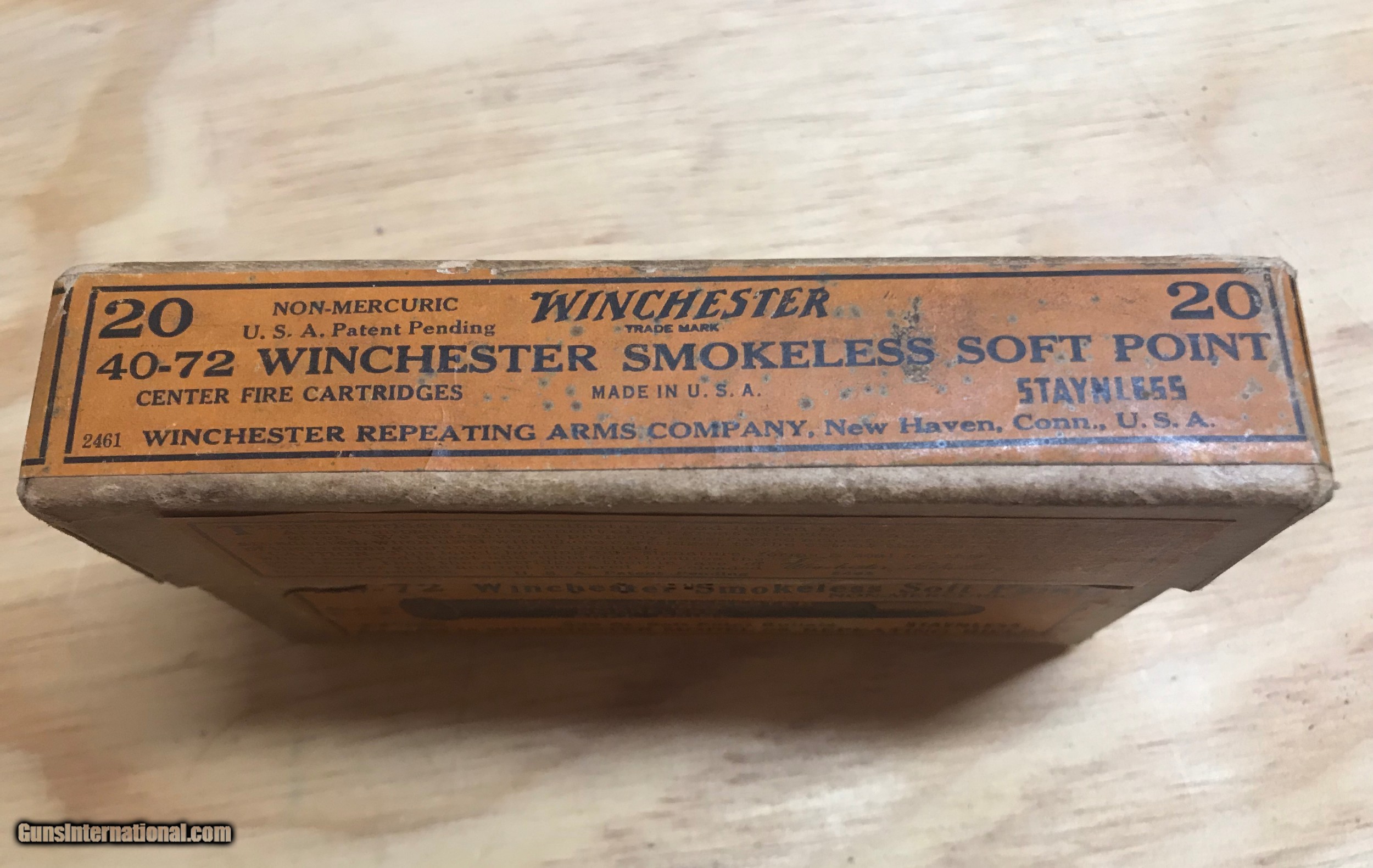 Description: Winchester 40-72 300 grain soft point cartridges. Box is full, complete and correct. Box code K400SC. SOLD |