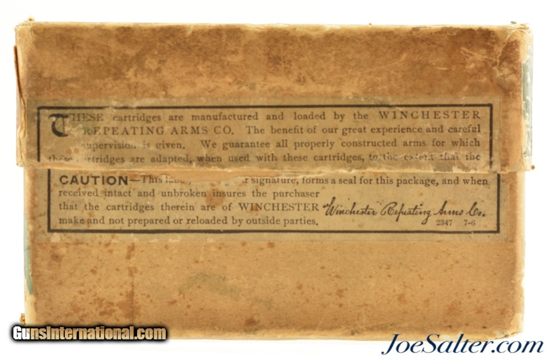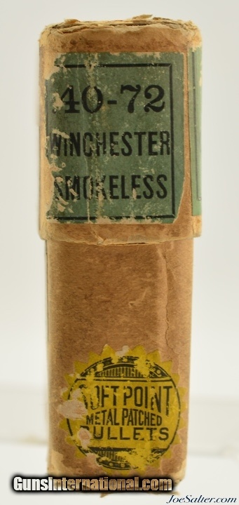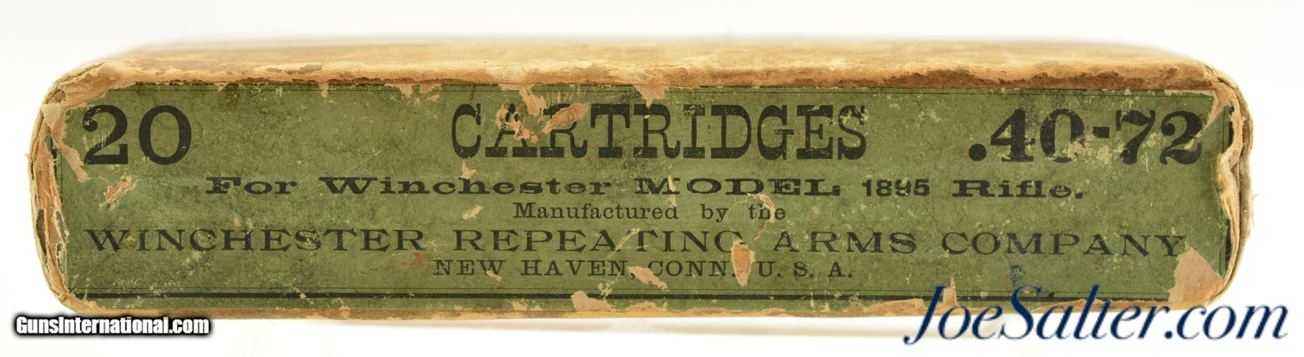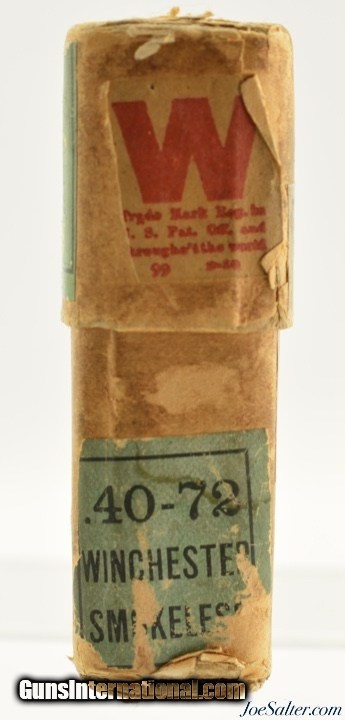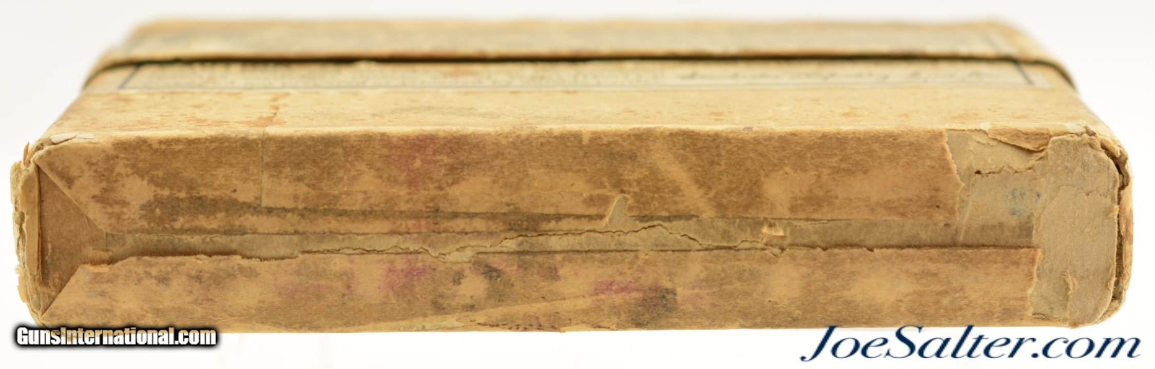 Description: This is a full box, 20 original rounds, of .40-72 smokeless ammunition manufactured by Winchester with 300 grain patched soft point bullets. The two piece, round corner box has the circa 1899 top and side labels with a side caution label dated "7-6". The box is solid with rub and edge wear in addition to some mild flaking of the primary and side labels and overall age soiling. The cartridges are in excellent condition with very slight age darkening. SOLD |