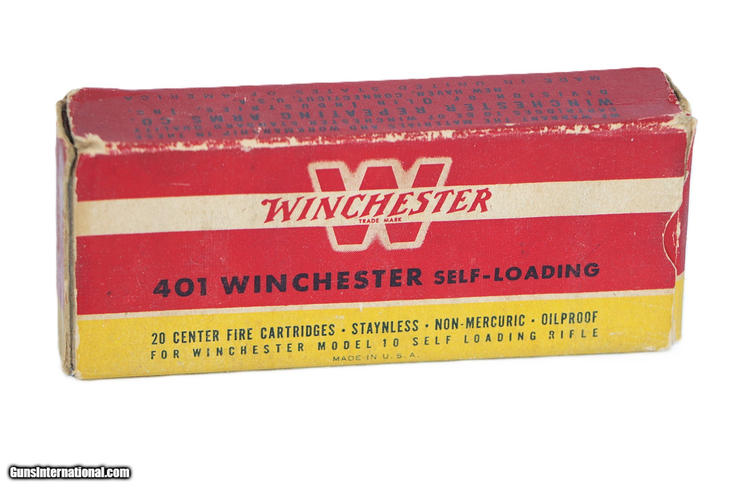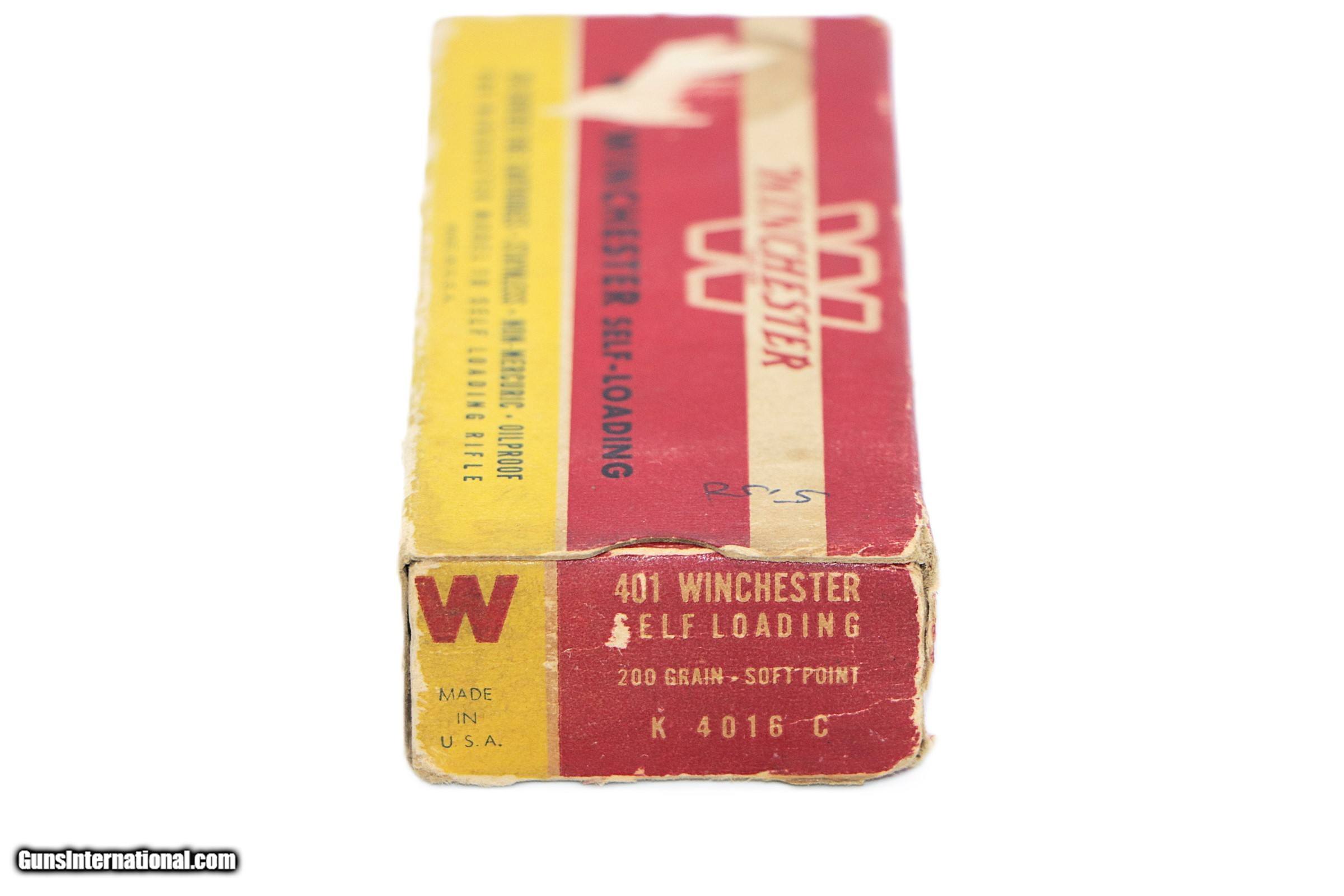 Description: Winchester, 401 Winchester Self Loading, 200 Grain, Soft Point, K4016C, 20 Factory Rds in Exc Condition . Box is VG with minor age soiling, some shelf, edge and corner wear. Add $15 S+H SOLD Rifle Caliber: .401 Winchester Self-Loading |