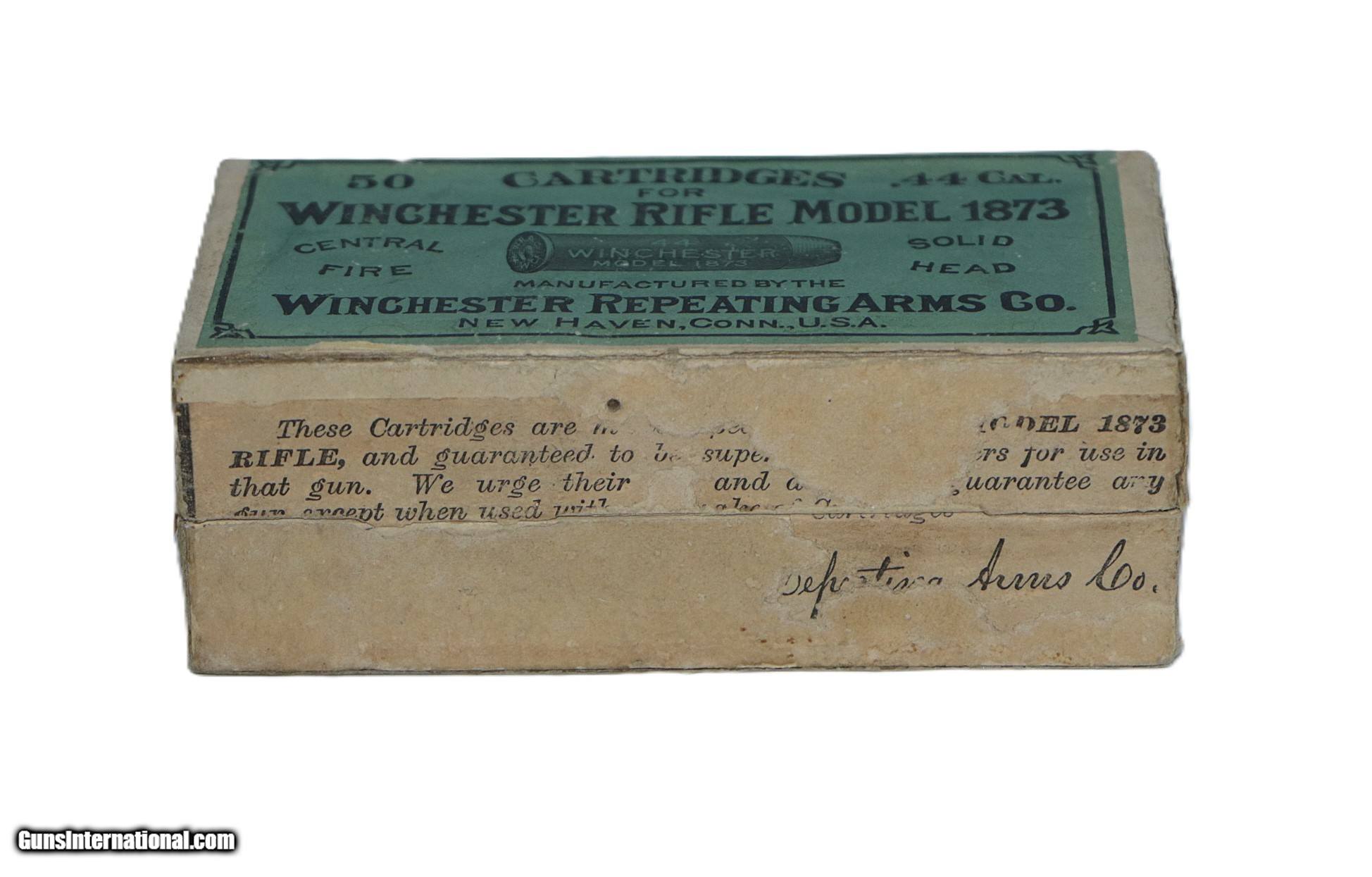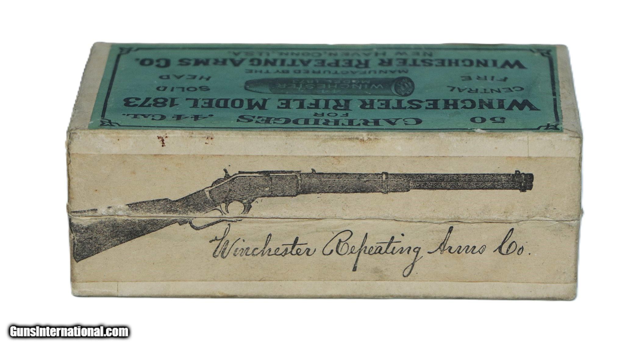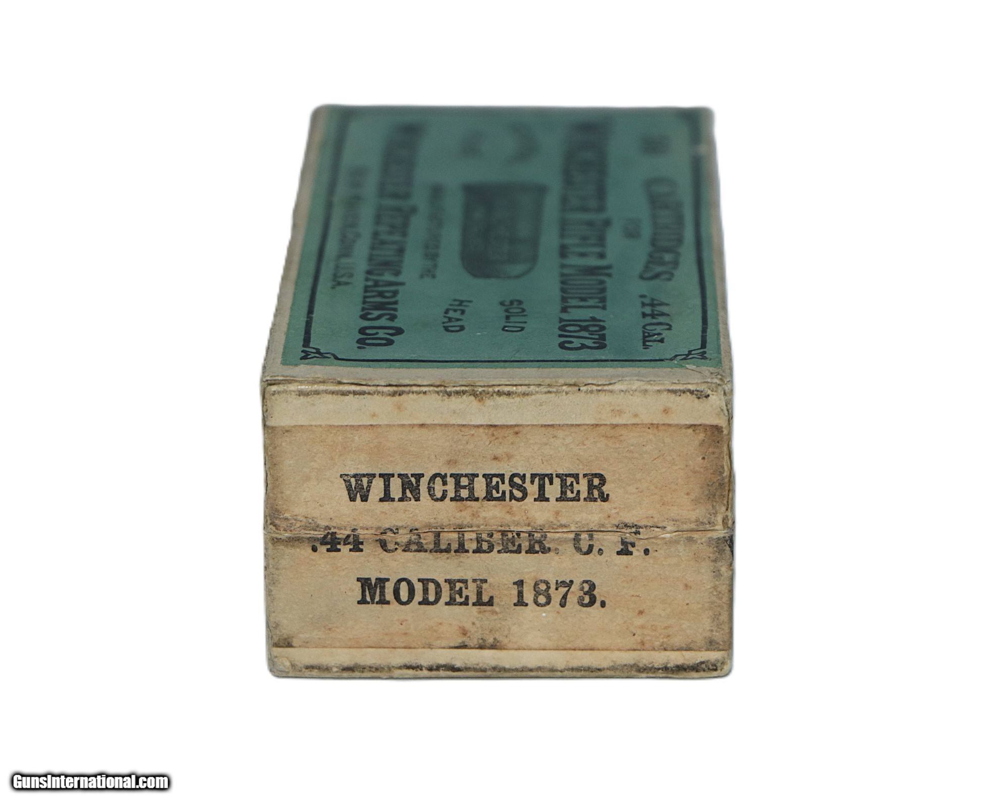Description: Winchester, .44 W.C.F., Central Fire, Solid Head, Full, 2pc. Buff box with green top & buff side sealing labels, box is solid with excellent color, Minor shelf, edge & corner wear, labels are intact. SOLD Rifle Caliber: .44-40 Winchester |