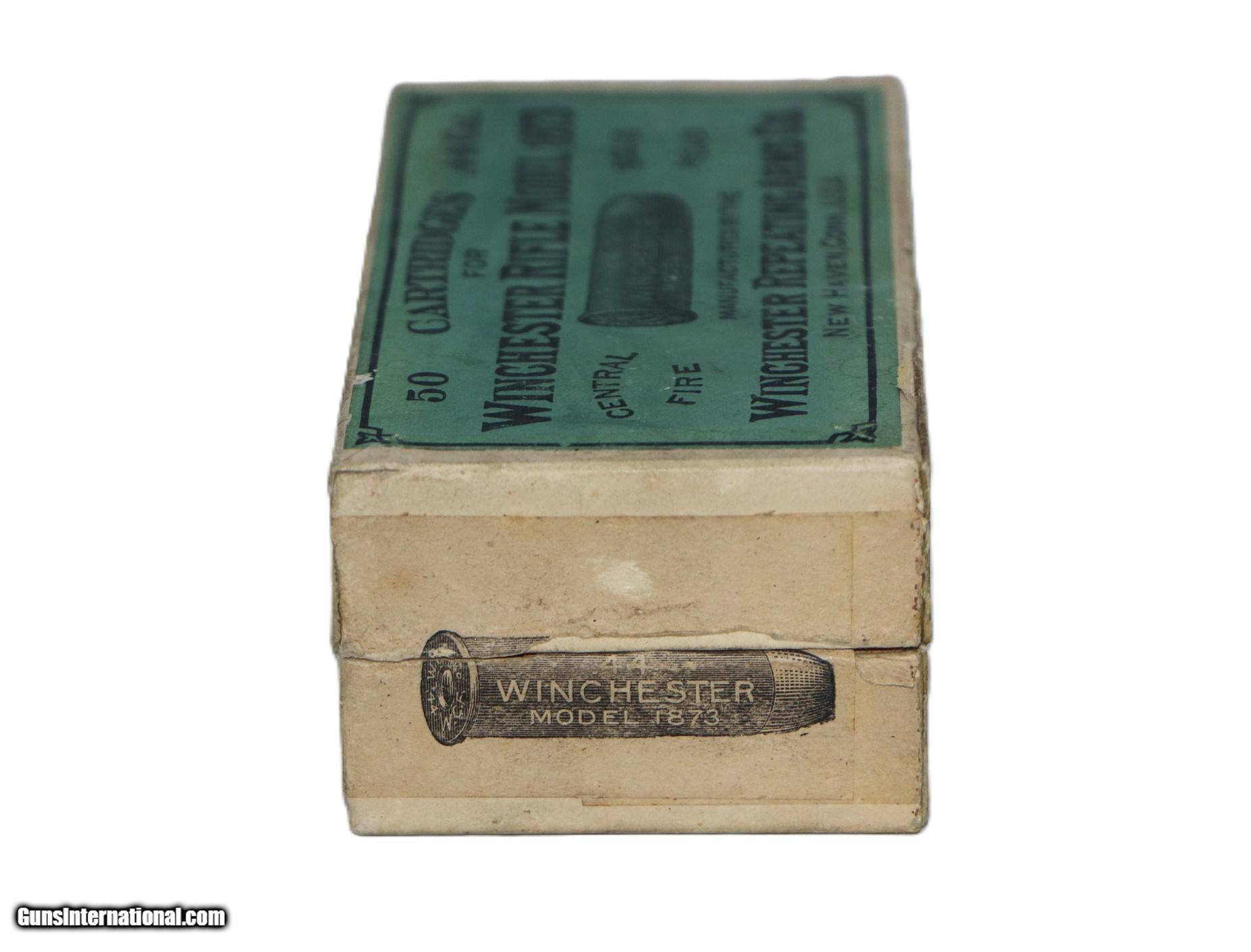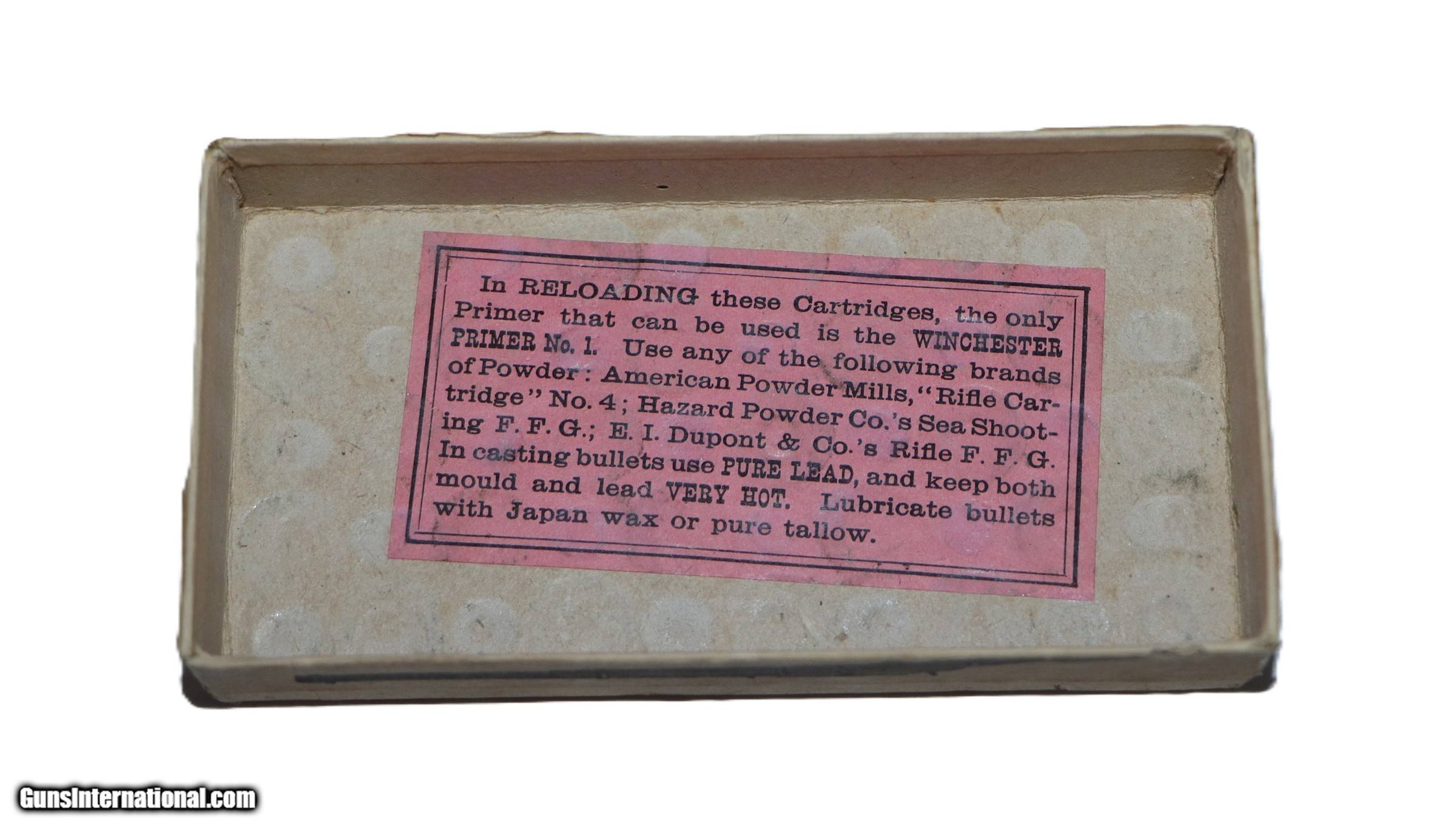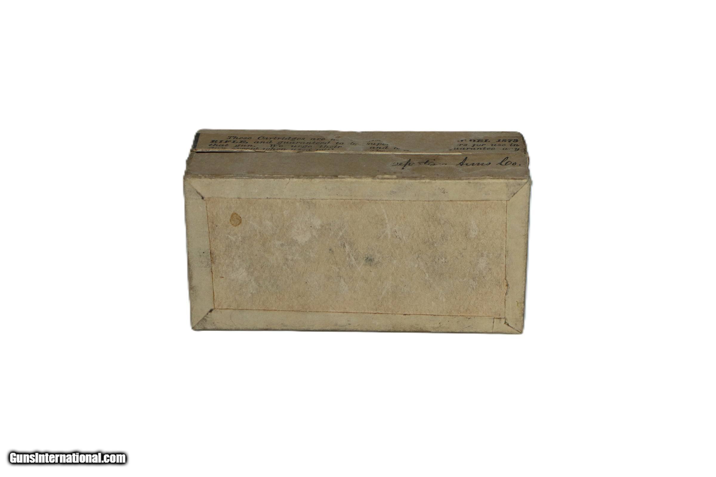 Description: Winchester, .44 W.C.F., Central Fire, Solid Head, Full, 2pc. Buff box with green top & buff side sealing labels, box is solid with excellent color, Minor shelf, edge & corner wear, labels are intact. SOLD Rifle Caliber: .44-40 Winchester |