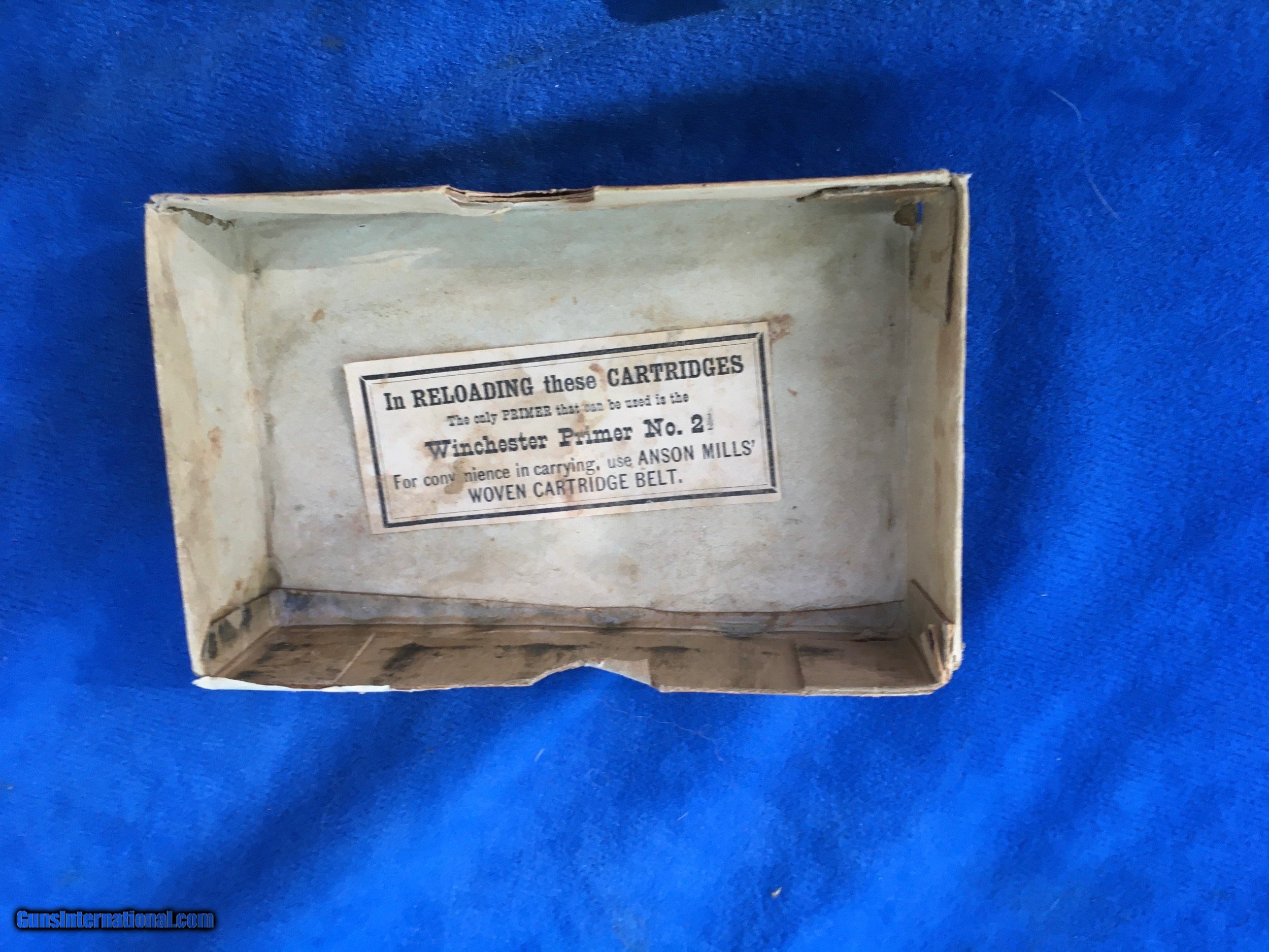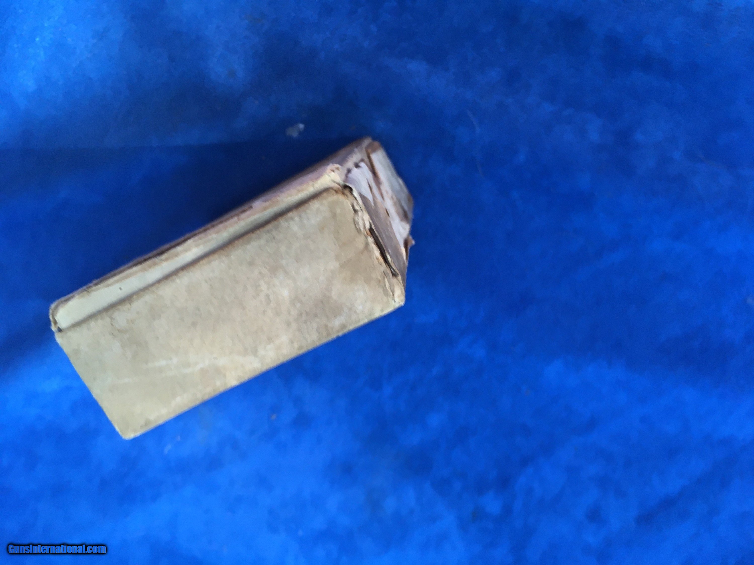 Description: Winchester 2-7/8 inch shell 120 grains powder and 500grain bullet 10 round box for Sharps Rifles c.1878.All rounds are native to the box still wrapped in original tissue paper. The box has had some restoration on the sides with a nice label,displays well.Shipping to lower 47 states 20.00. SOLD |