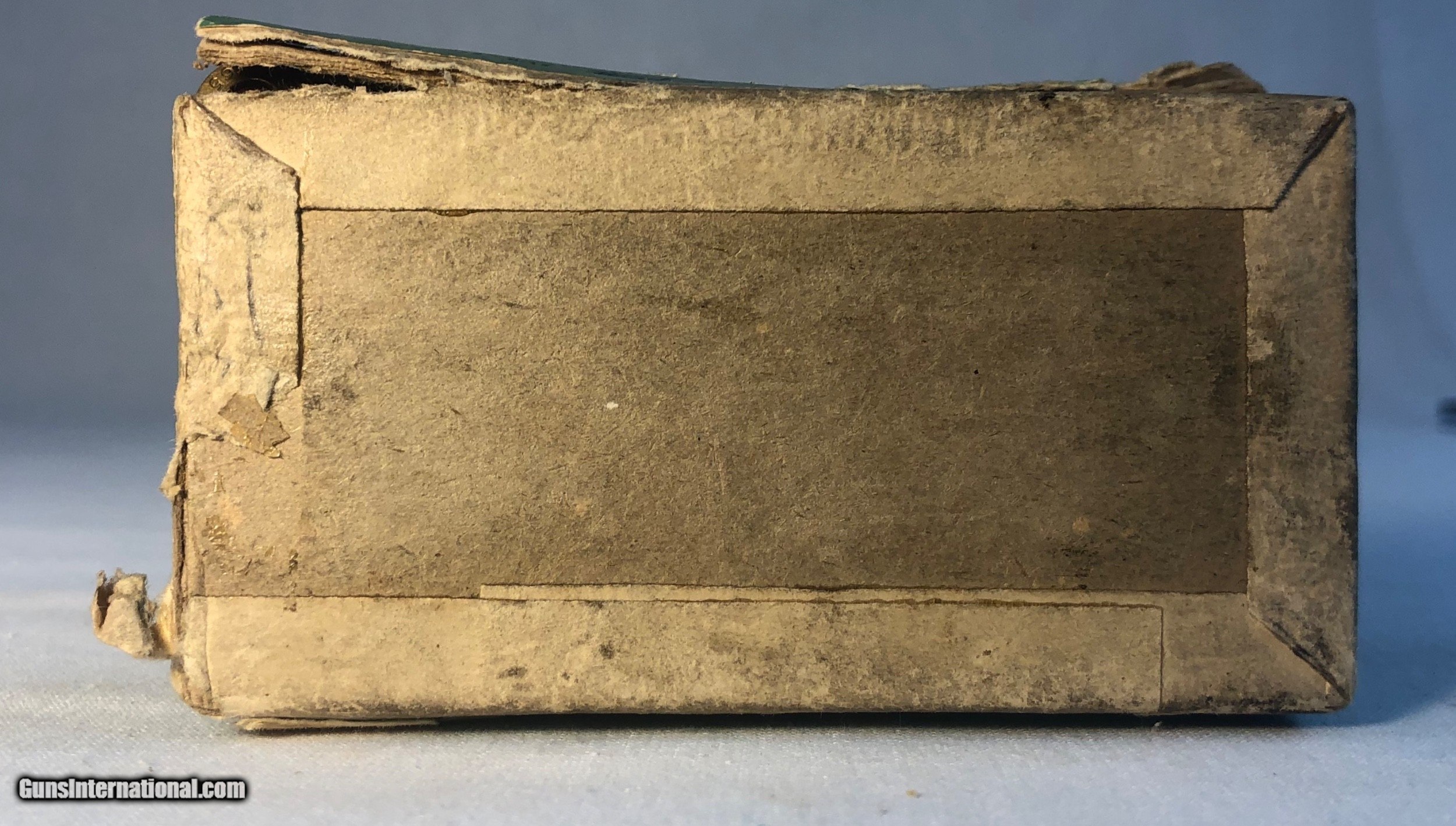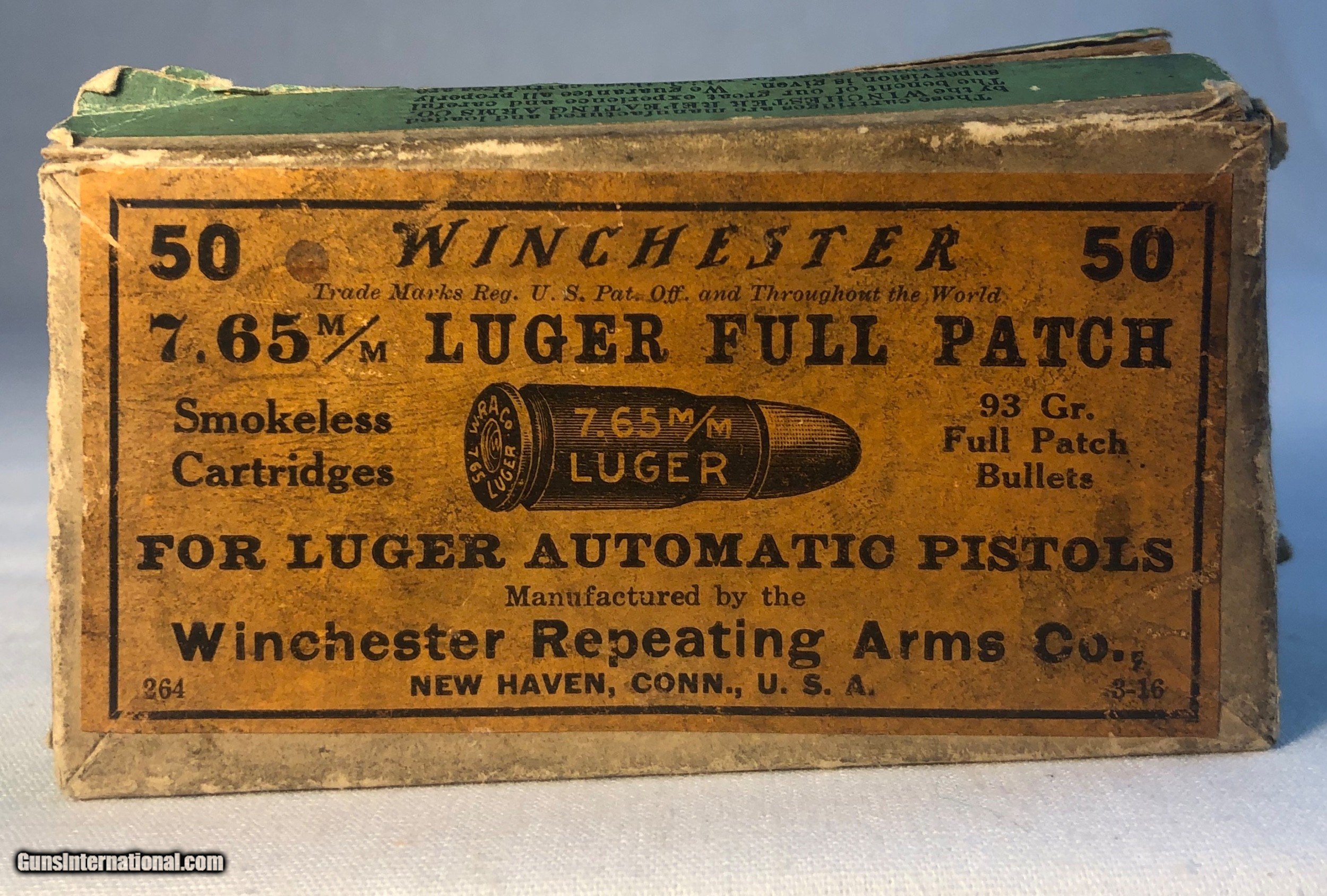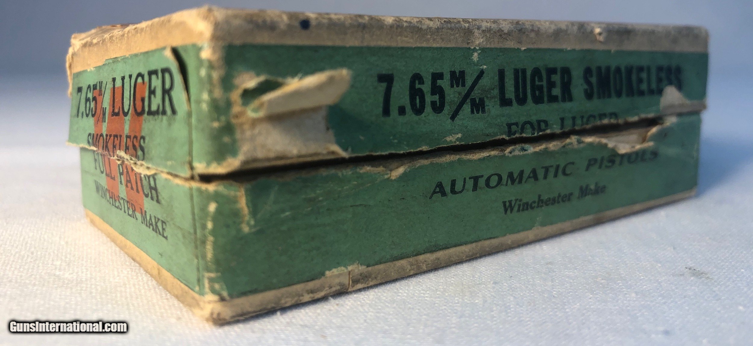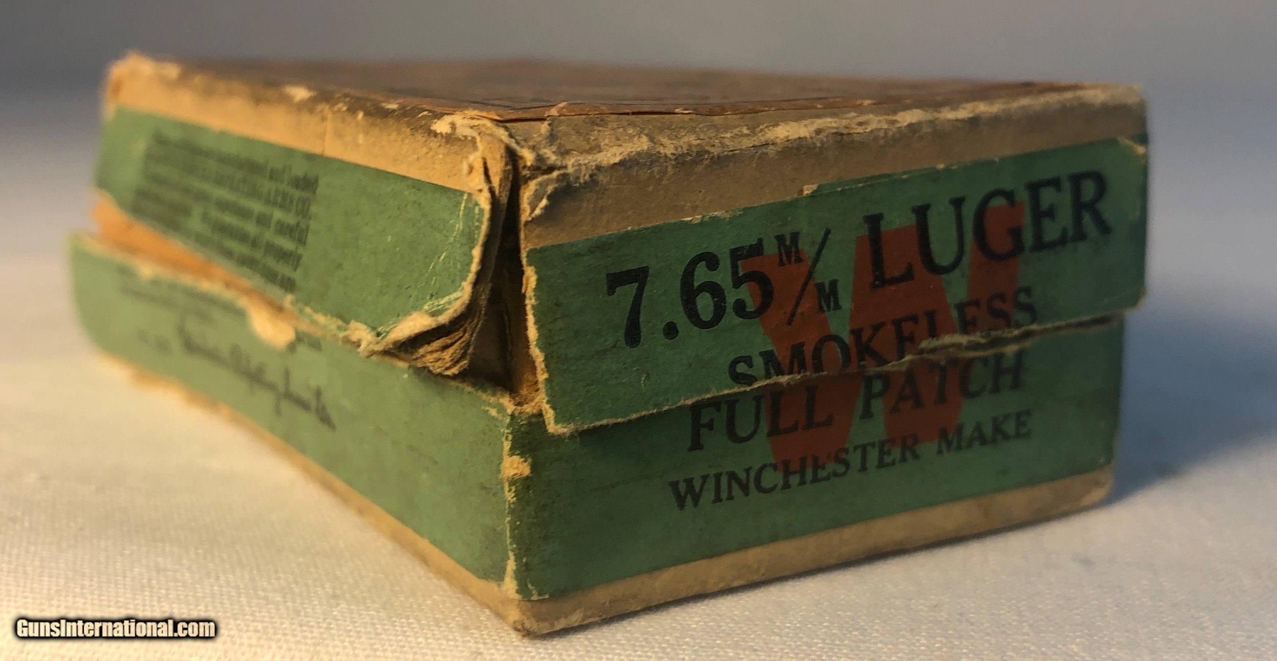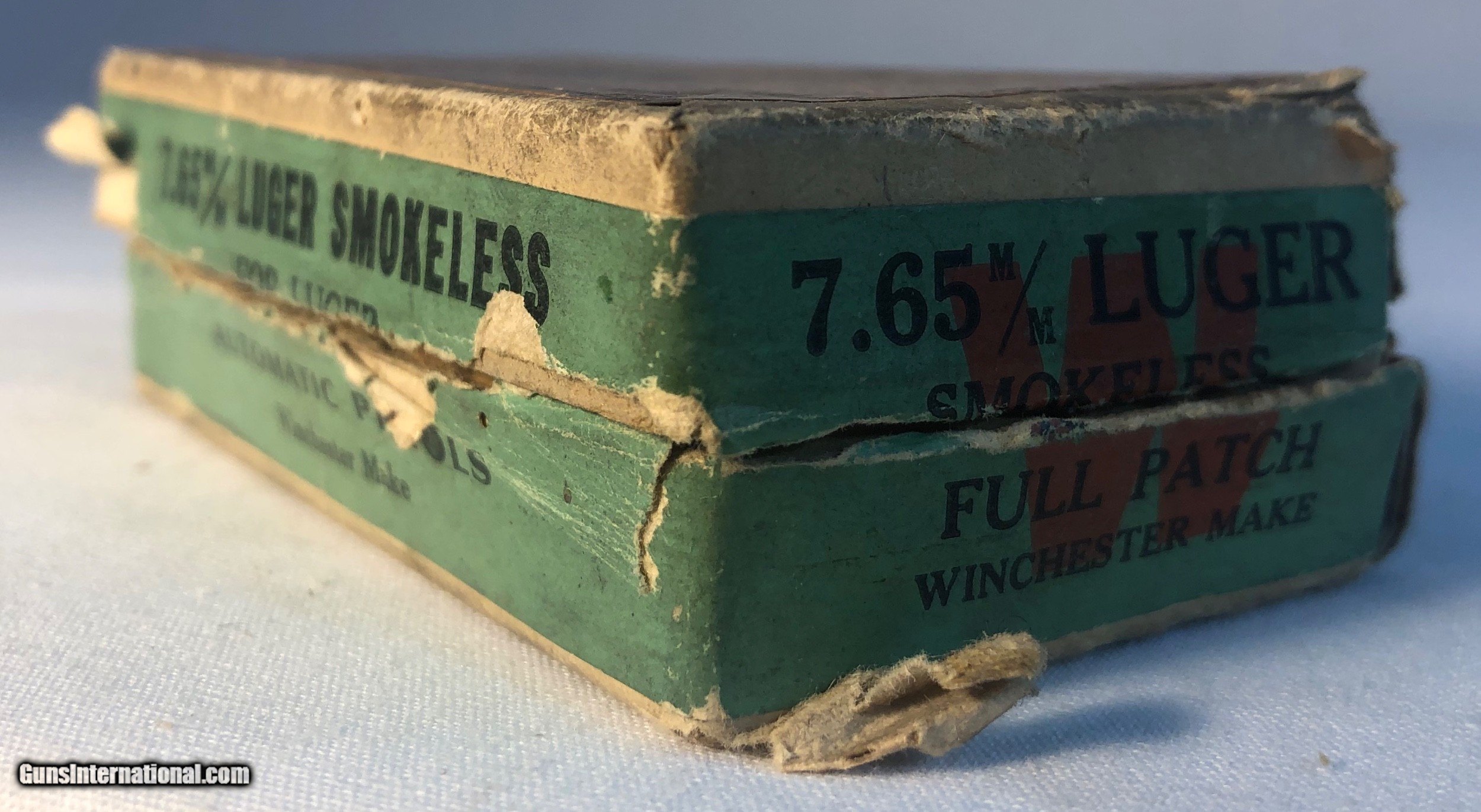 Description: This is a full box of Winchester 7.65 MM Luger Full Patch ammunition for Luger automated pistols. Cartridges are in very good condition. The box is in fair condition structurally (split in one corner) and some tears in labels but maintains bright color and legible verbiage on labels that are present. Ground shipping is included to the lower 48 states. (Except no ship to CA and NJ) This ammunition is sold as a collectors item only and we make no quarantees to its quality or functionality. Please know and abide by your local laws in regards to purchasing ammunition. Signature required upon delivery. SOLD |