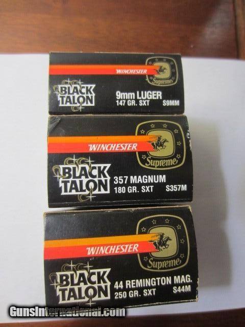 Description: WINCHESTER BLACK TALON AMMO WE HAVE THE FOLLOWING IN STOCK 9MM LUGER 357 MAG AND 44 REMINGTON MAG PRICE PER BOX $100.00 SHIPPING $15.00 WANT TO PURCHASE CALL OUR OFFICE 716-941-3946 SOLD |
