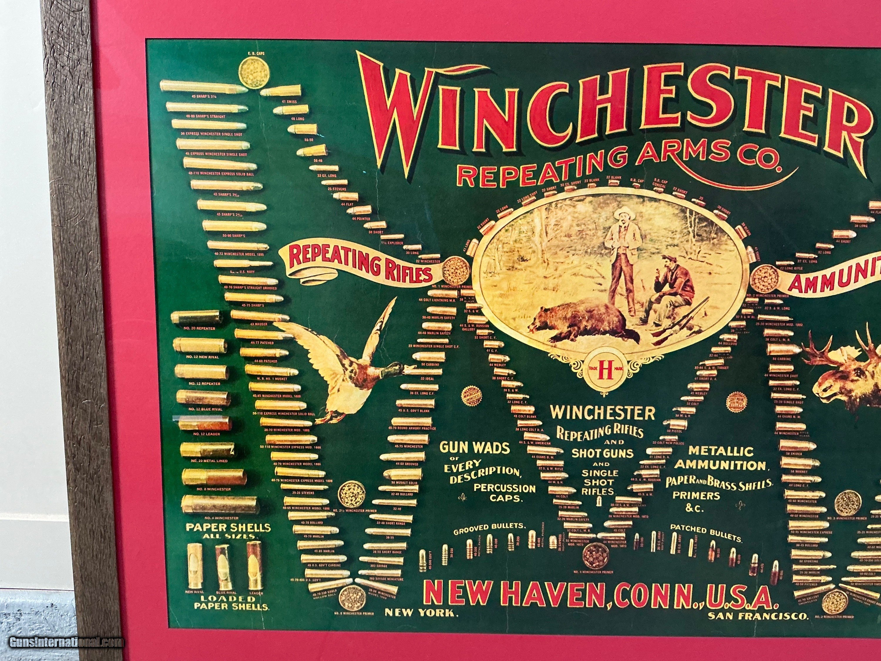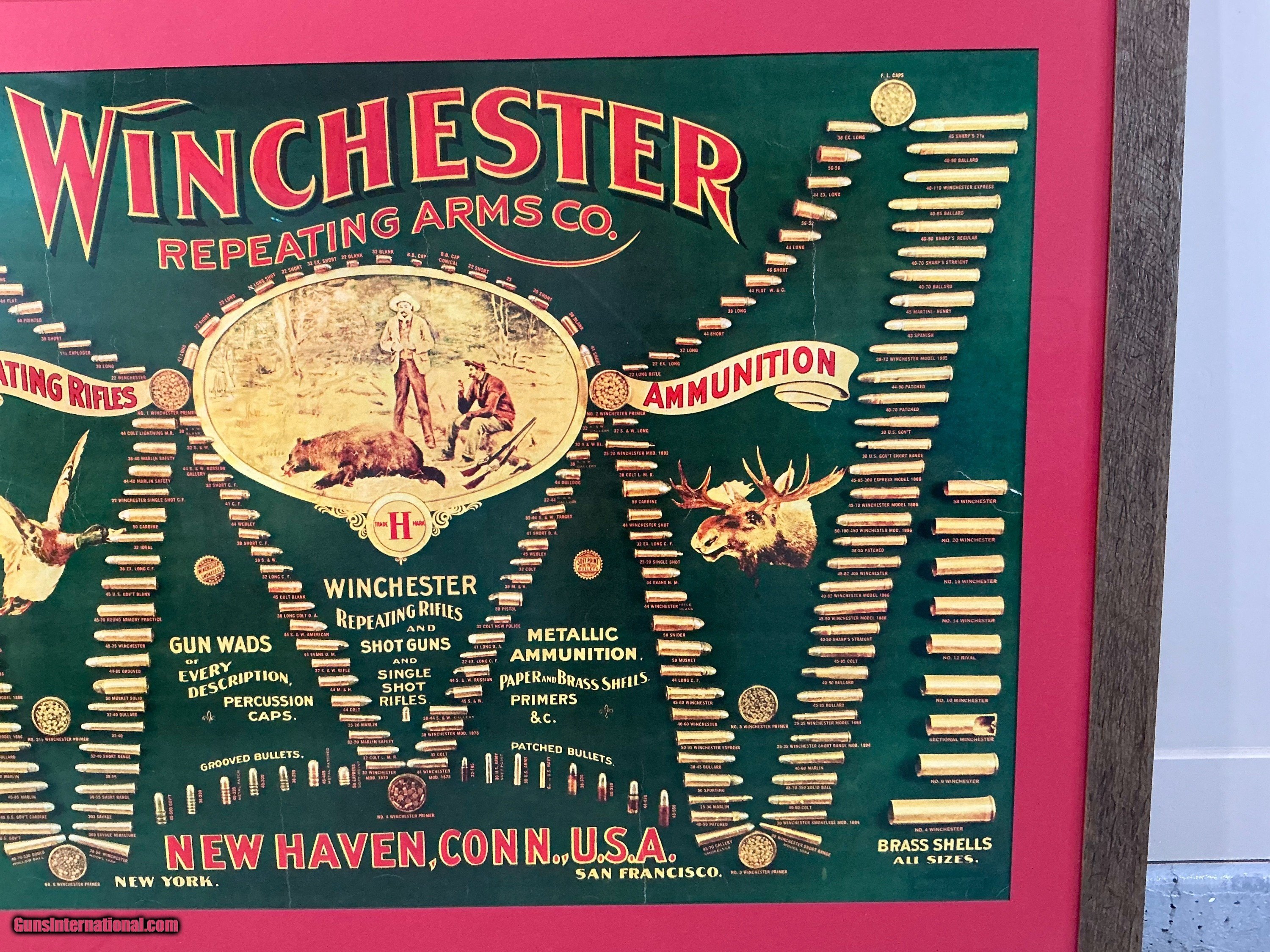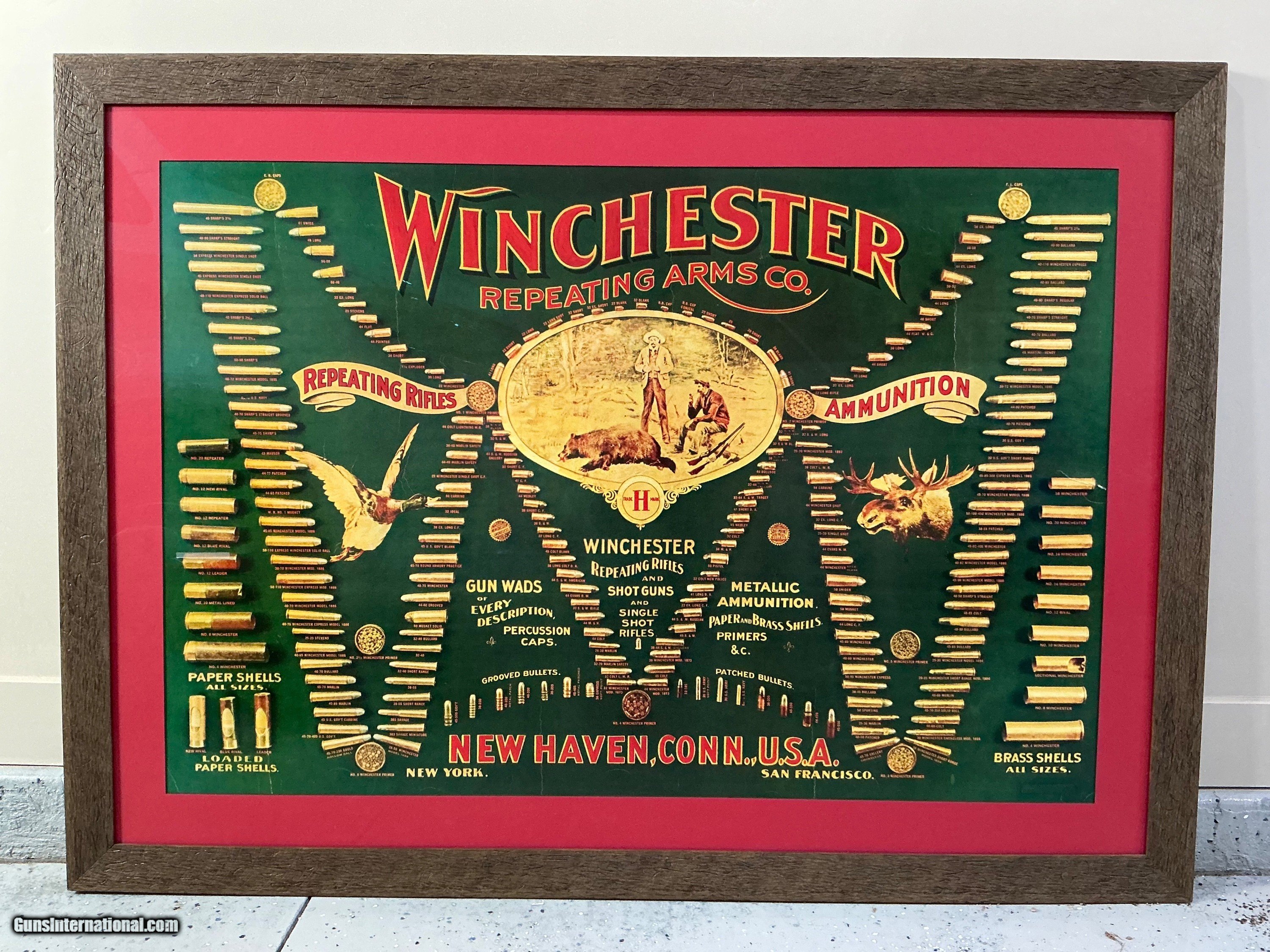 Description: This is a beautiful original early Winchester Bulletin Board frammed print. Colors are bright and clean. This would make an eye0-poping addition to your trophy room . Price: POR Shipping: $200.00 Contact Seller |