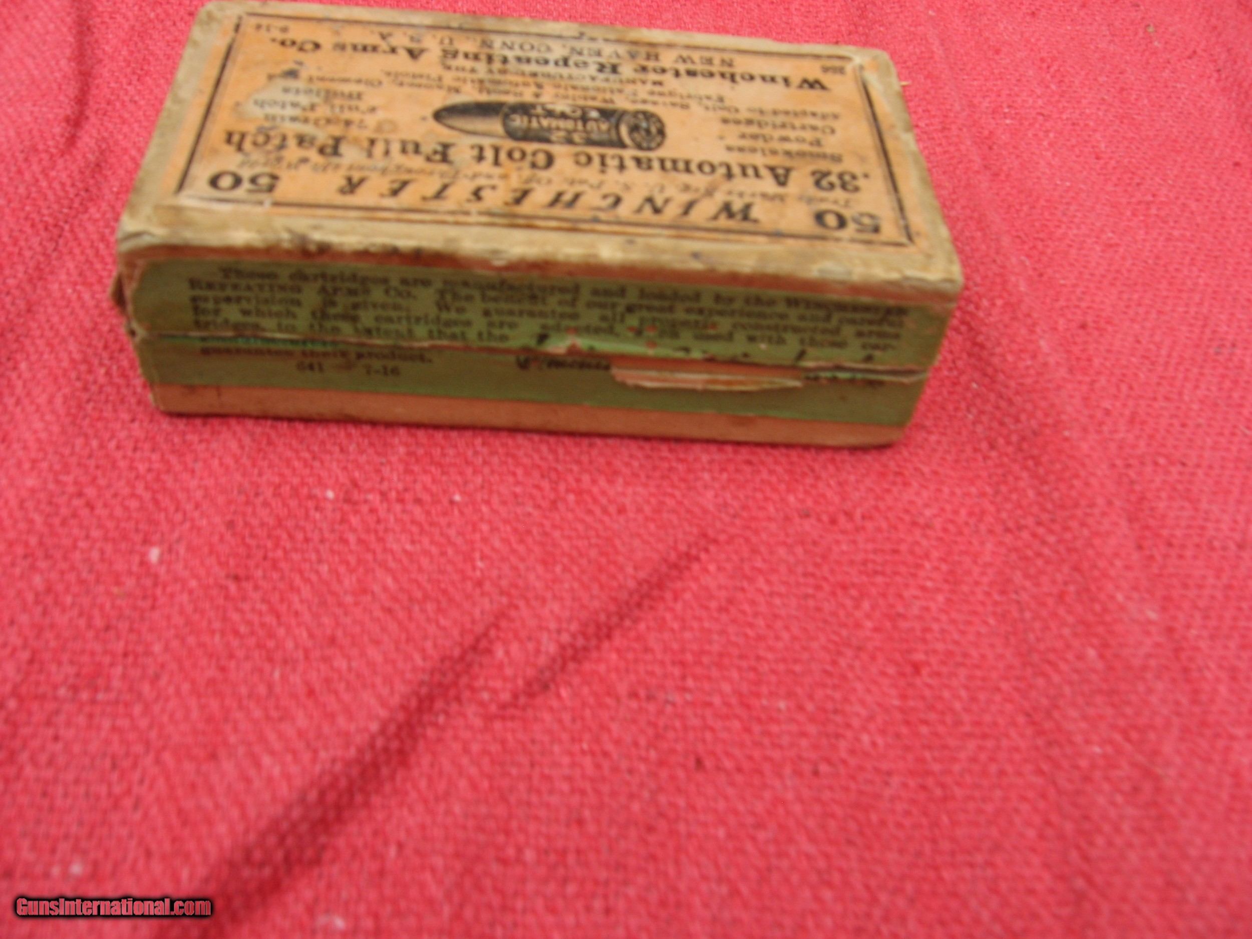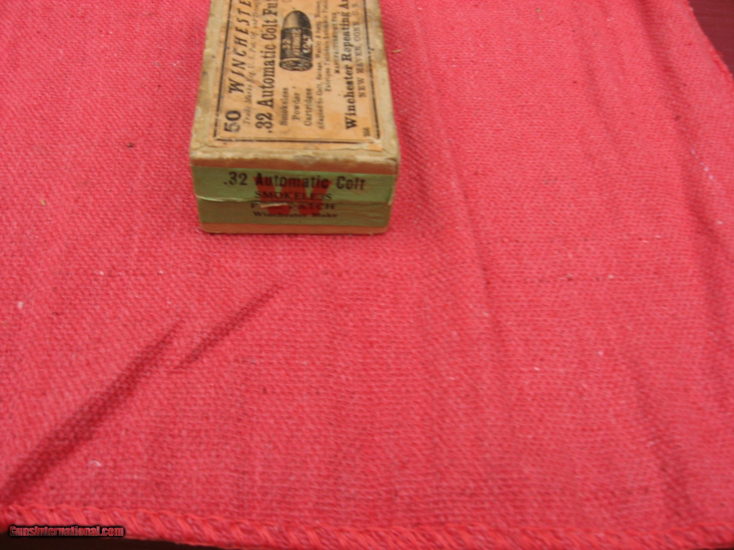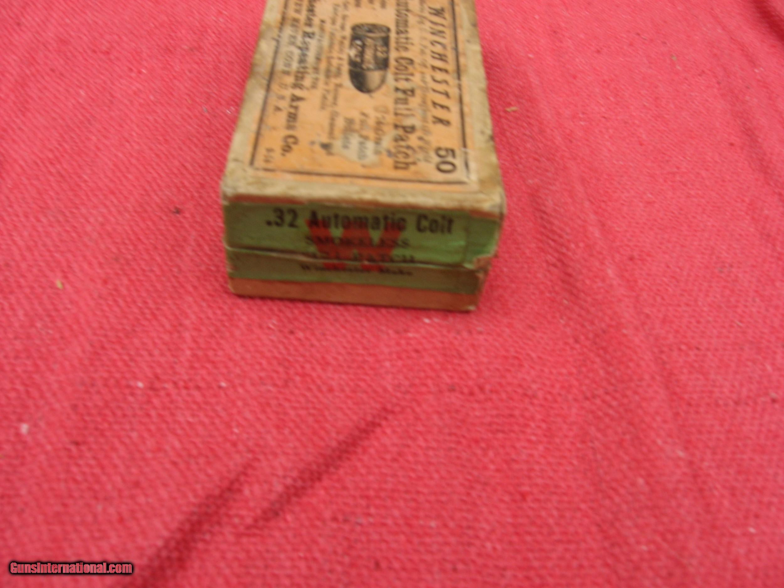 Description: PARTIAL BOX OF WINCHESTER 32 COLT AUTO FULL PATCH, EARLY GREEN BOX. $75.00 PLUS $10.00 SHIPPING SOLD Handgun Caliber: .32 ACP (7.65x17mm Browning SR) |