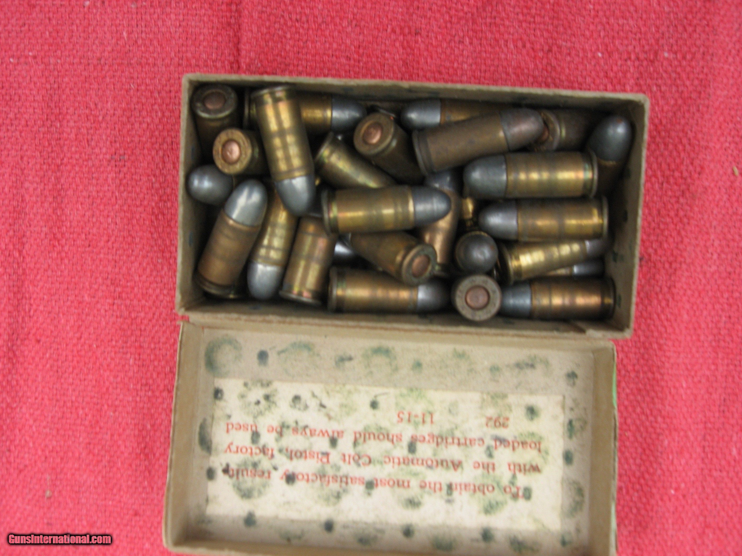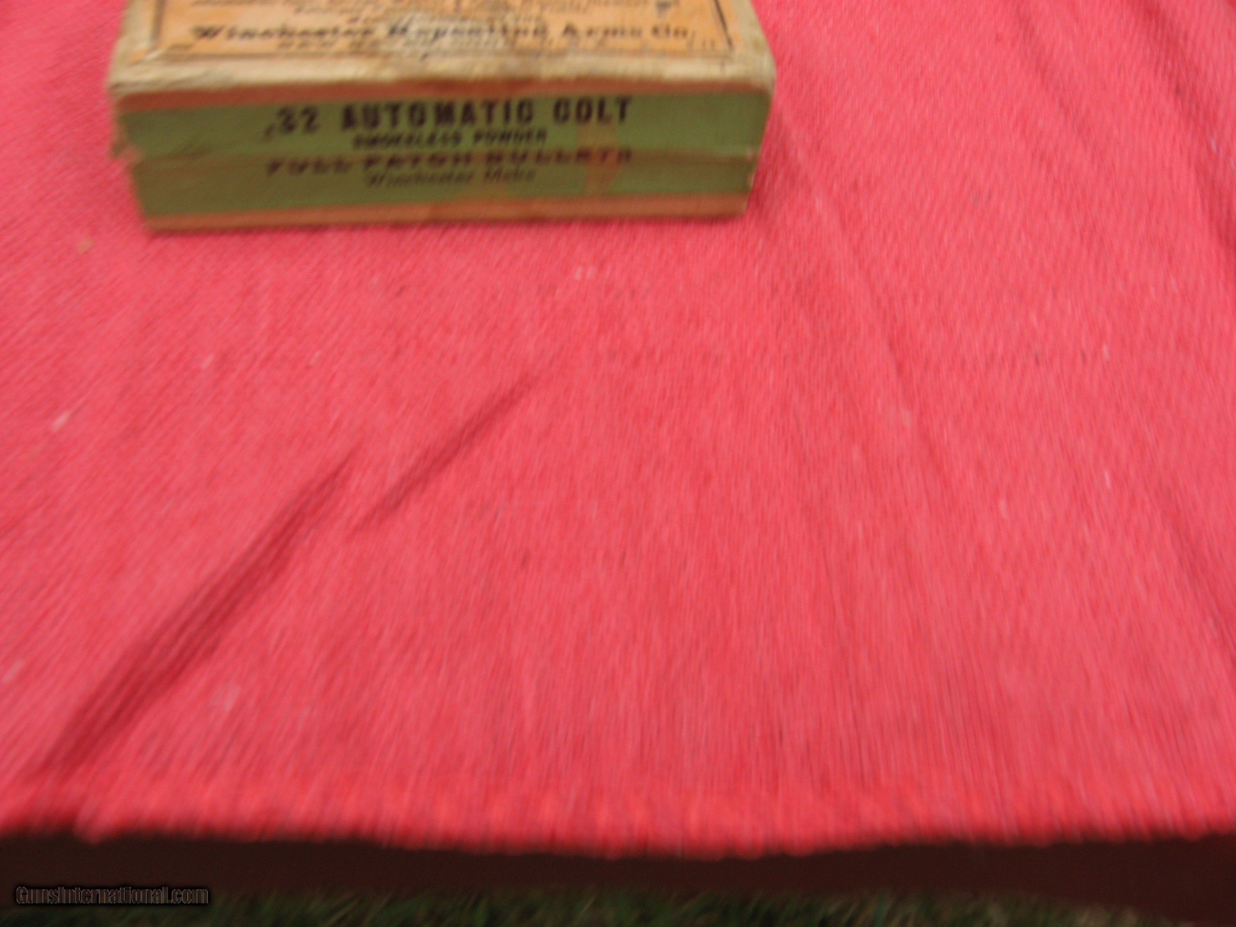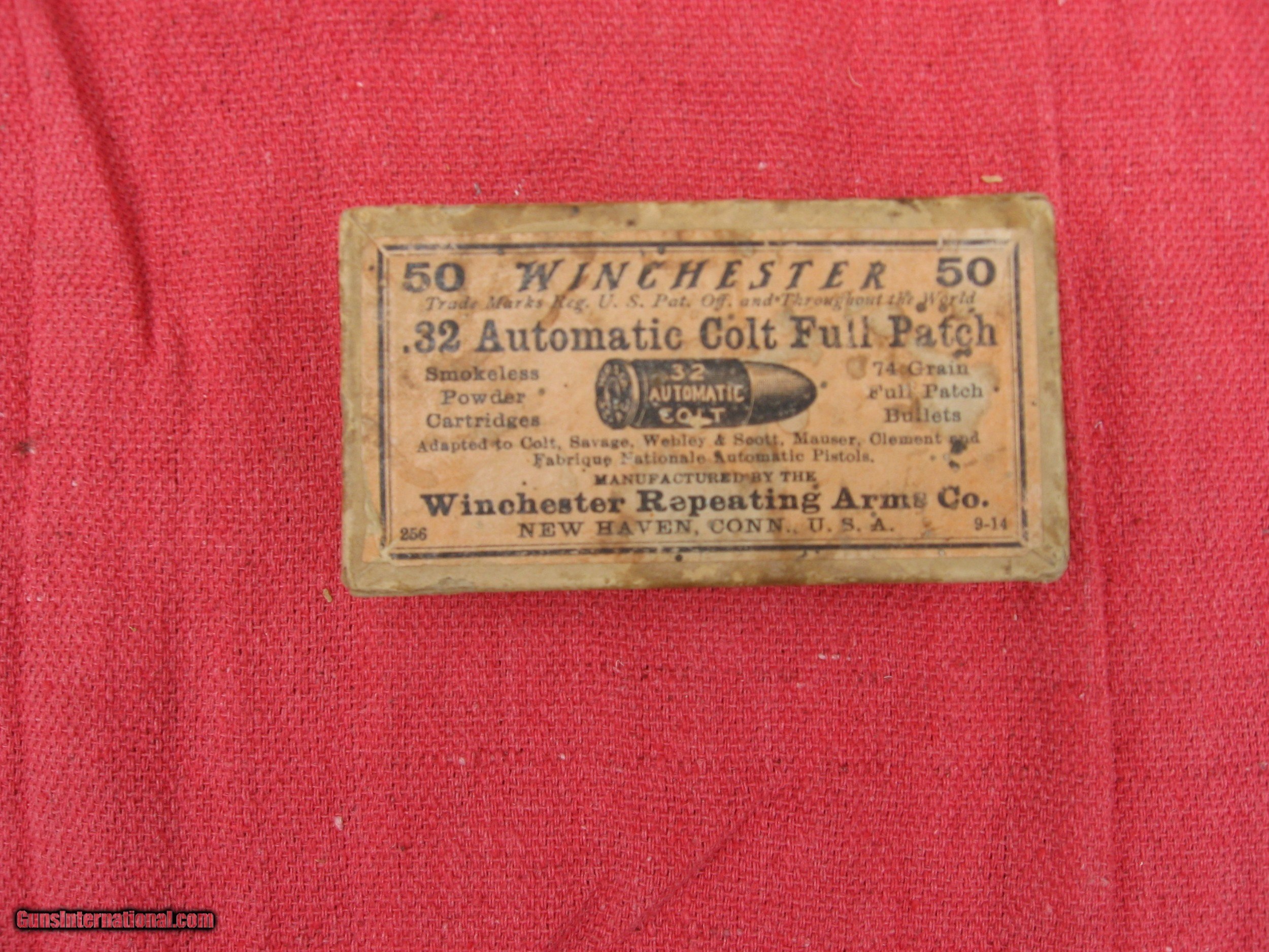 Description: PARTIAL BOX OF WINCHESTER 32 COLT AUTO FULL PATCH, EARLY GREEN BOX. $75.00 PLUS $10.00 SHIPPING SOLD Handgun Caliber: .32 ACP (7.65x17mm Browning SR) |