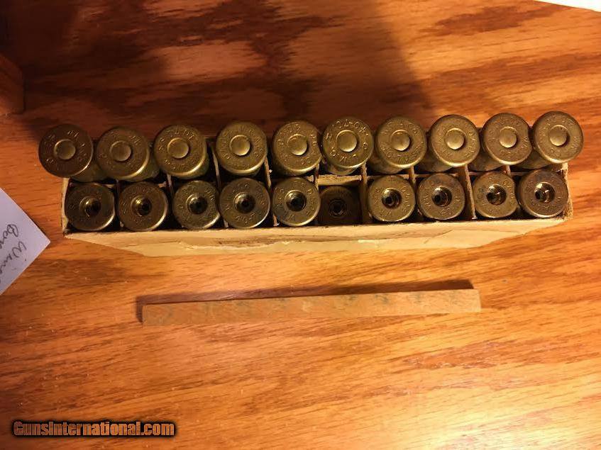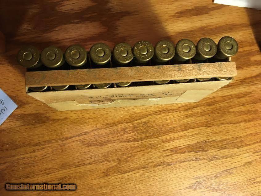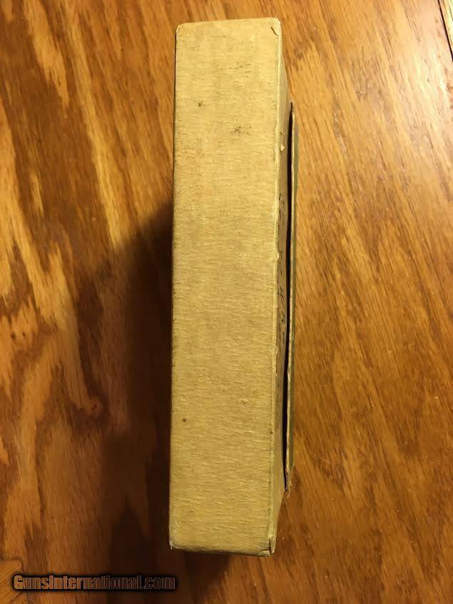 Description: Box is in poor condition with a lot of tape. Graphics are in good condition and very legible. 10 rounds have been used but properly cleaned and in excellent condition. The remaing ten are loaded with PP bullets, excellent condition. The "stick" that was used to elevate one row of cartridges is also present. SOLD SOLD Rifle Caliber: .40-70 Sharps Straight |