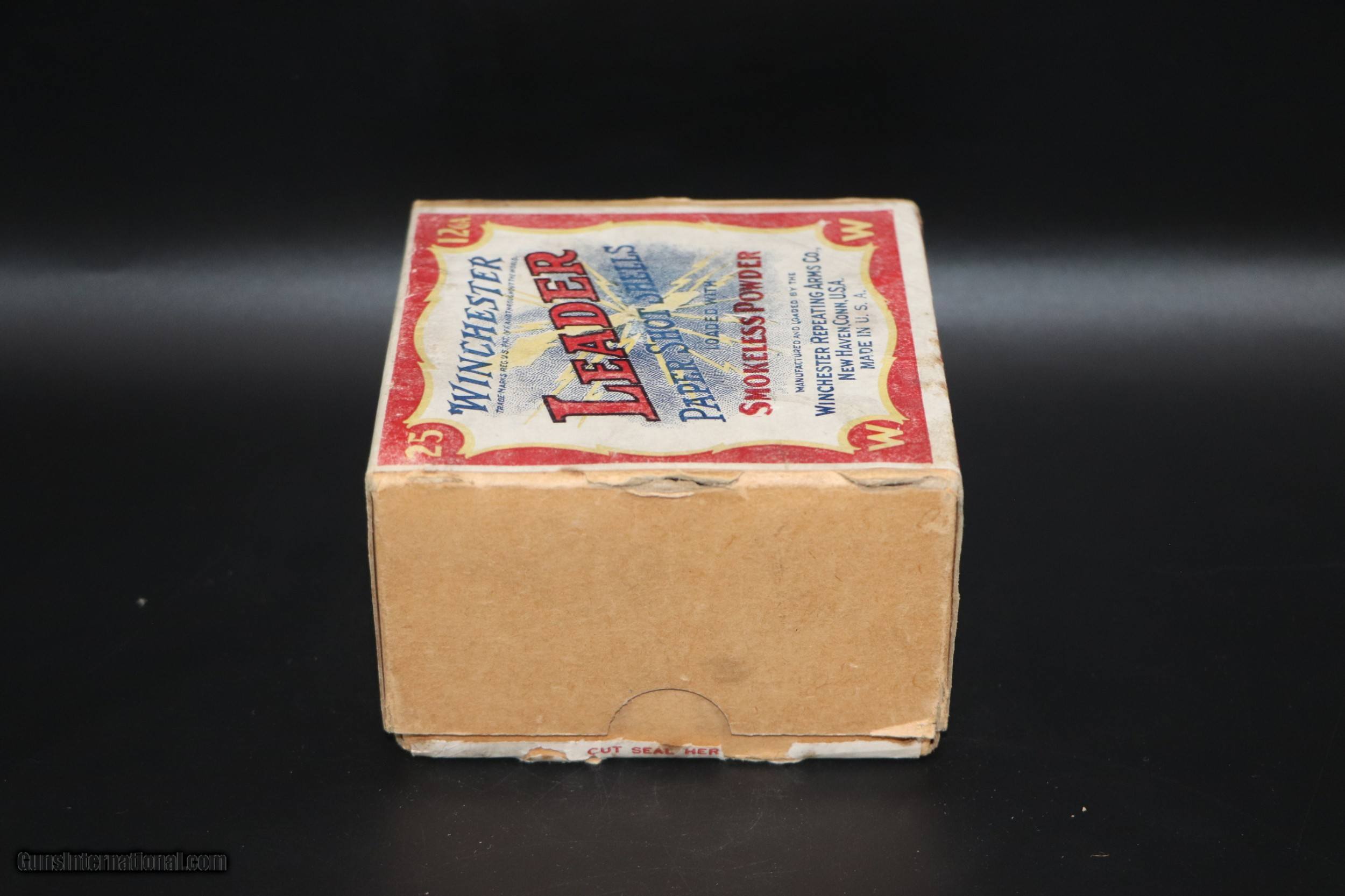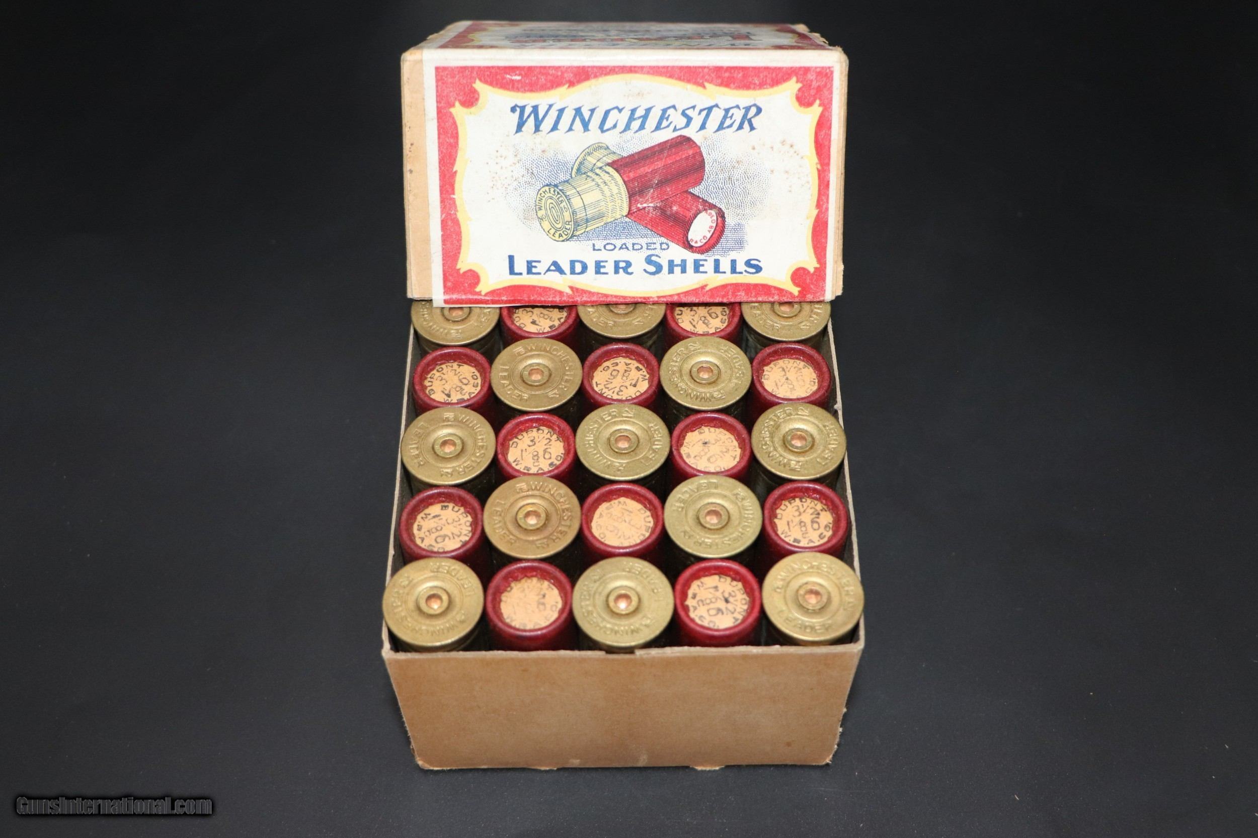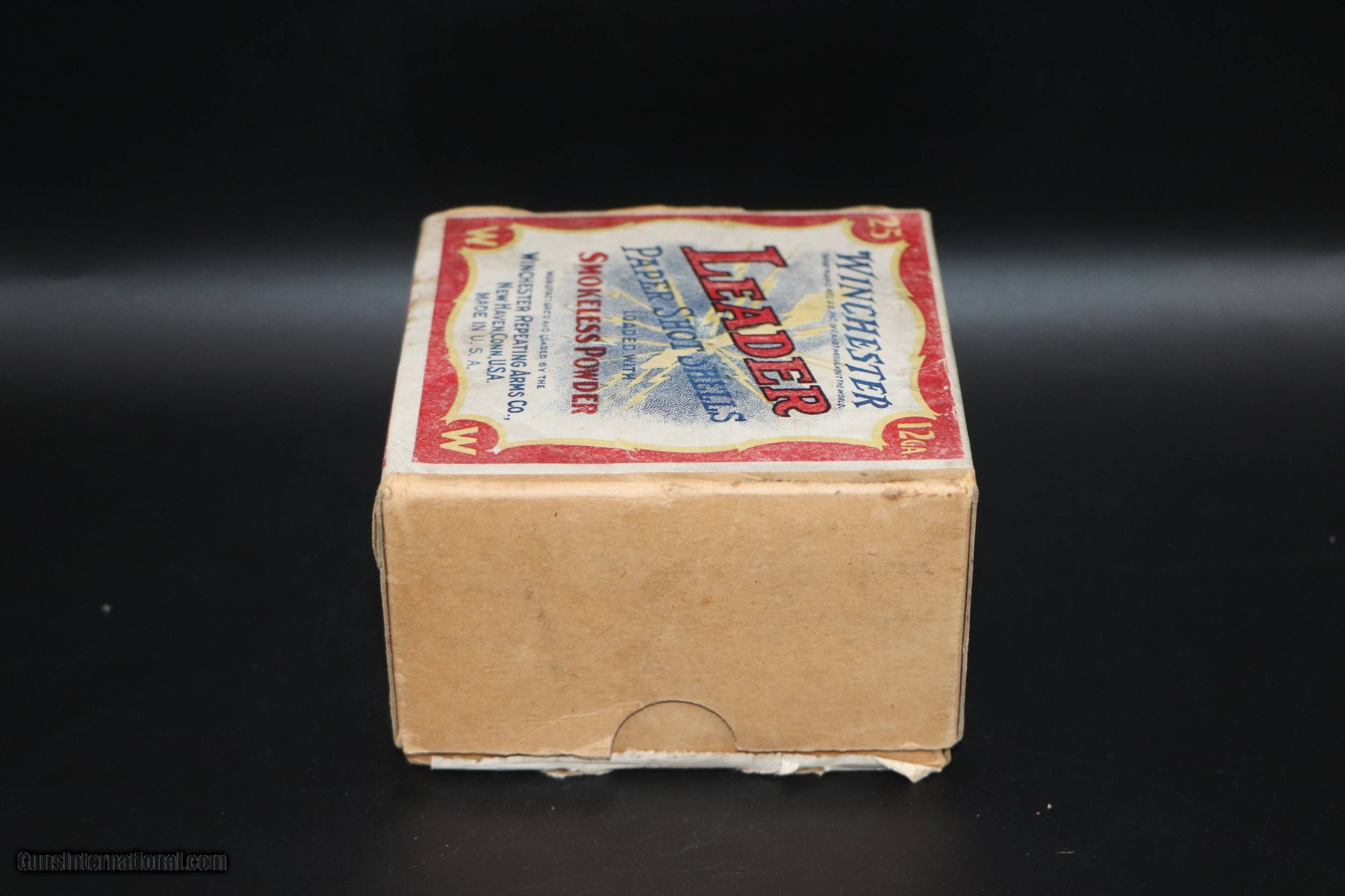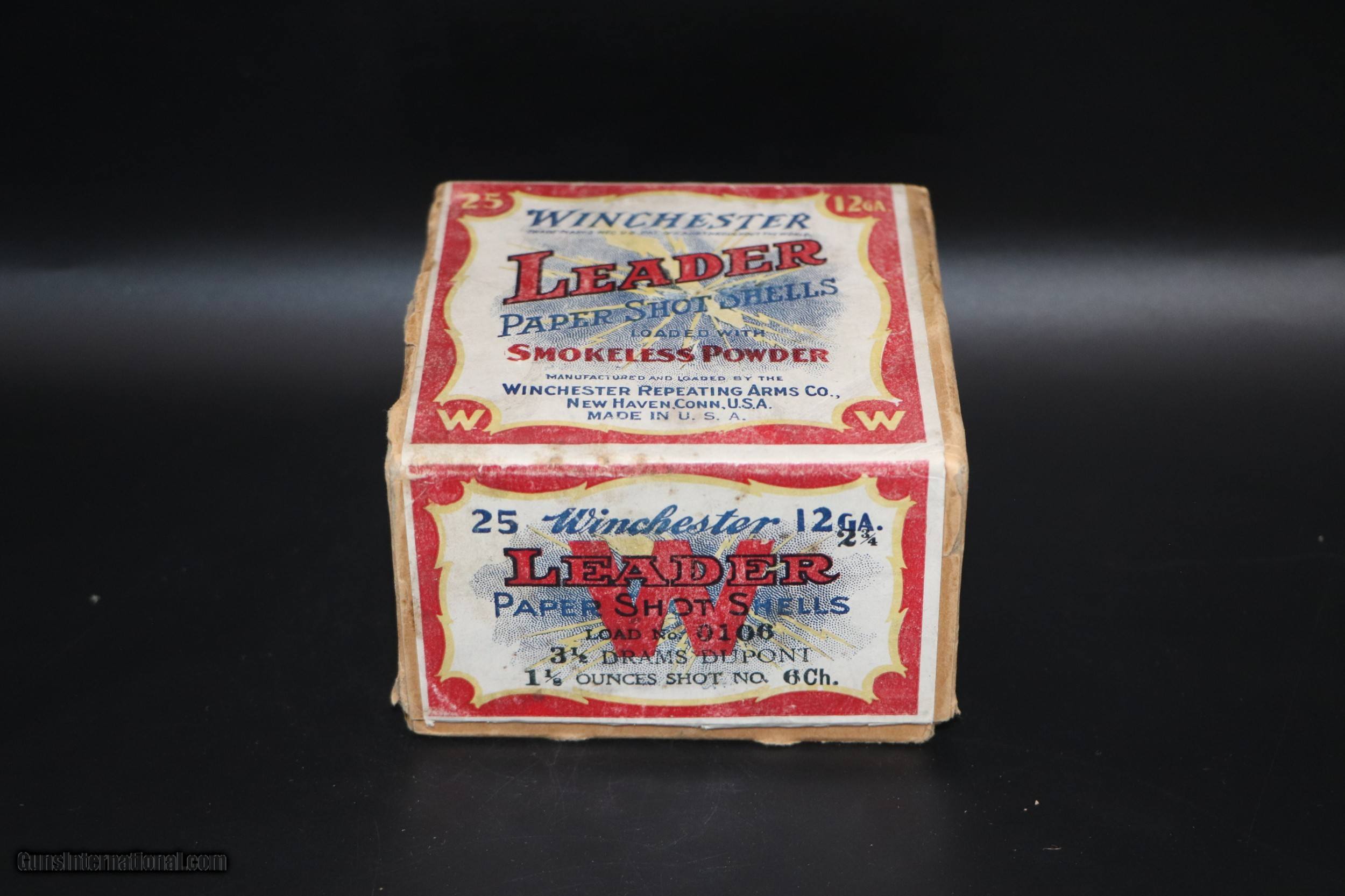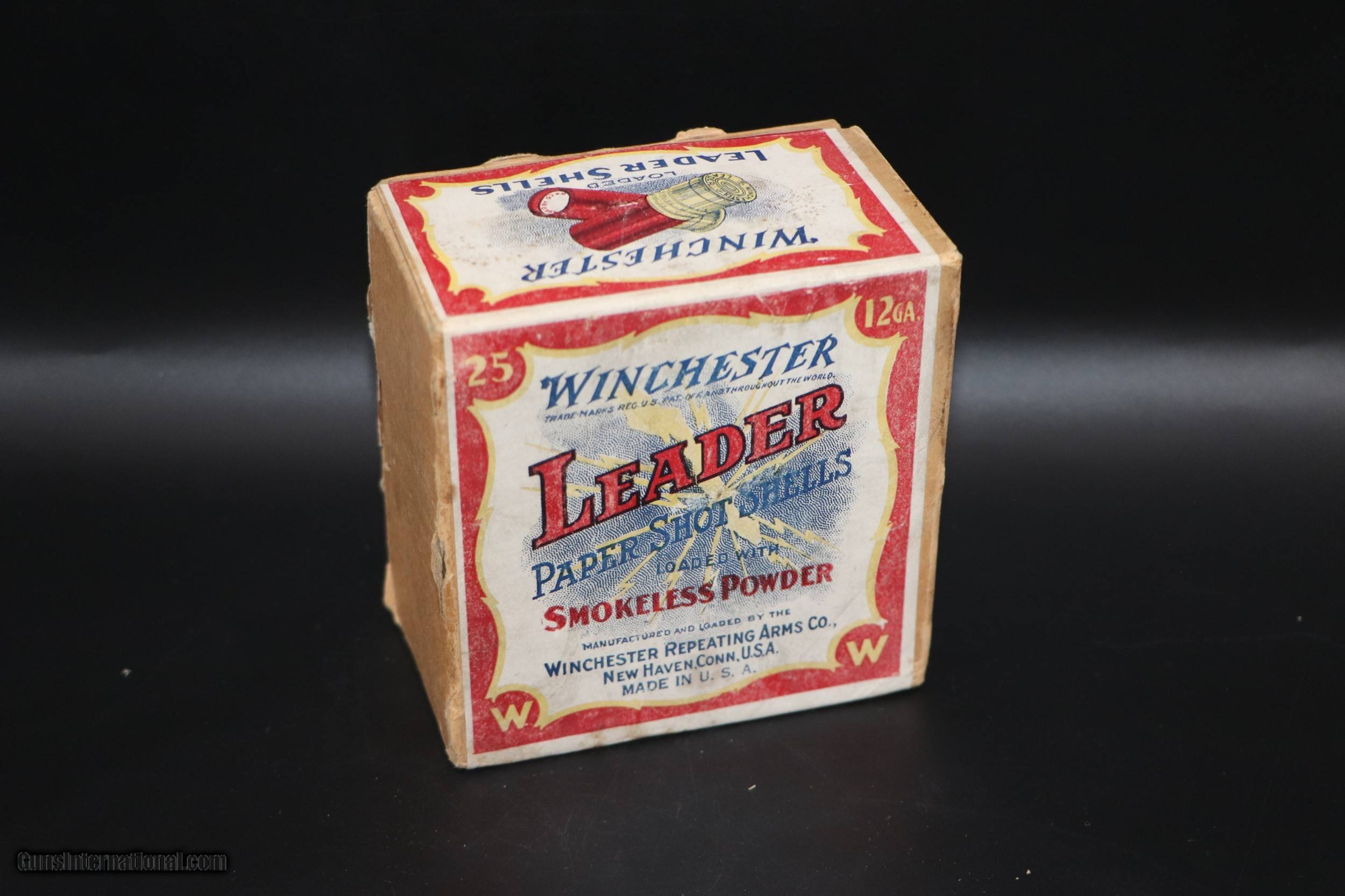 Description: Super Nice Full 2-Pc Box of Winchester Leader 12 Ga. Paper Shells. Box is Exc- with a small split on top half. Factory correct ammo is terrific. "Made in the USA" box from 20s/30s, Add $15.00 S+H SOLD Shotgun Gauge: 12 Gauge |