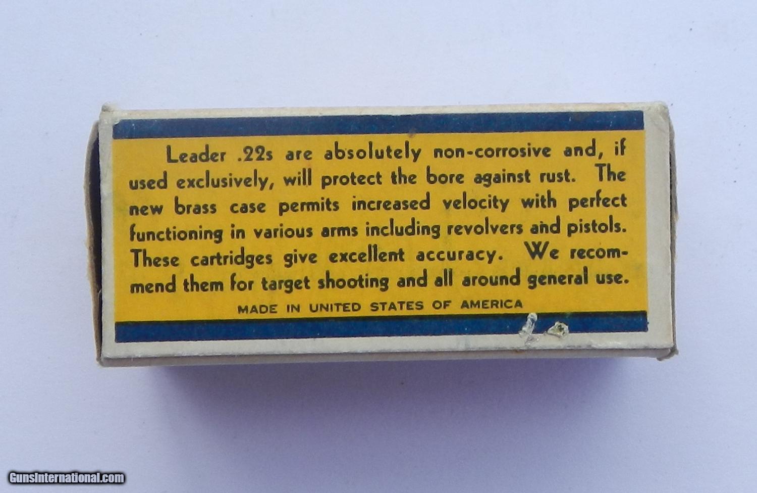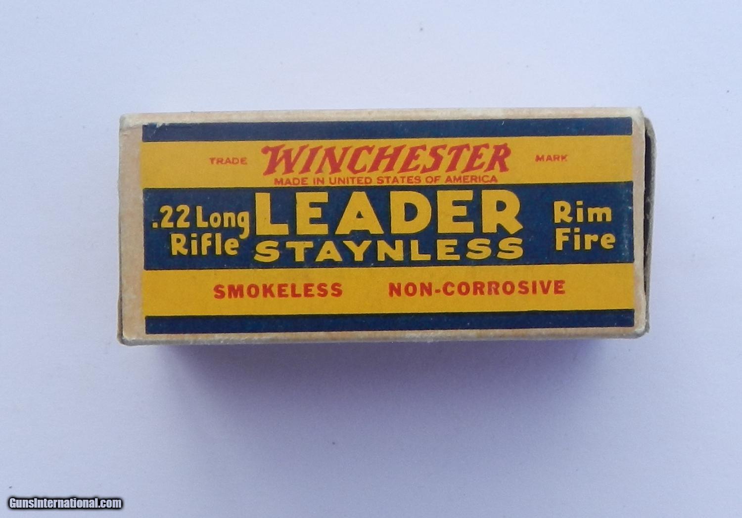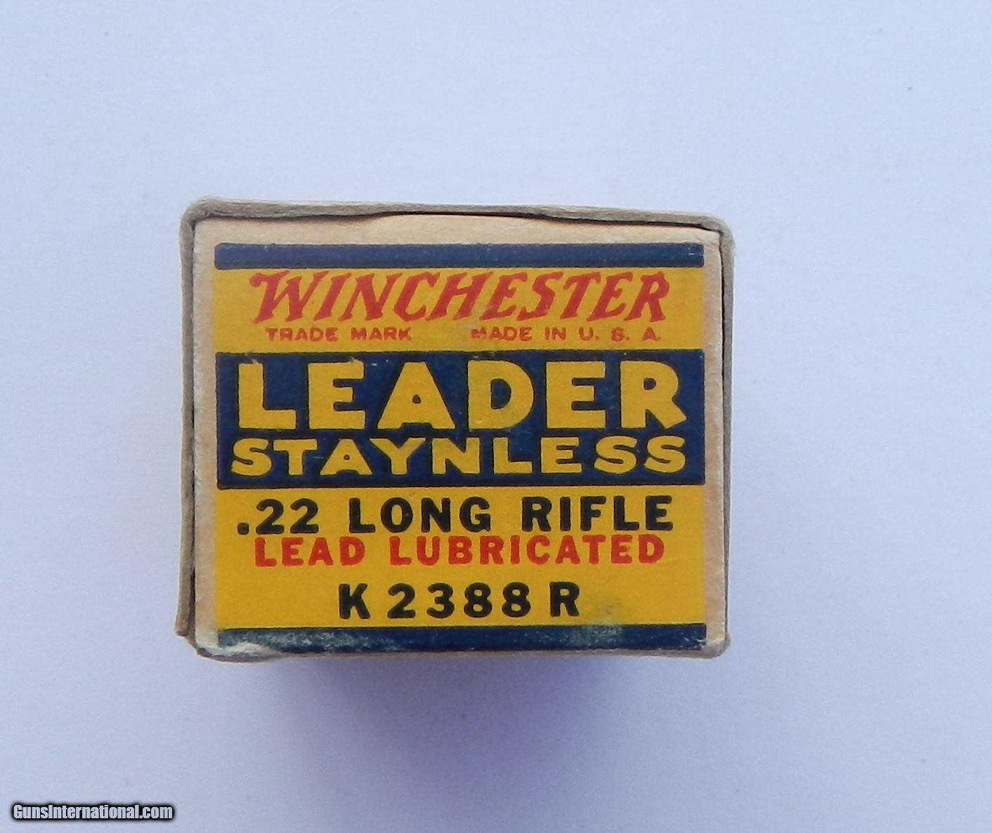Description: Full box of Winchester 22 Long Rifle Leader Staynless Lead Lubricated Box Code K2388R, late 1930's to early 1940's. Price does not include UPS ground shipping. Thanks SOLD |
