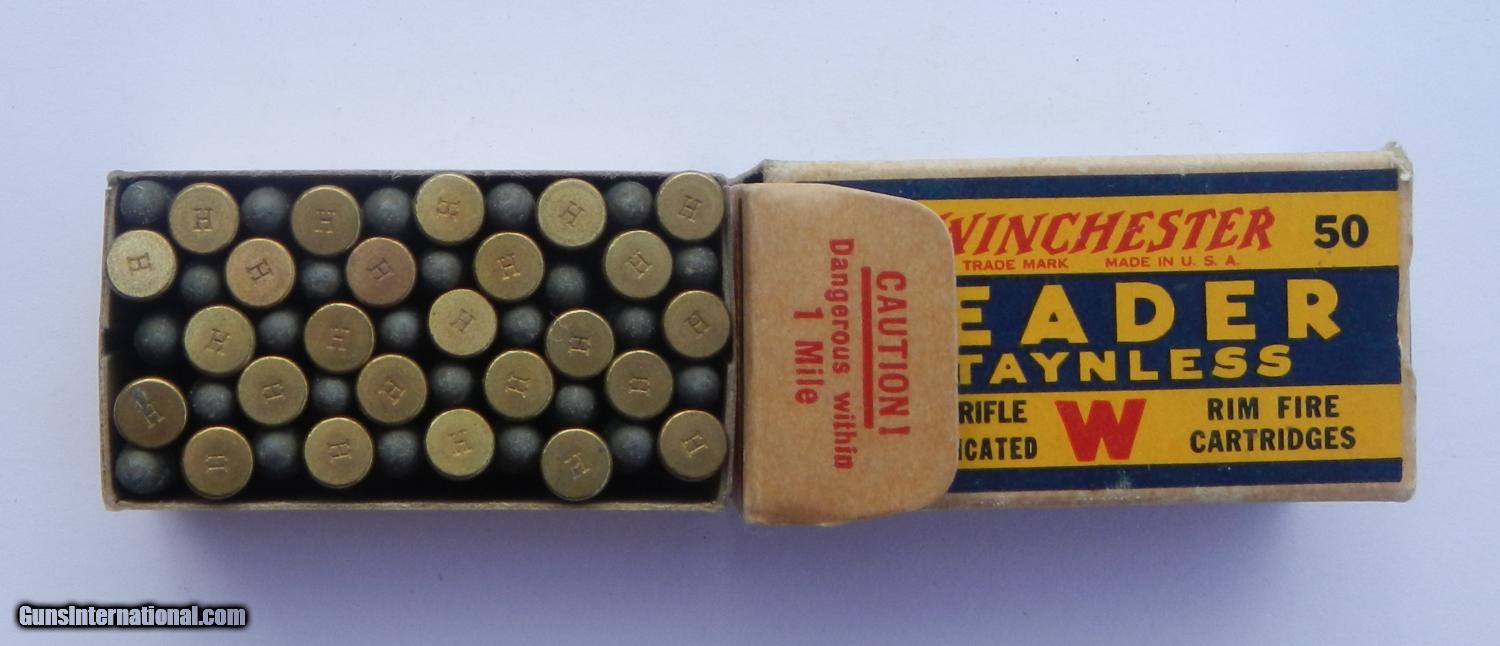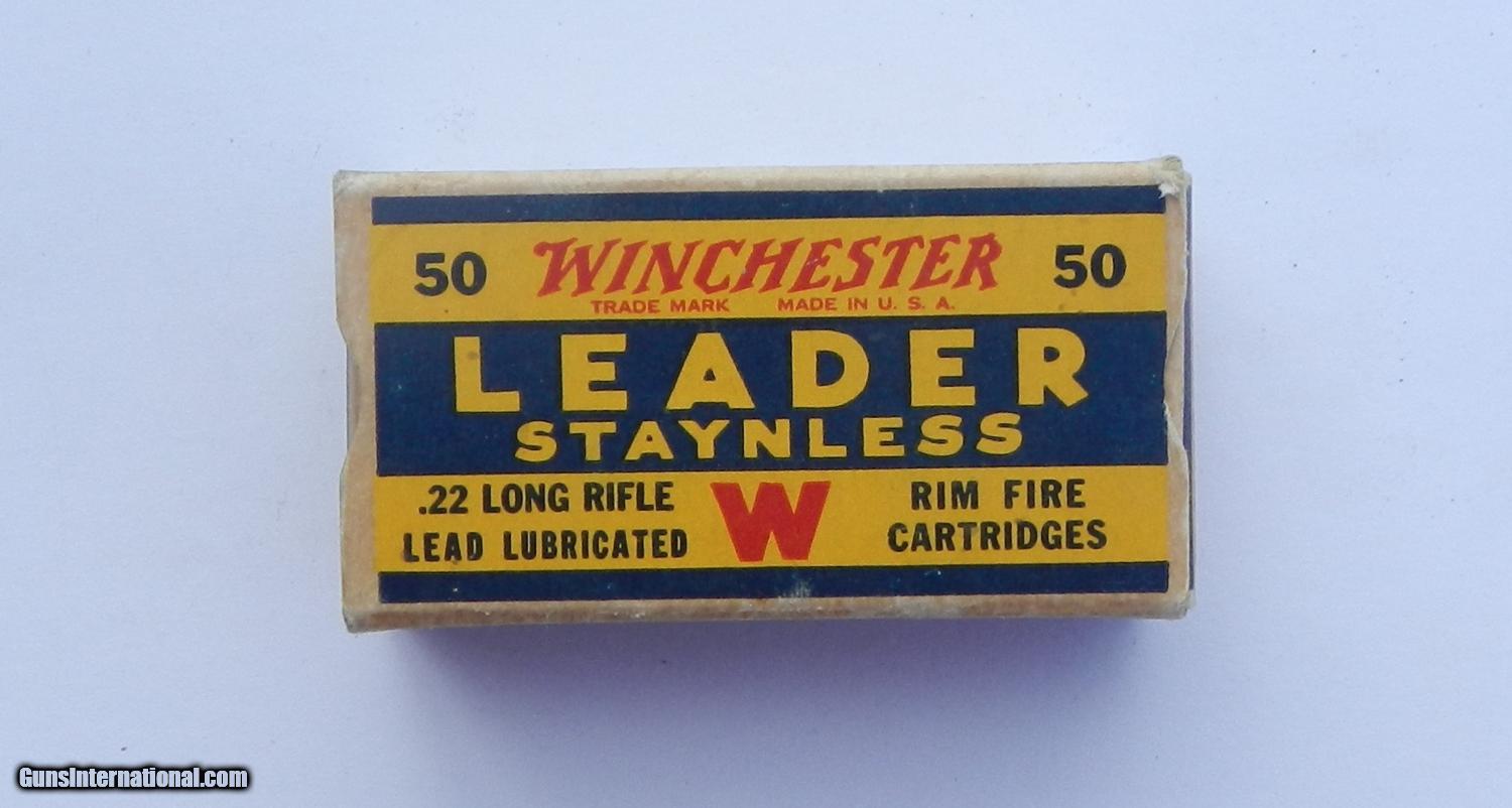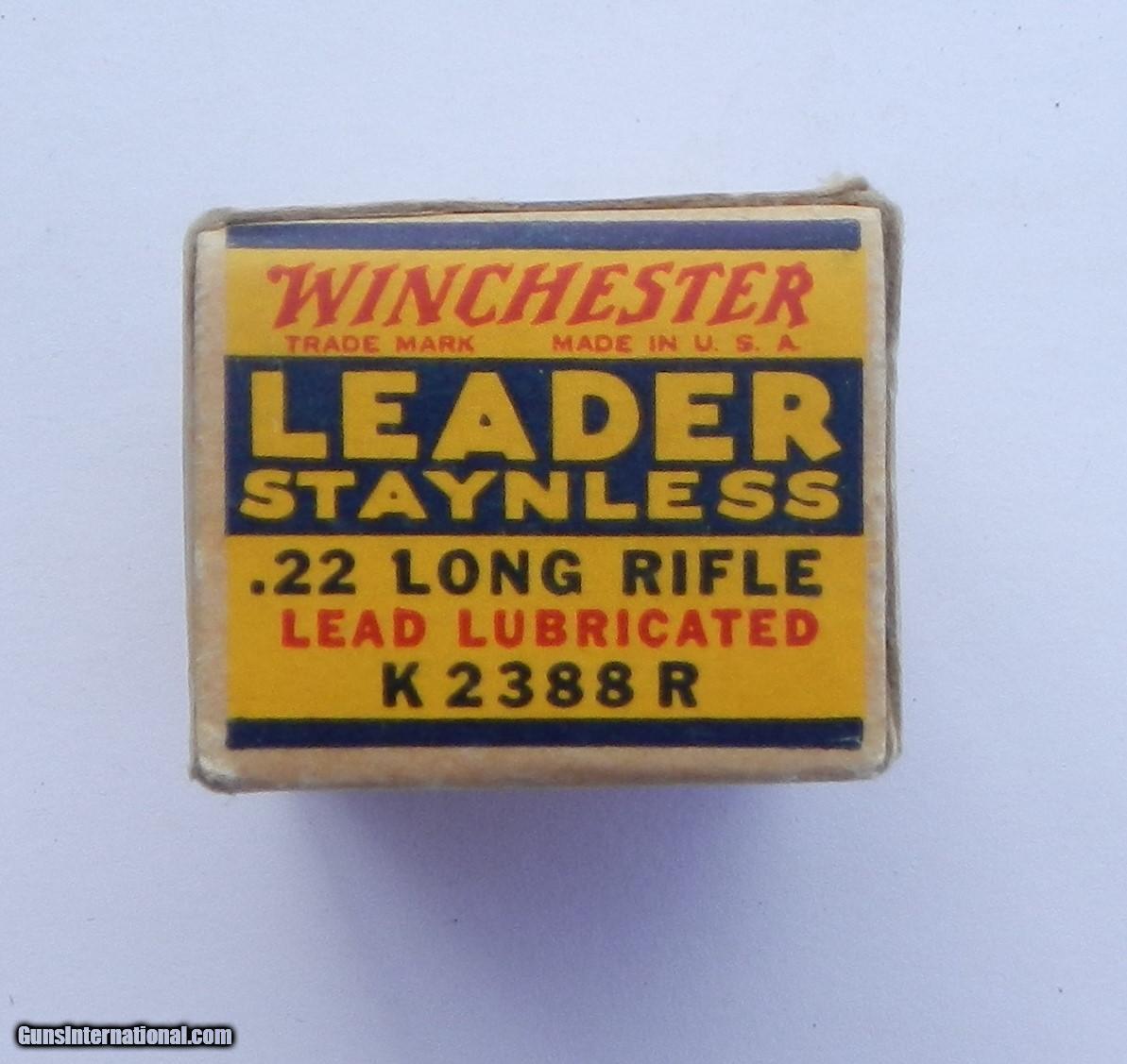 Description: Full box of Winchester 22 Long Rifle Leader Staynless Lead Lubricated Box Code K2388R, late 1930's to early 1940's. Price does not include UPS ground shipping. Thanks SOLD |