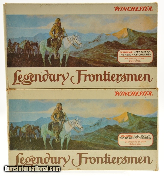 Description: This is a lot of two boxes, 39 original rounds, of .38-55 ammunition manufactured by Winchester with 255 Grain soft point bullets. The commemorative "Legendary Frontiersmen" boxes are in near excellent condition with some light edge wear. The cartridges are head stamped "LF 79" and in excellent condition. SOLD |