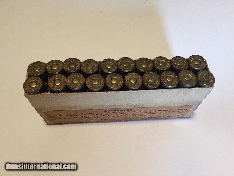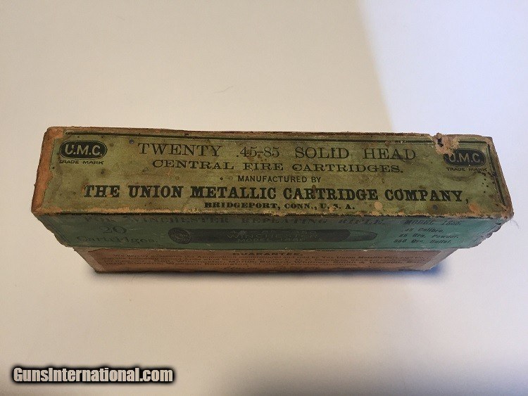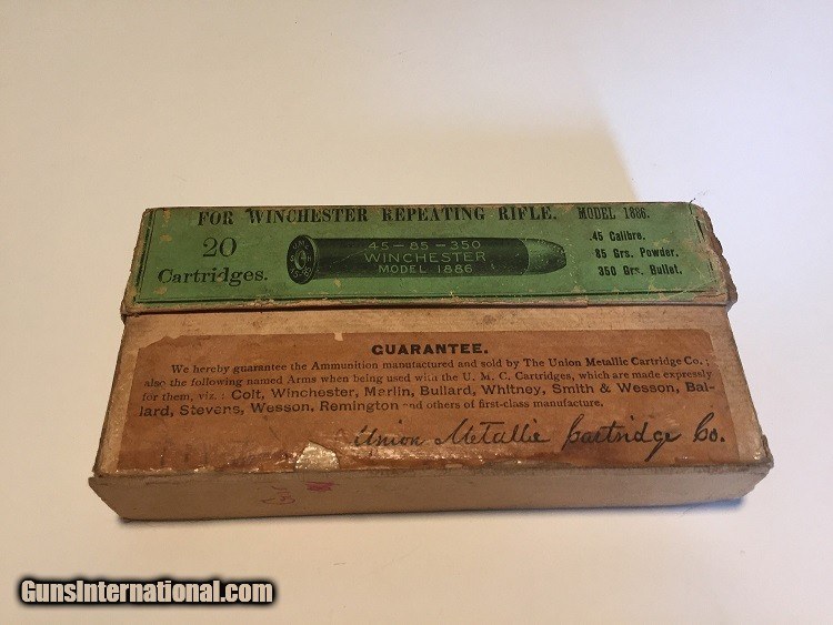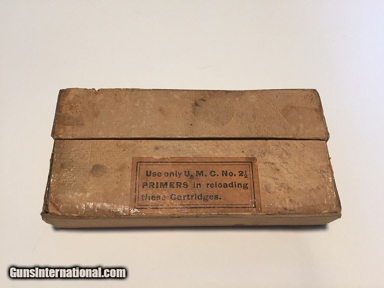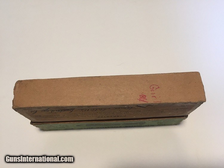 Description: Folks we had a death in the family of one of children so things have been very hectic here. If you have contacted us and we have not gotten back to you please contact or call us again. Winchester Model 1886 – Union Metallic Cartridge .45-85 - 2 P/C Box Full The box shows a small puncture hole on the top right of the box. The loading callout is: 85 grains of powder, Bullet 350 grains. The box contains (20) original cartridges headstamped “U.M.C. S H .45-85”. The cartridges are in very good. The box is in decent condition. Somebody attempted to do an old glue job and it’s not the greatest job. Refer to photos for condition Buyer pays actual shipping charges. Please do not hesitate to contact us if you should have any questions. SOLD |