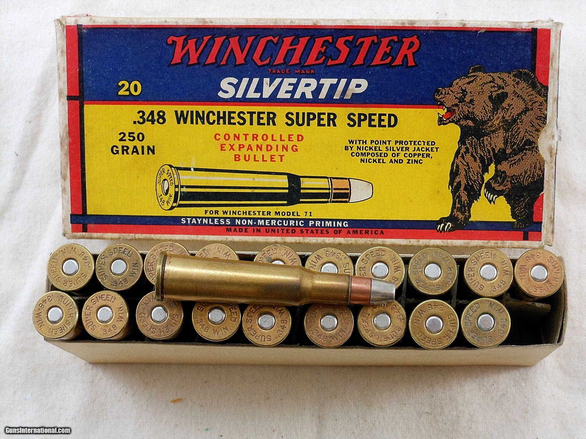Description: This is a full box of 250 grain Winchester ammunition. The shells are bright and clean. The box is in very fine condition. The graphics are bright and colorful with no loss. The end tabs are intact and not separated. These "Bear" boxes are highly collectable for the collector! Search for hlvfineguns on google. BBK F. No. 295 -16 SOLD |