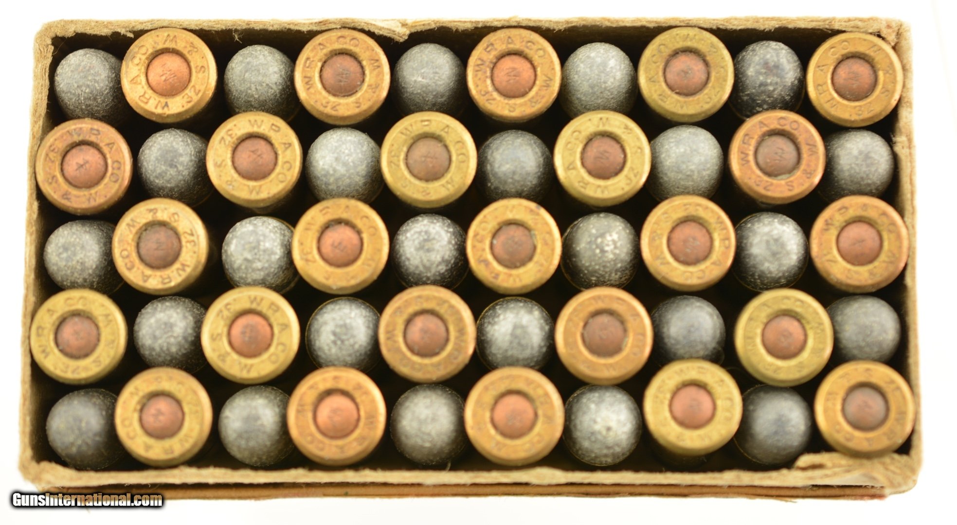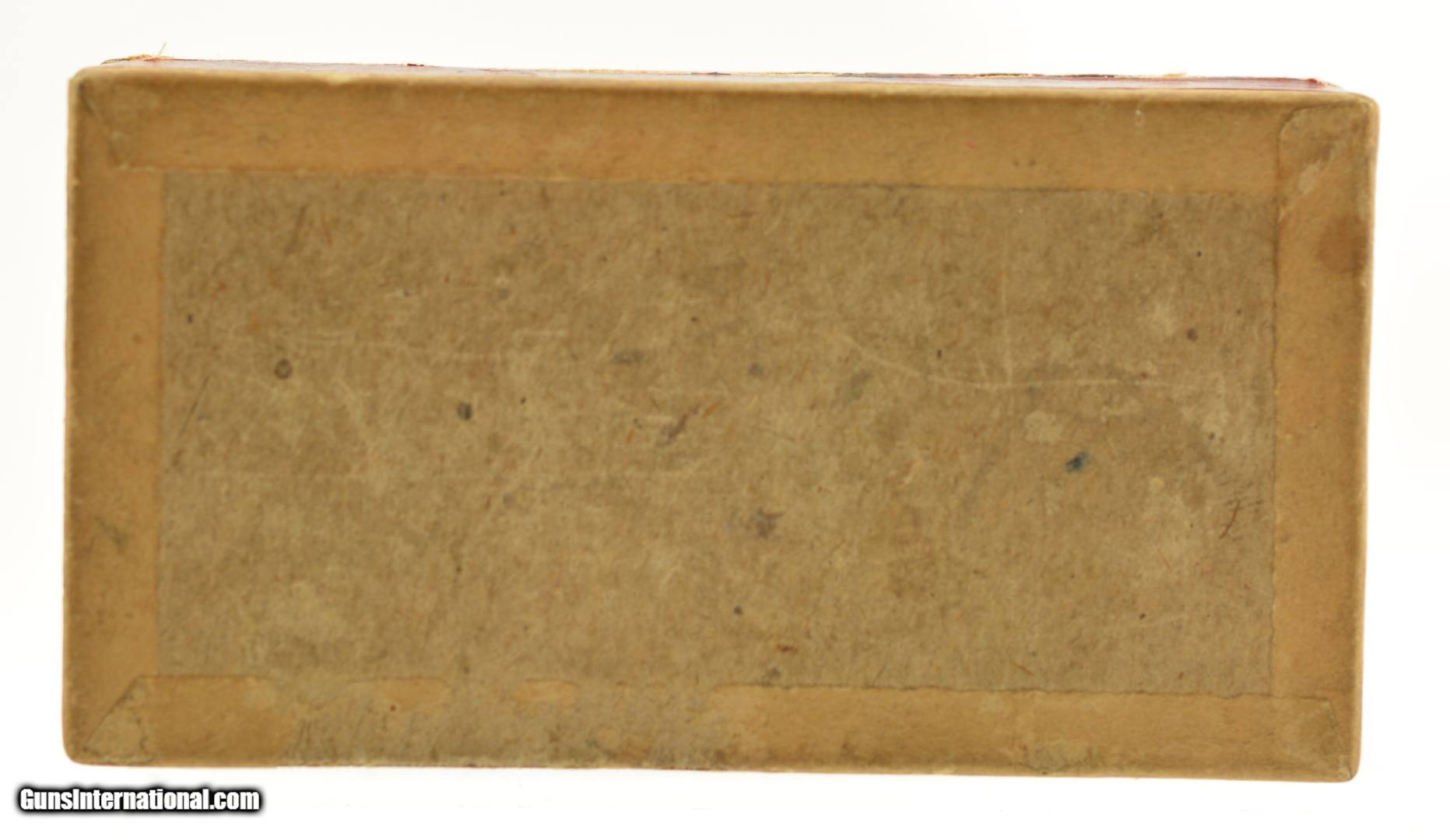 Description: This is a full box, 50 original rounds, of smokeless .32 S&W ammunition manufactured by Winchester. The two piece red and black "Picture Box" has a very nice cut of a Smith & Wesson revolver and call out for the S&W company. The box is a solid with excellent edges and corners with light wear, vivid colors, slight staining and scuffs. The cartridges are in excellent condition and appear native to the box. A great example of a Winchester box in a non-Winchester caliber. SOLD |