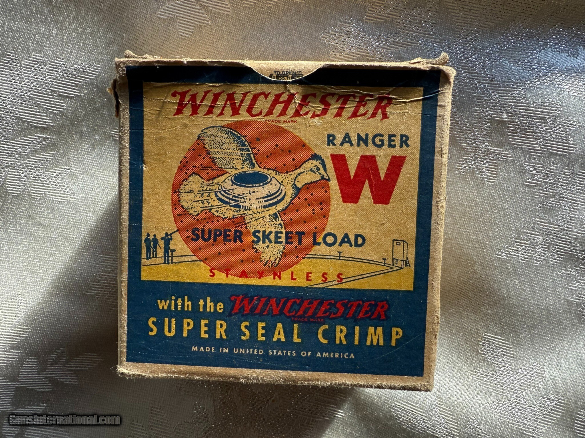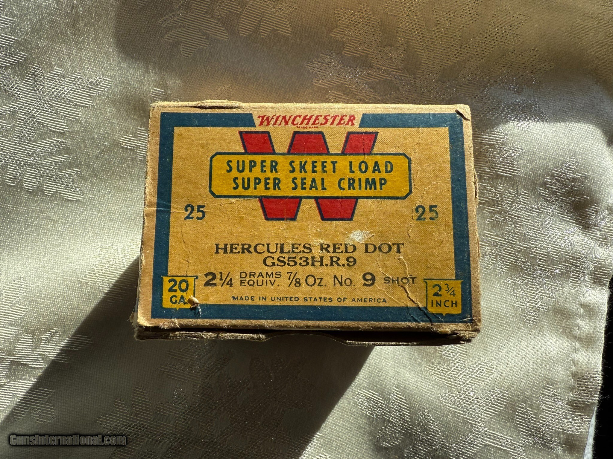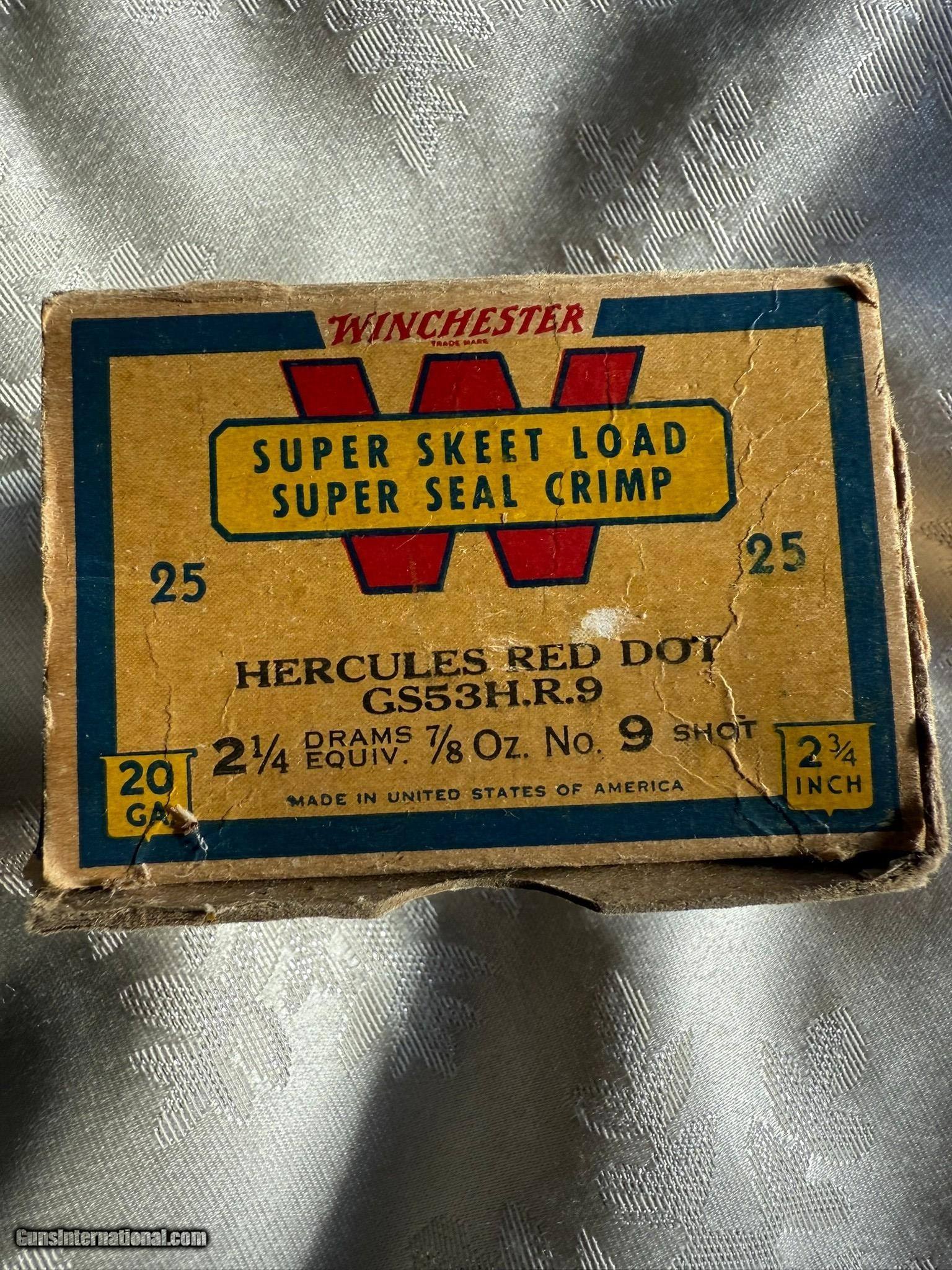 Description: Winchester Ranger Super Skeet Load, 2 1/4 Dram, 7/8 oz No. 9 Hercules Red Dot.15 shells are in the box. The box in good condition with wear showing on all corners. Flats are all in place. Paper shells are excellent. Shotgun Gauge: 20 Gauge Price: $200.00 Shipping: $20.00 Pay with