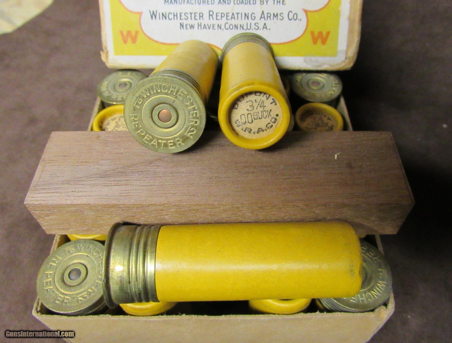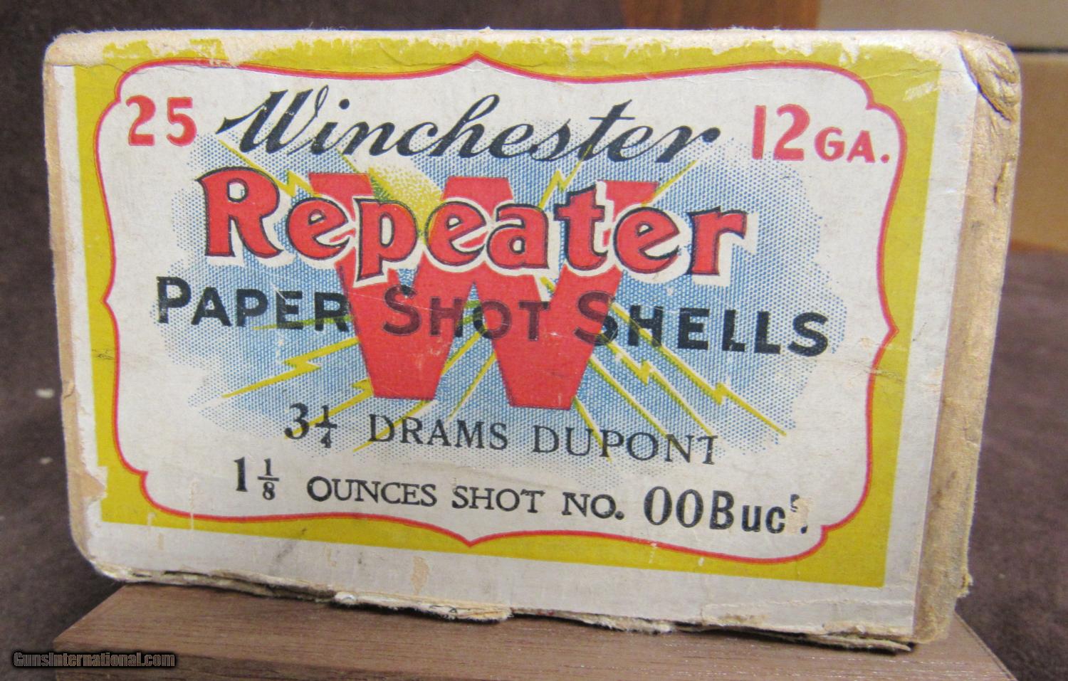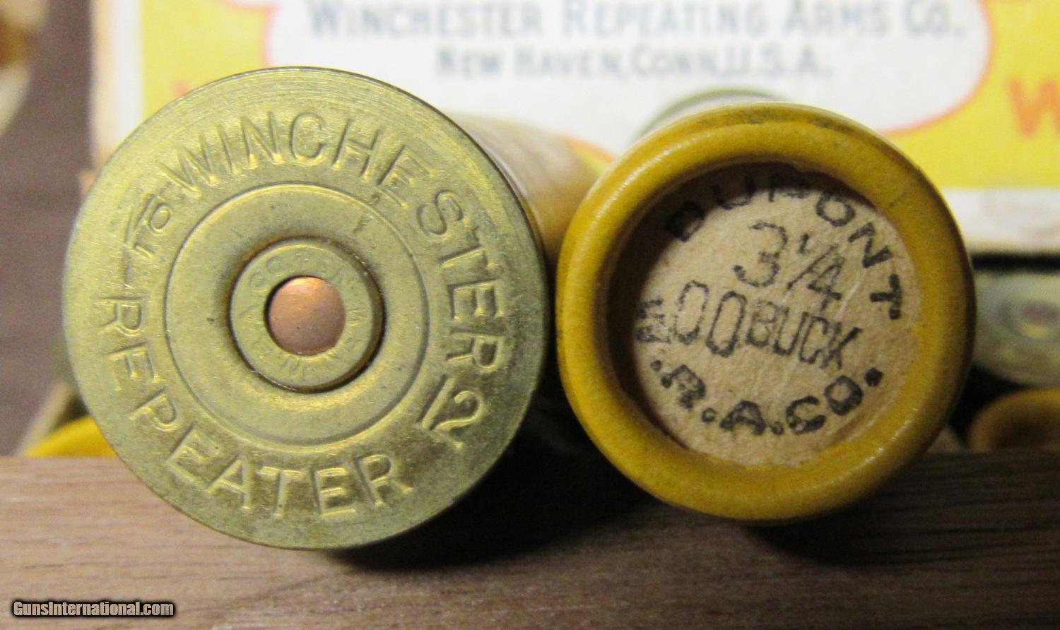 Description: Sale Pending. Selling a full box of 25 Winchester Repeater 12 gauge 3 ¼ DE 1 1/8 Ounces of 00 Buck shells. Head stamped: “WINCHESTER REPEATER No 12”, primer is marked: “W.R.A. CO. NEW No. 4” and top card is marked: “W.R.A.CO. DUPONT 3 ¼ 00 BUCK”. Shells and box are in excellent condition. $120.00 SOLD. SOLD |
