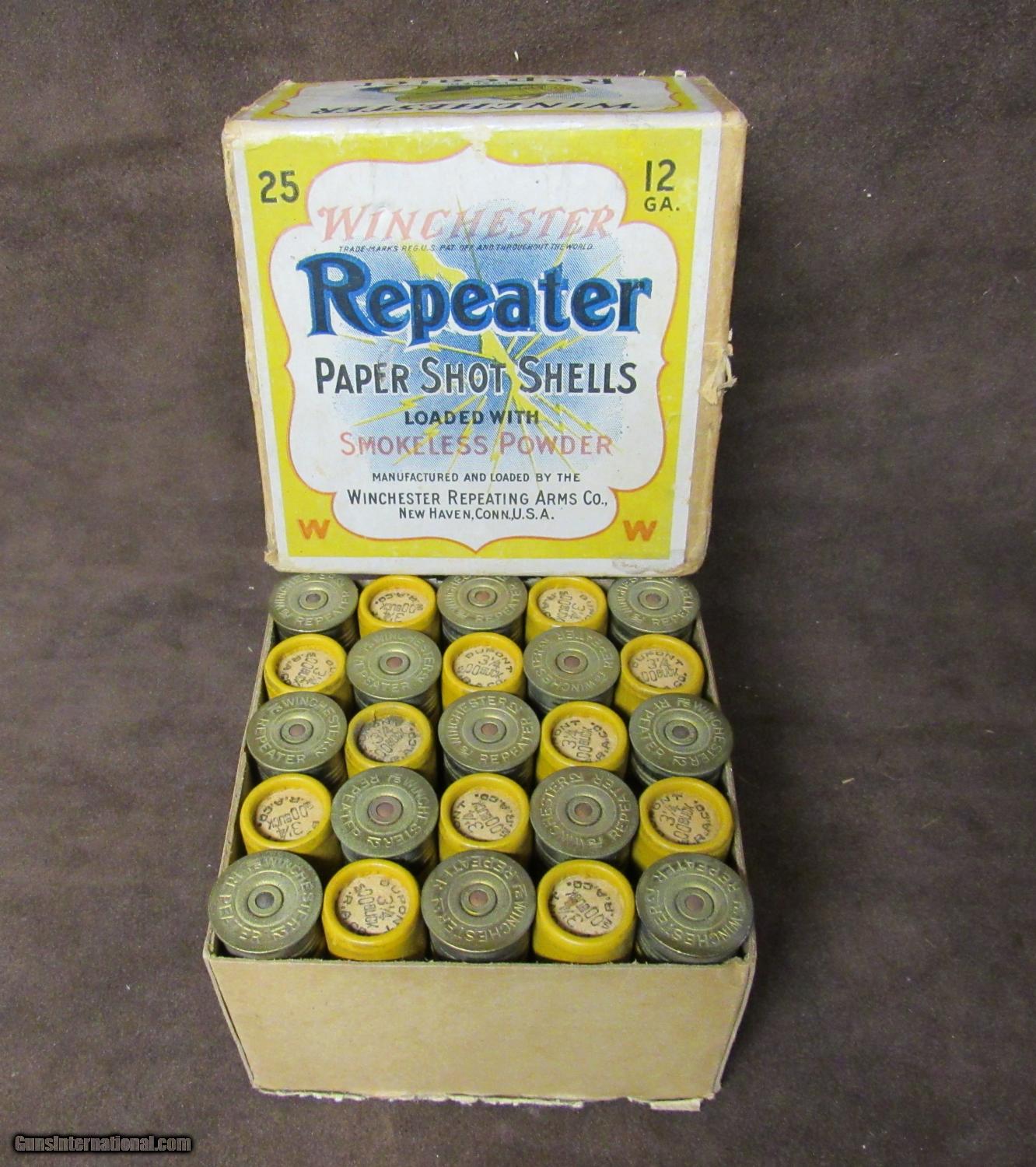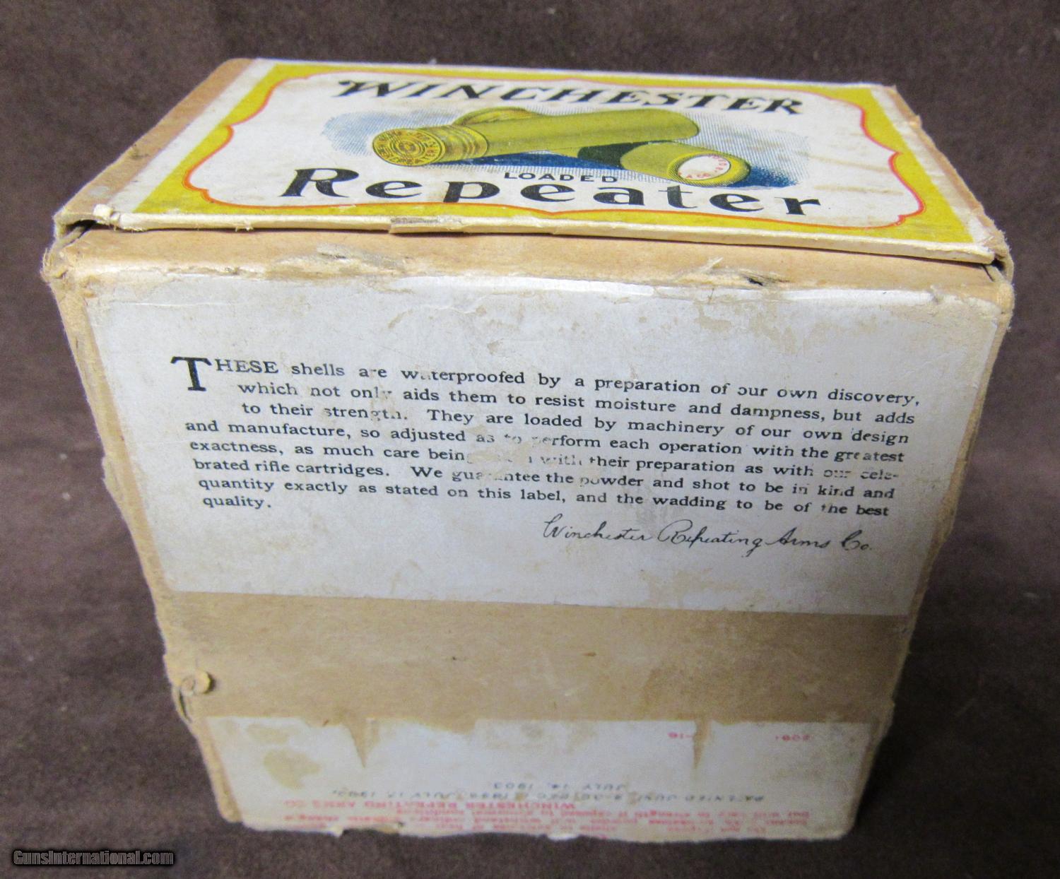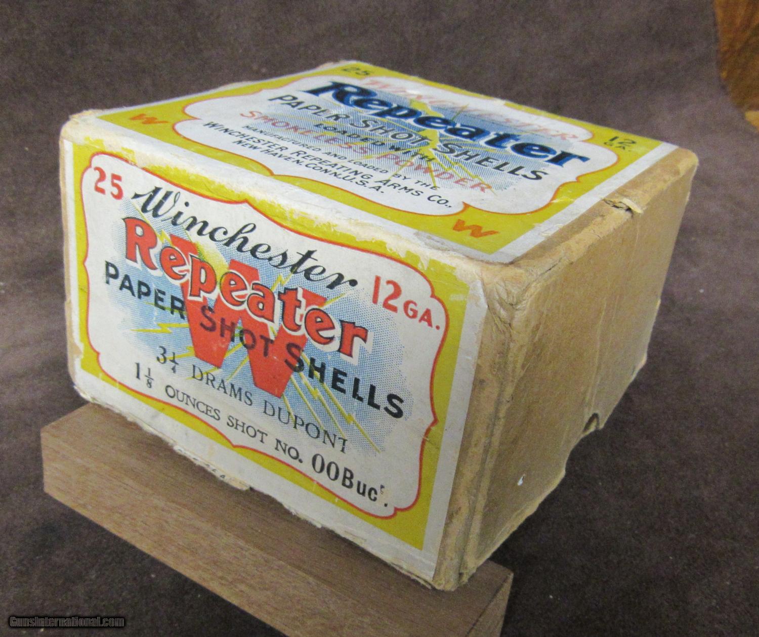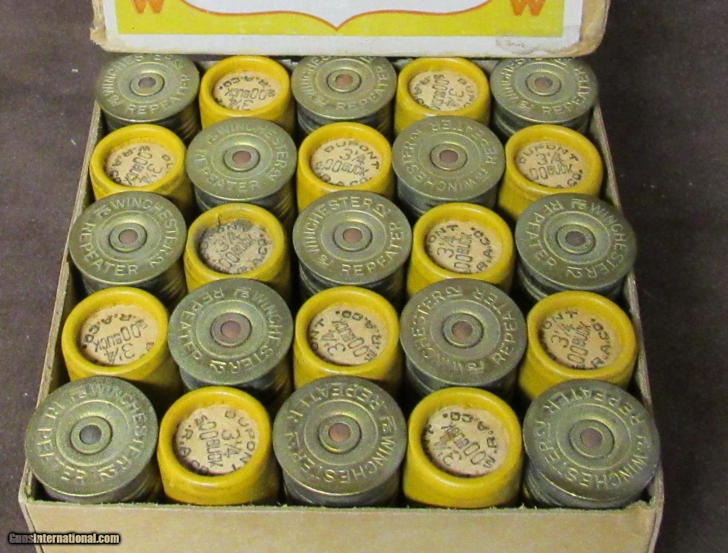 Description: Sale Pending. Selling a full box of 25 Winchester Repeater 12 gauge 3 ¼ DE 1 1/8 Ounces of 00 Buck shells. Head stamped: “WINCHESTER REPEATER No 12”, primer is marked: “W.R.A. CO. NEW No. 4” and top card is marked: “W.R.A.CO. DUPONT 3 ¼ 00 BUCK”. Shells and box are in excellent condition. $120.00 SOLD. SOLD |