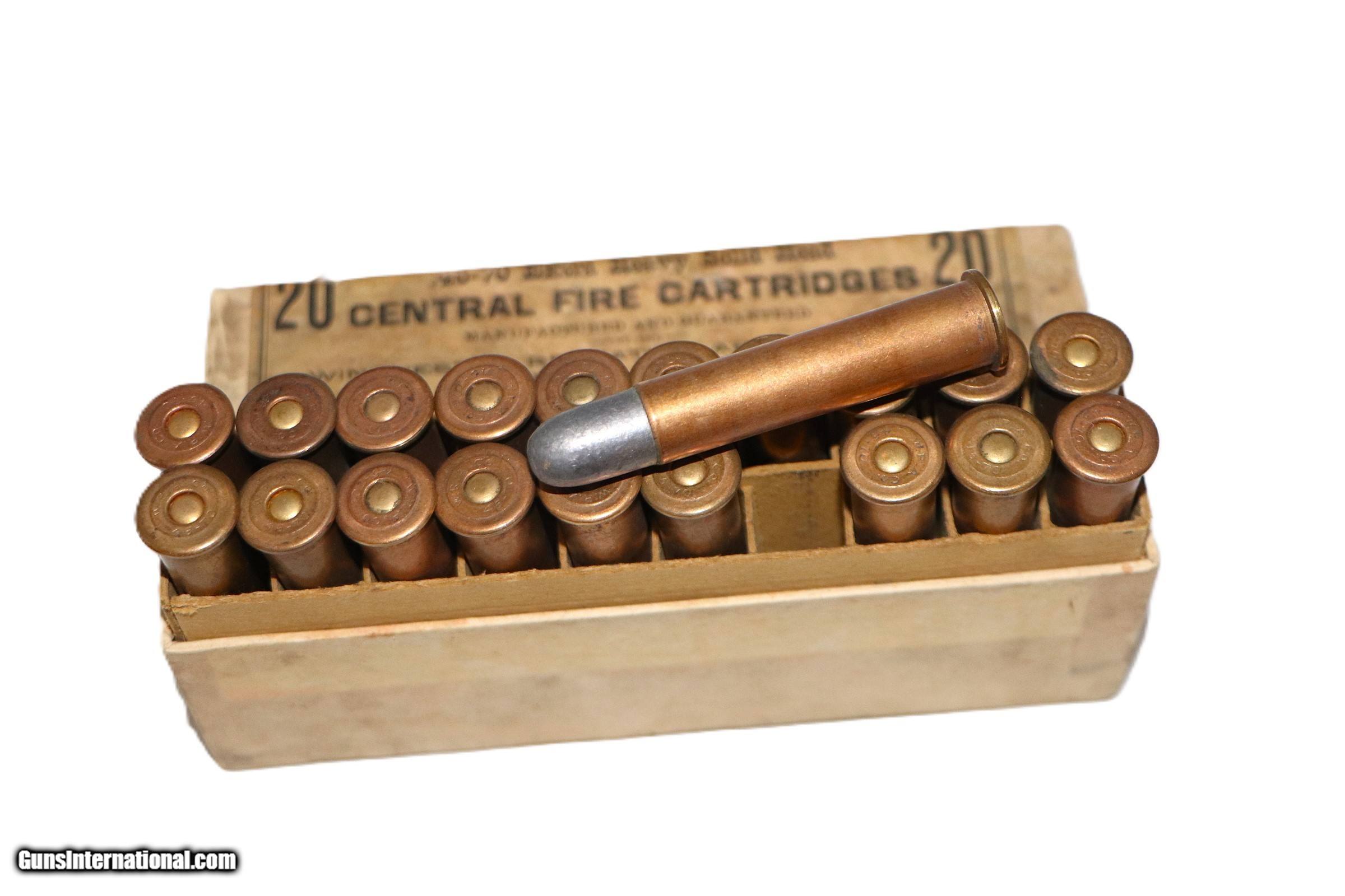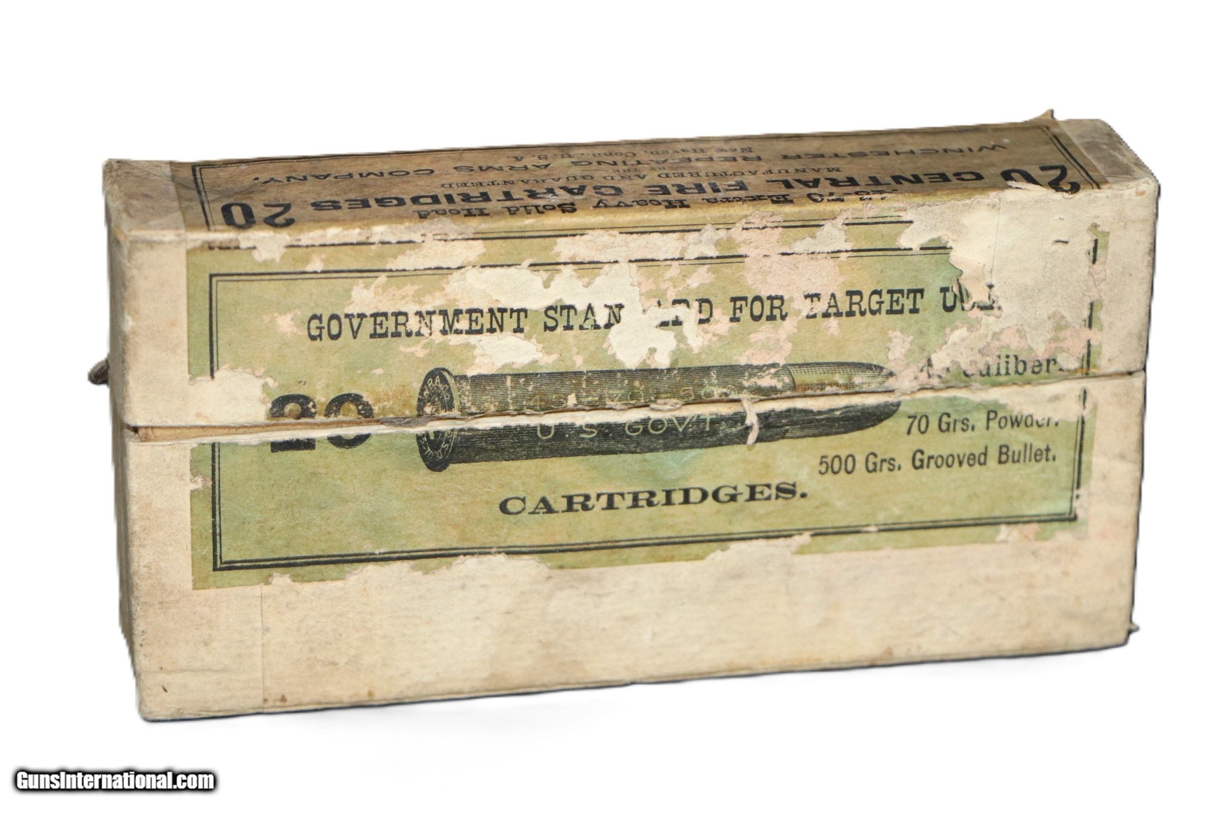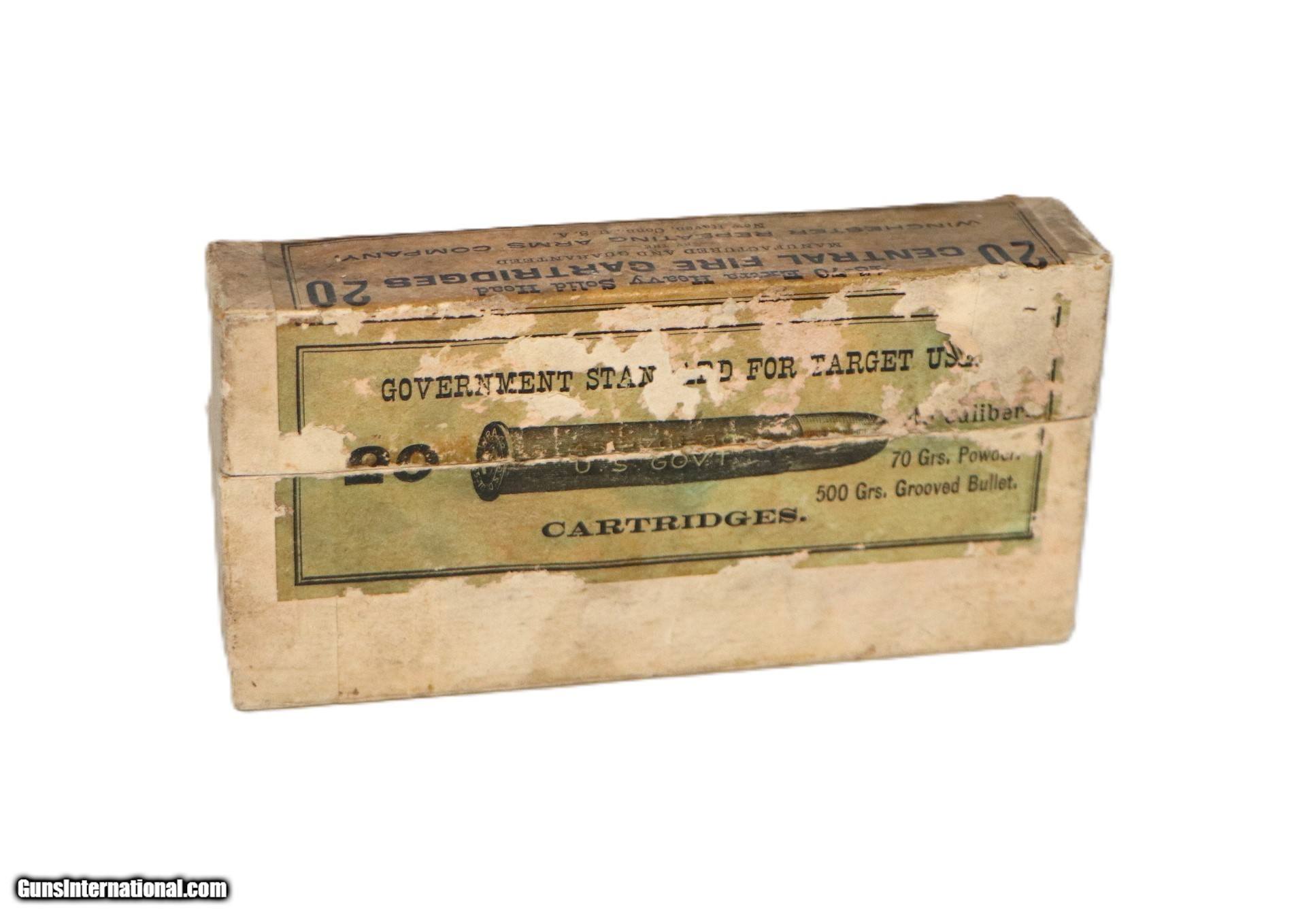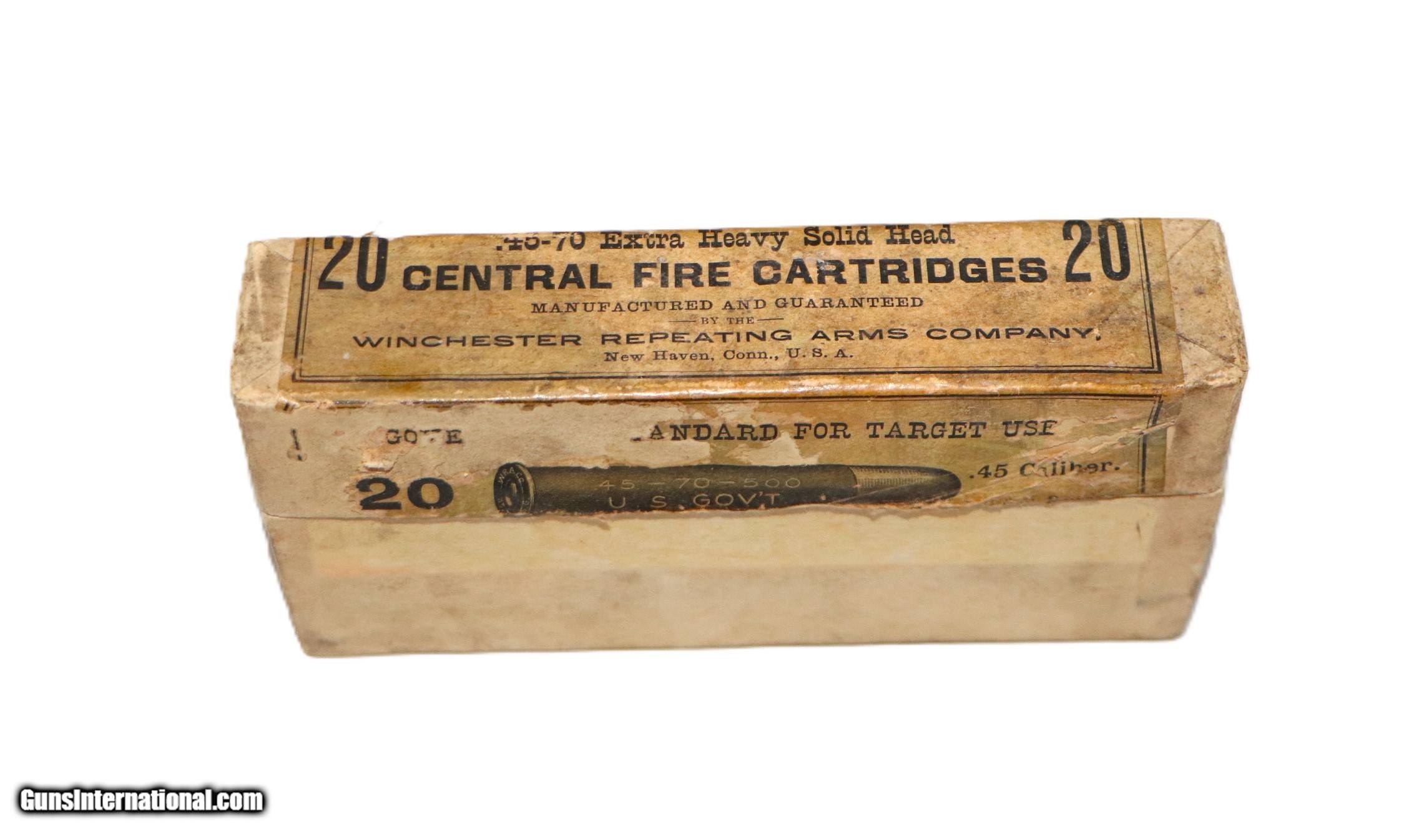 Description: Winchester Repeating Arms Co., 45-70-500. Solid Head, 20 Excellent Rounds. Box Fair-Good with heavy label scuffing, edge and corner wear. Add $17.50 S+H SOLD Rifle Caliber: .45-70 Government |