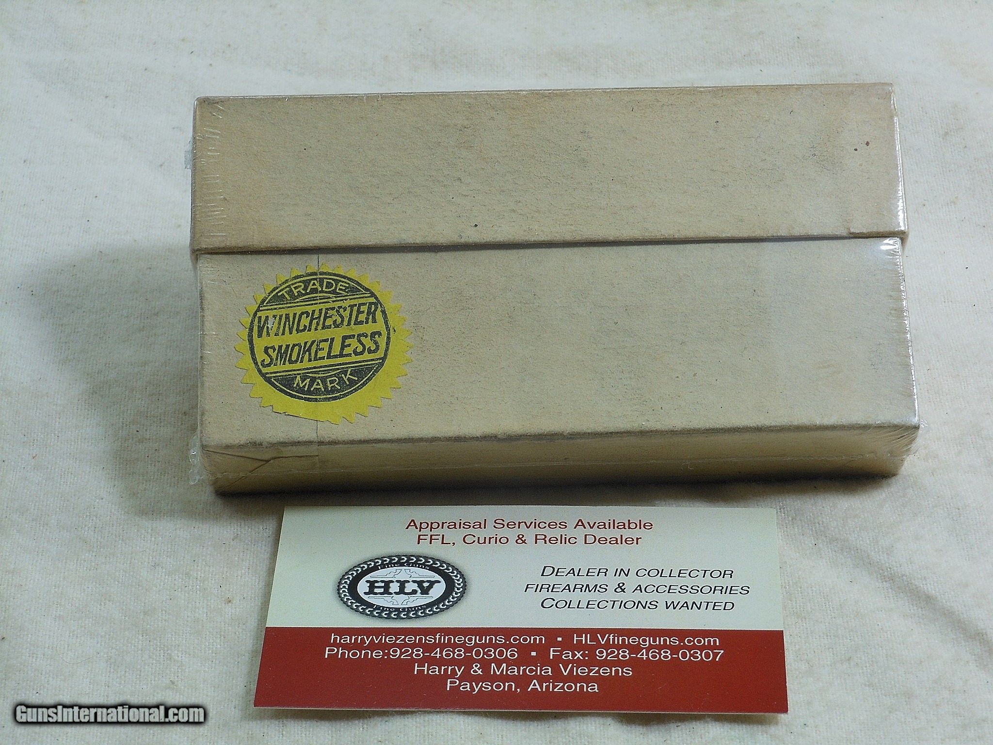 Description: This is a full box of original shells. These shells are loaded with 100 grain lead bullets. These shells are for the Winchester Model 1894 30 W.C.F. (30-30 Win.) rifles and carbines. This two piece box is in near new condition. The labels are bright and clean. The box is very fine with no damage. "It has the sunburst" label on the back of the box. This is a rare loading to find today! This is a very collectable box with the red label and being a two piece box. BBA (5) F. No. 549 -21 SOLD Rifle Caliber: .30-30 Winchester |