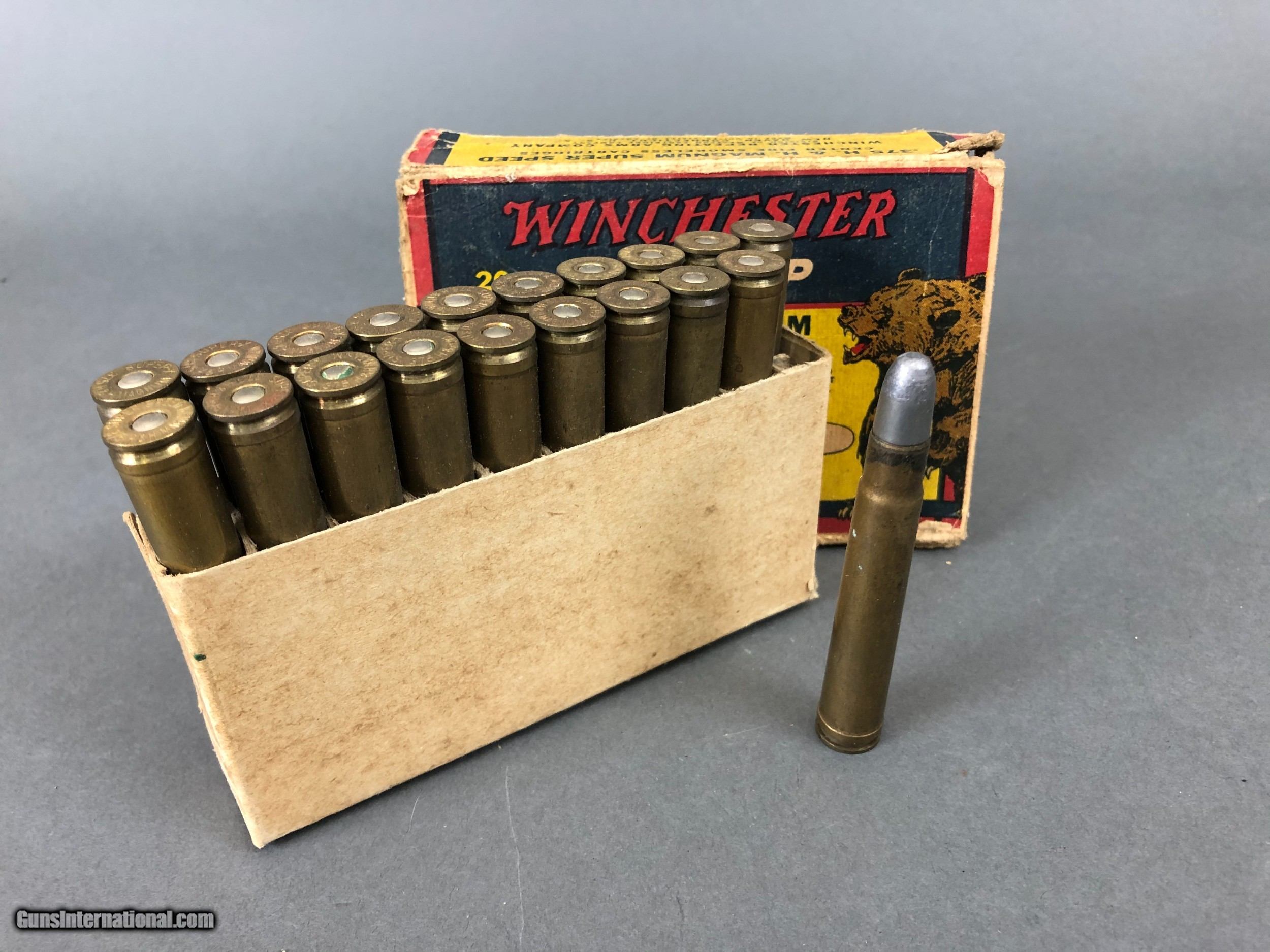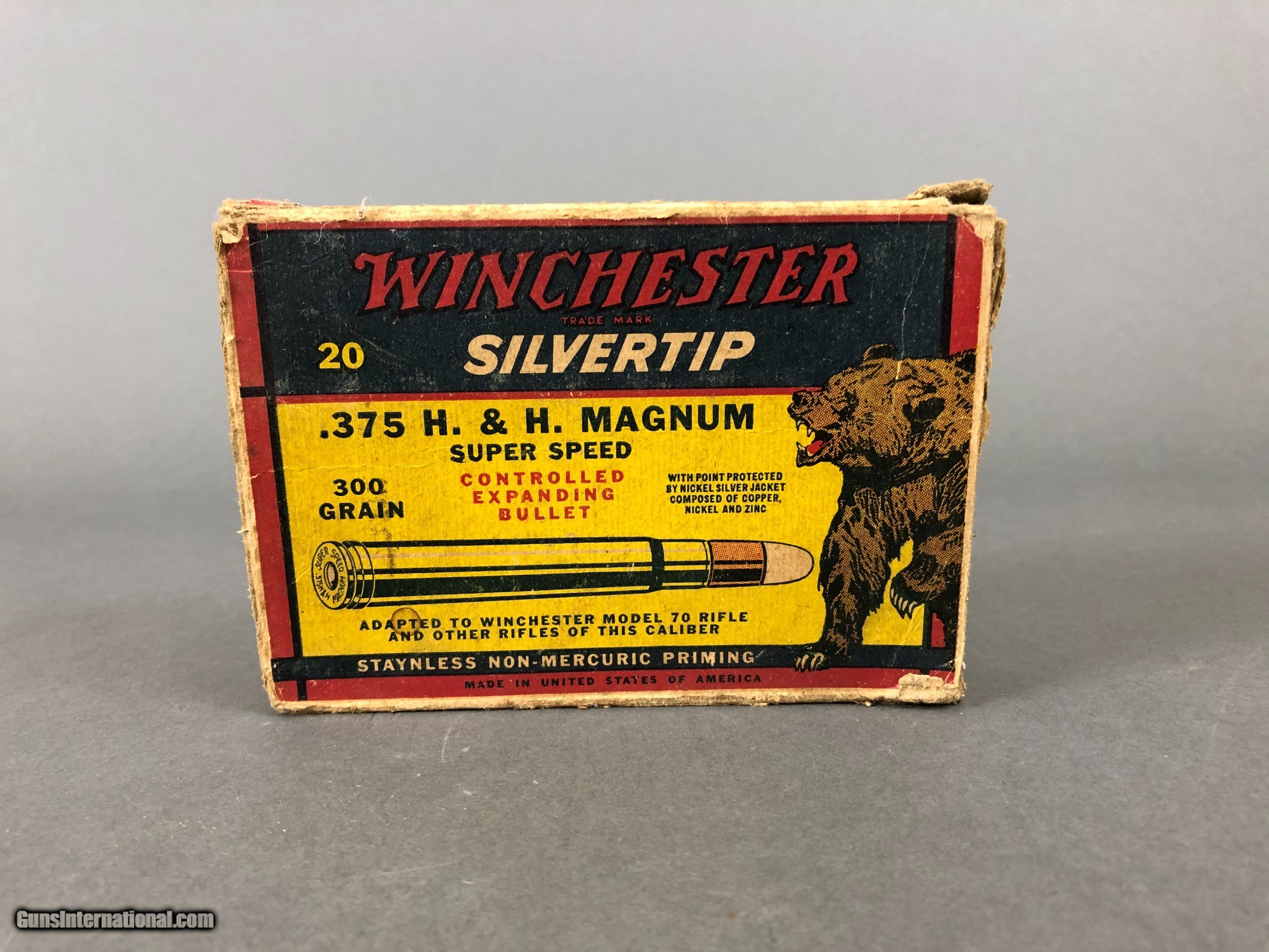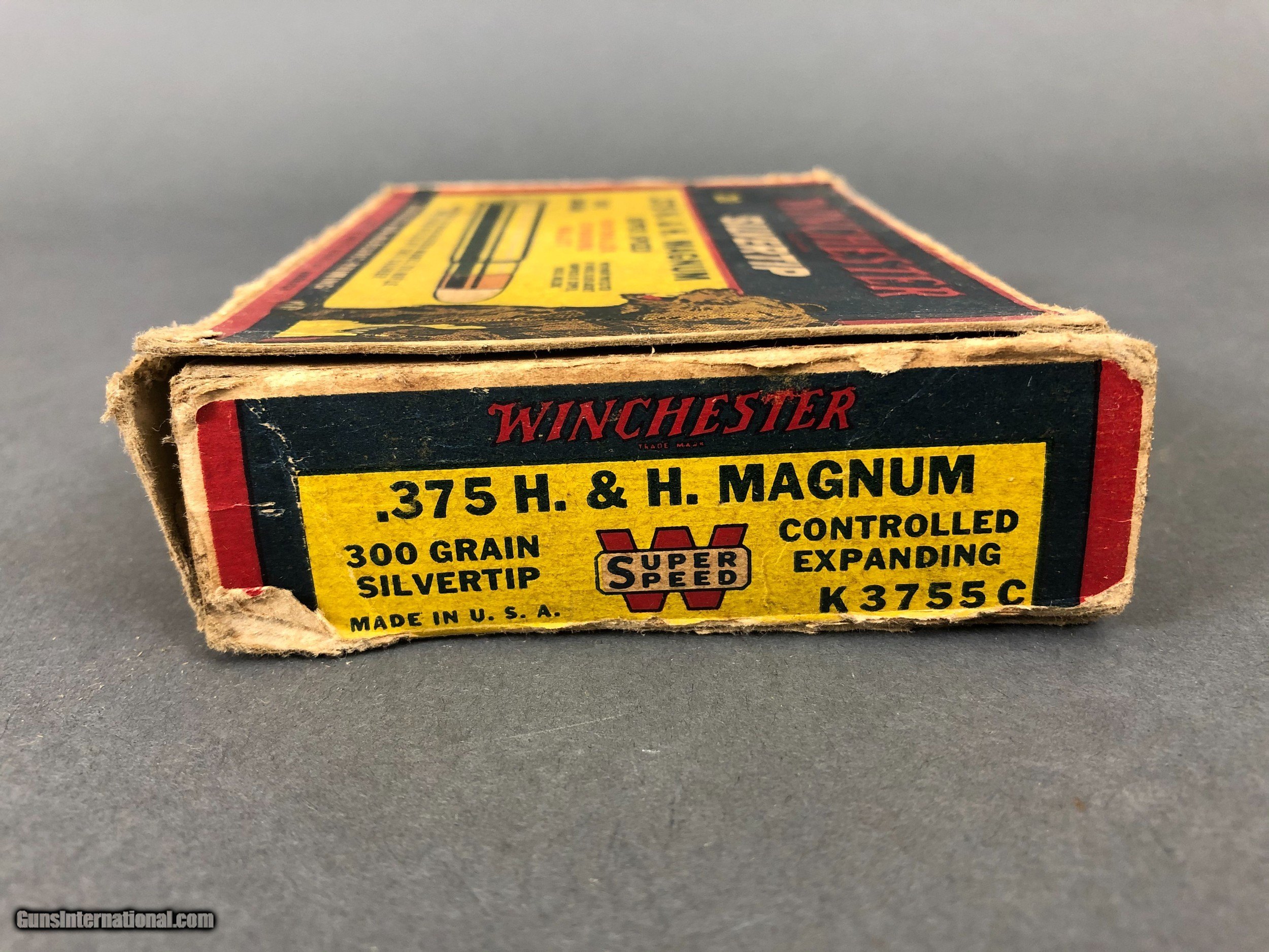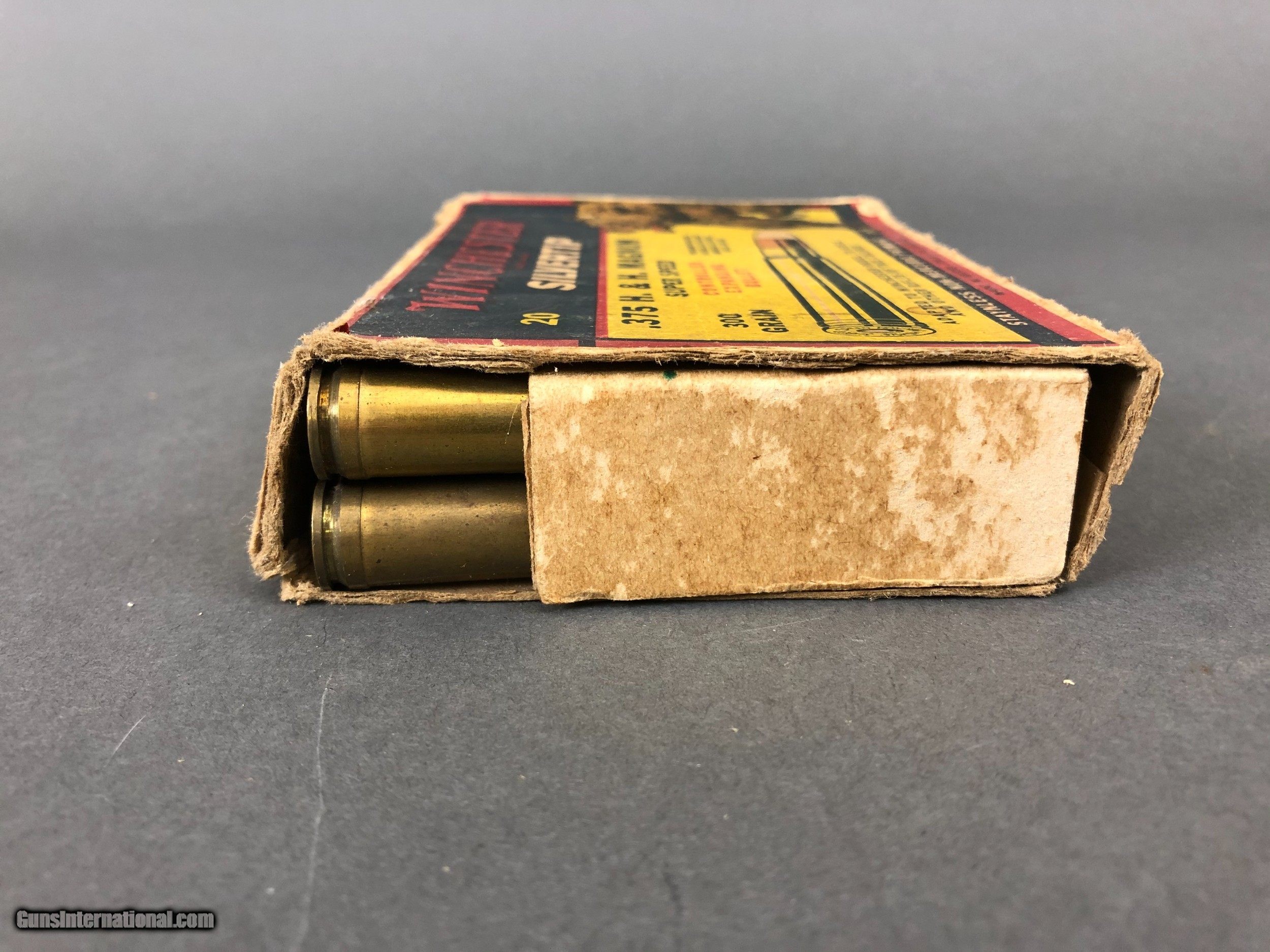 Description: Complete box of 300 grain .375 H&H rifle ammo. Box is in fair condition with one end flap gone. SOLD |