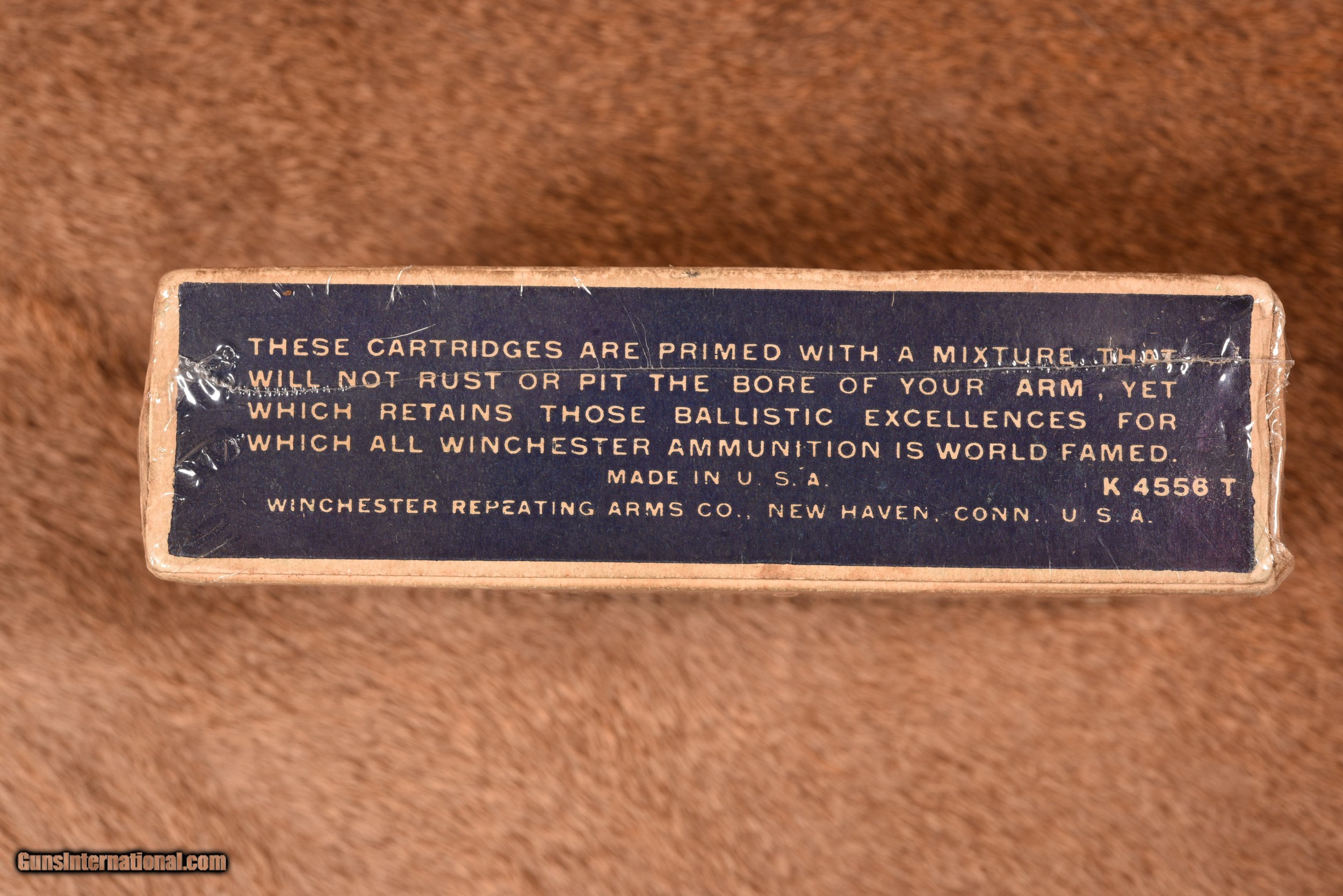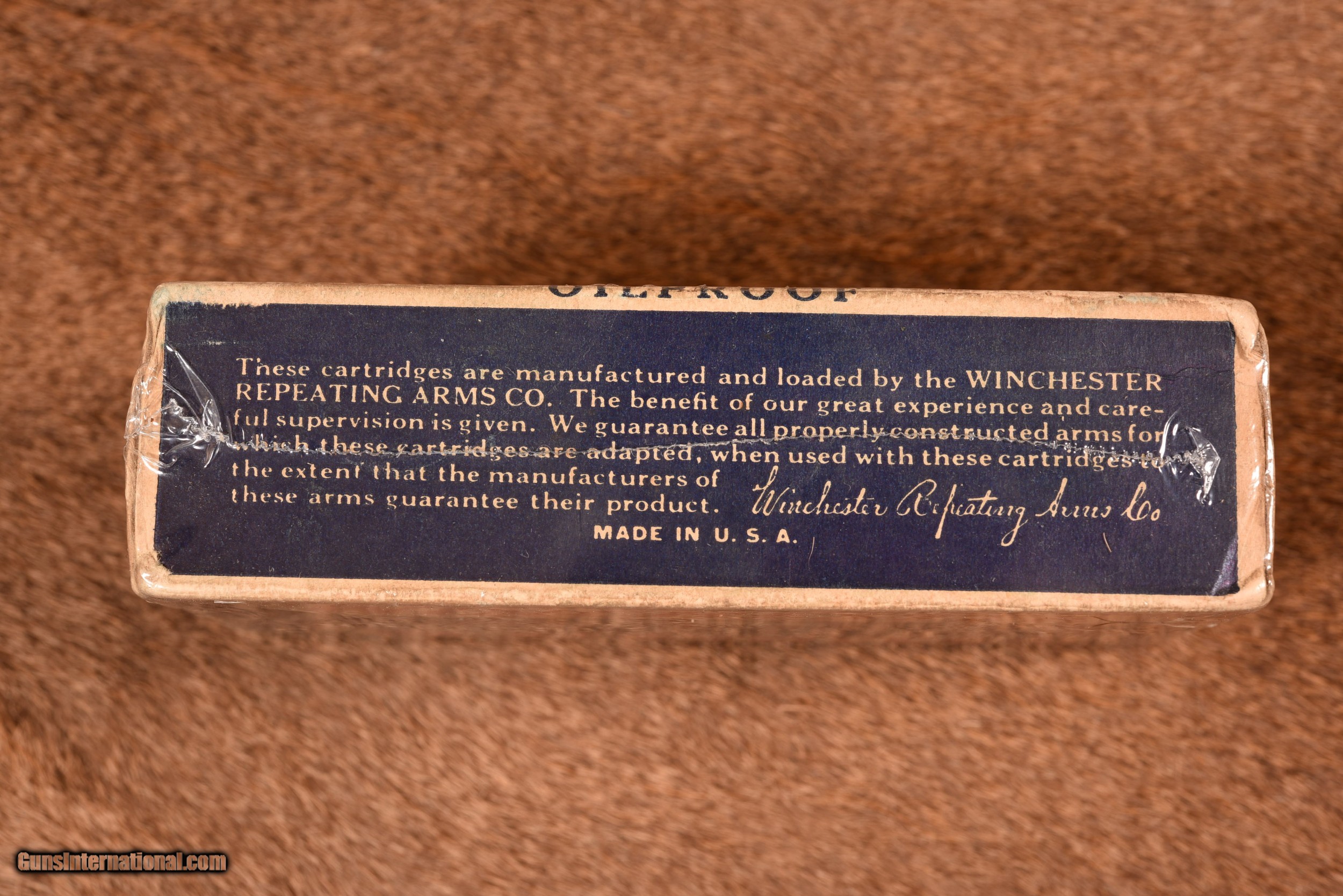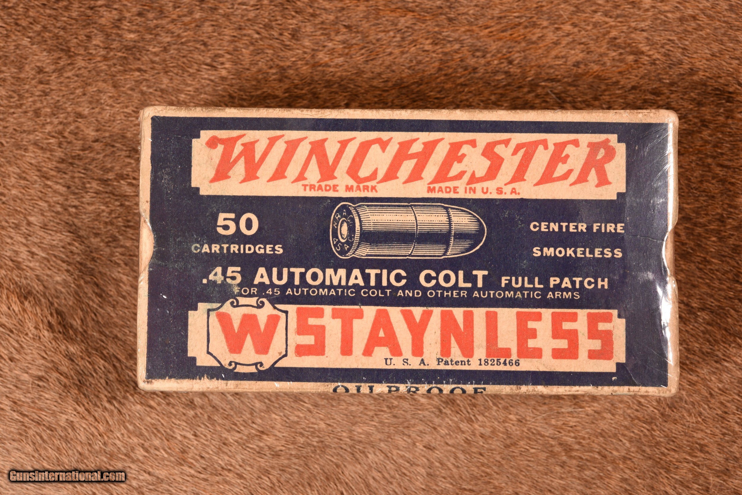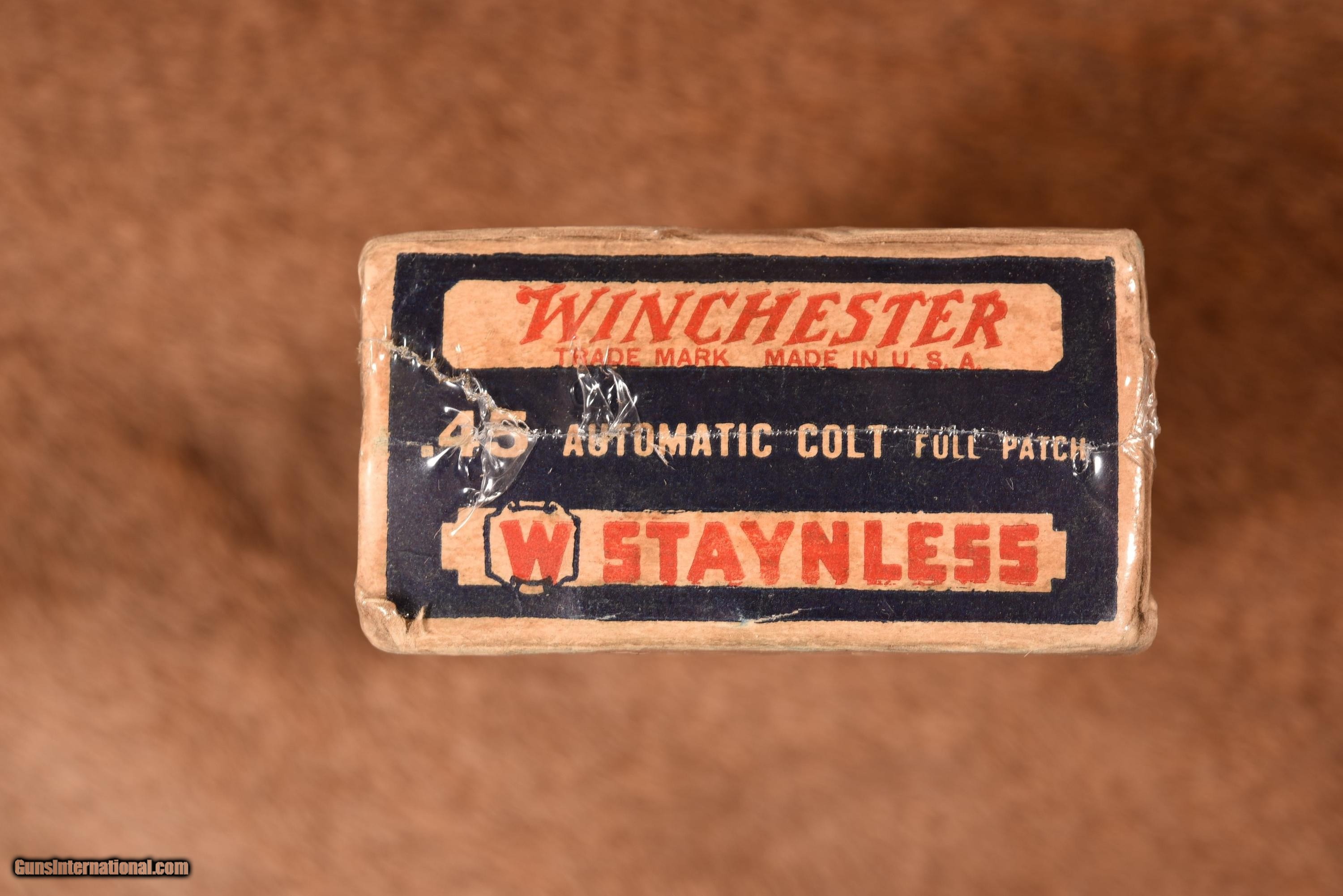 Description: Here is a full and correct box of Winchester Staynless 45 acp ammo from the 20's or 30's. Bright vivid colors with some very light scuffing. Great to display with your early Colt commercial. SOLD |