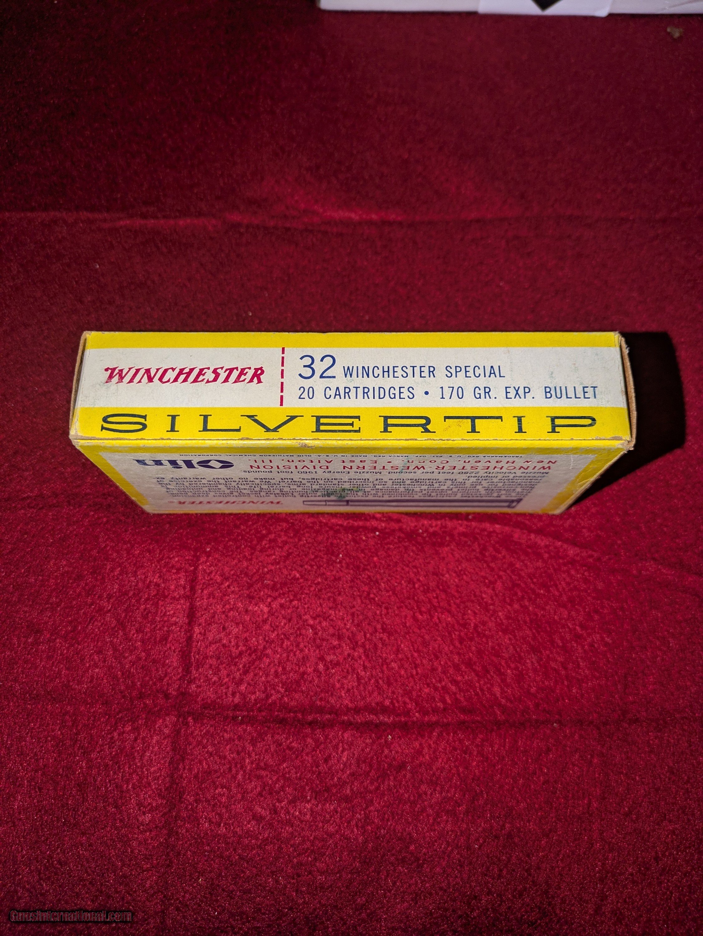 Description: Winchester super speed silvertip ammo. Full factory 20 round box of 32 Winchester special ammo. Box is in nice shape and ammo in nice and clean. Box will be wrapped for display. I combine shipping and also accept visa and MasterCard for payment but it adds 4 percent to total 65.00 plus shipping SOLD Rifle Caliber: .32 Winchester Special |