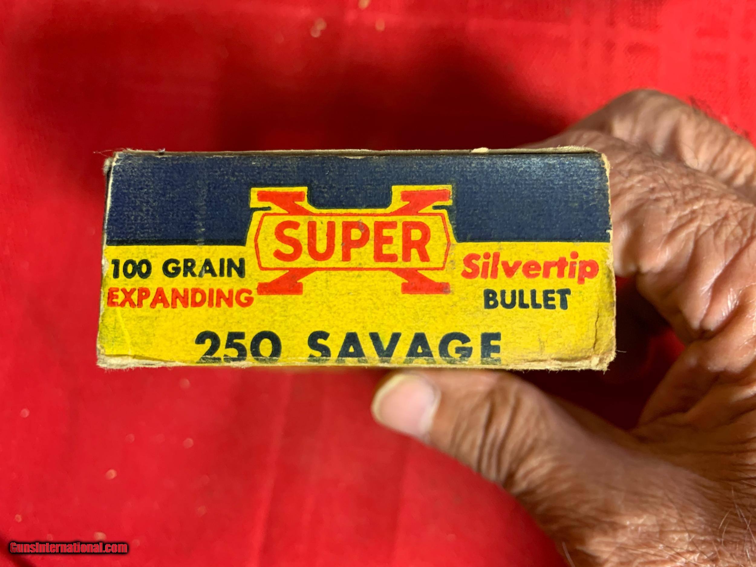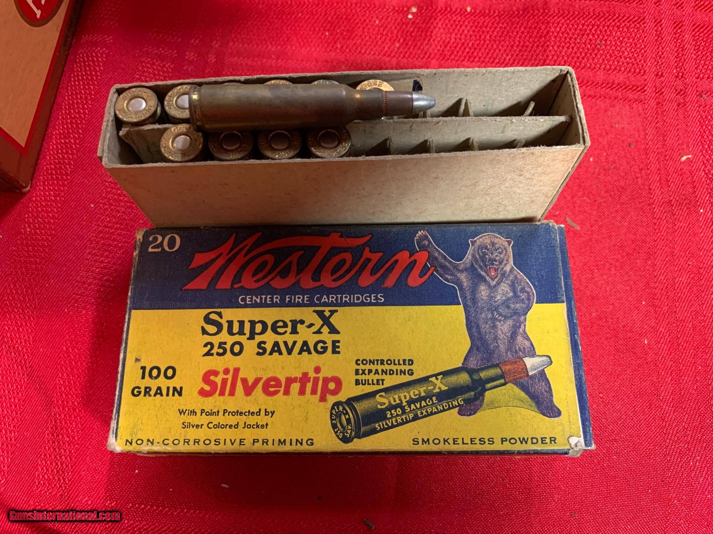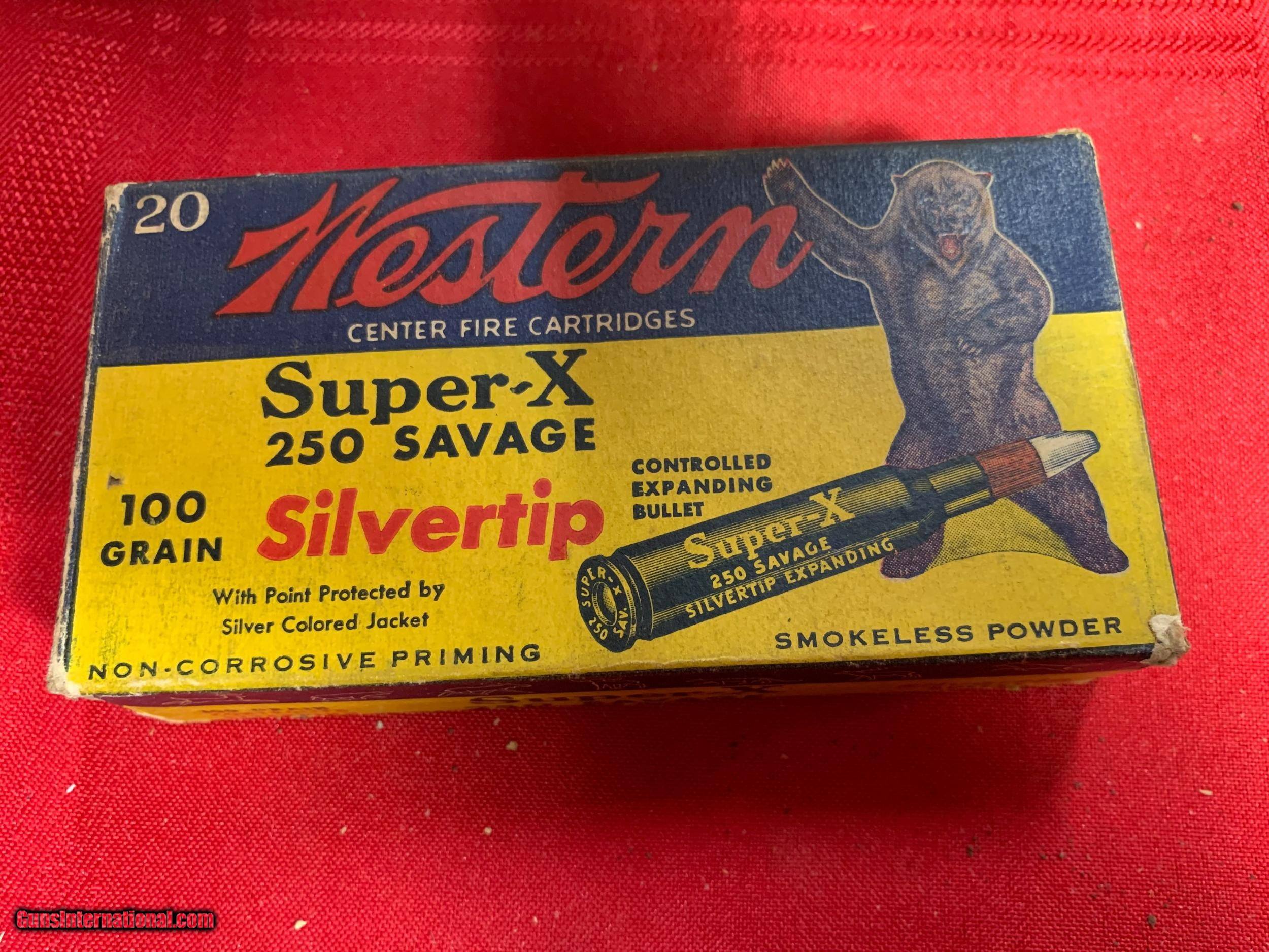 Description: 1 box Winchester Super Speed 250 Savage 87 grain soft point ammo. Full and correct. 1 box Western 100 grain Silvertip. Standing bear. 11 rounds. SOLD |