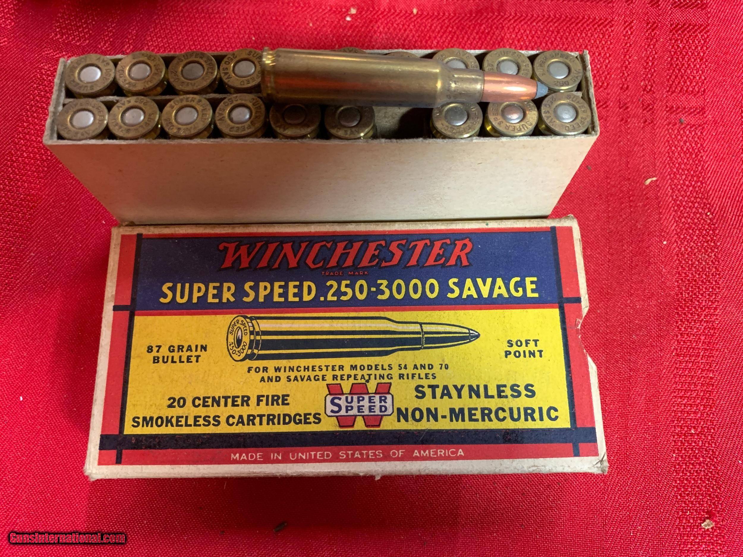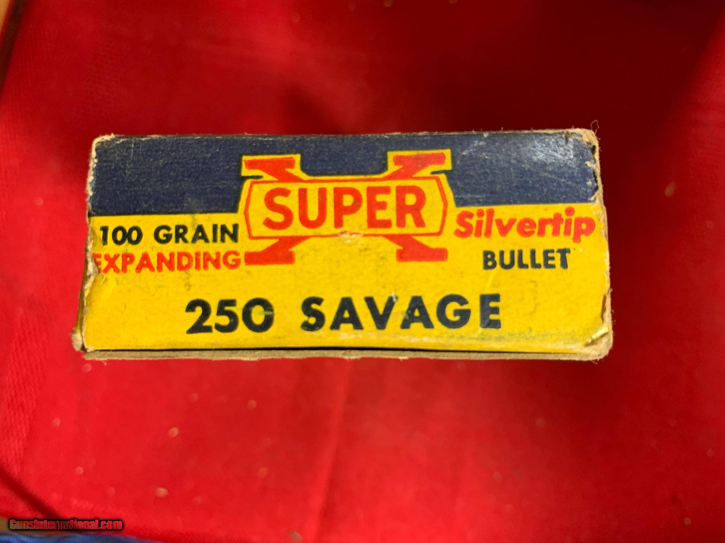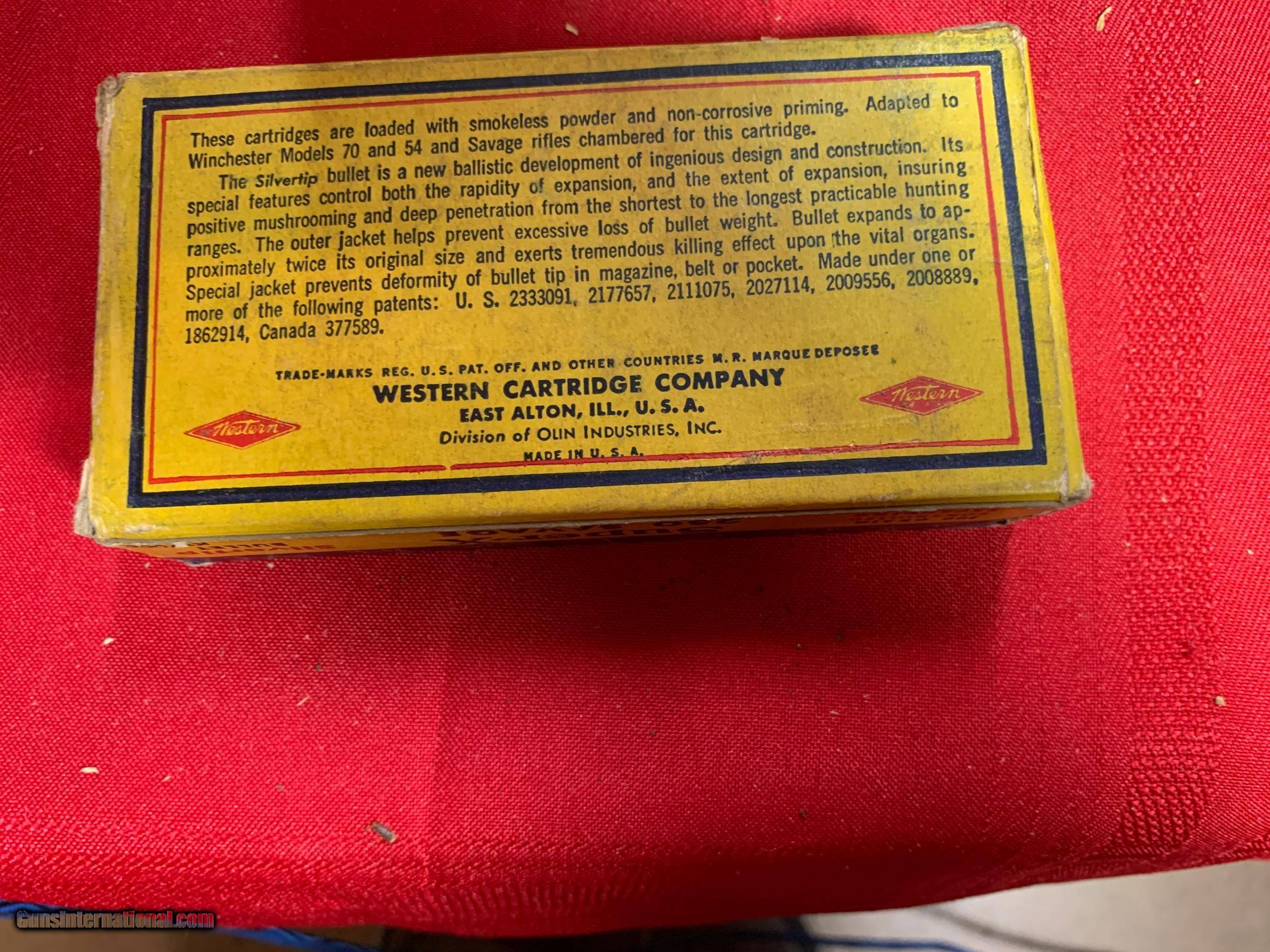 Description: 1 box Winchester Super Speed 250 Savage 87 grain soft point ammo. Full and correct. 1 box Western 100 grain Silvertip. Standing bear. 11 rounds. SOLD |