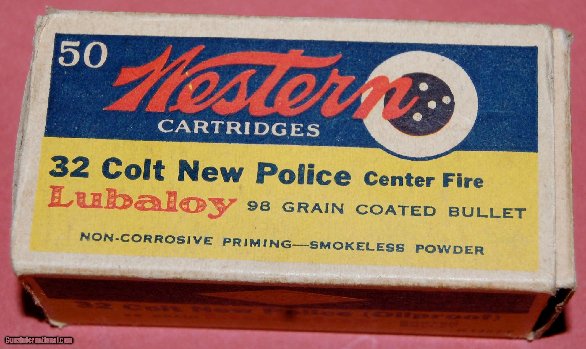 Description: I box of Western 32 Colt New Police 98 grain.This is a full box of 50 rounds.The box has good color but is missing one end flap. SOLD |