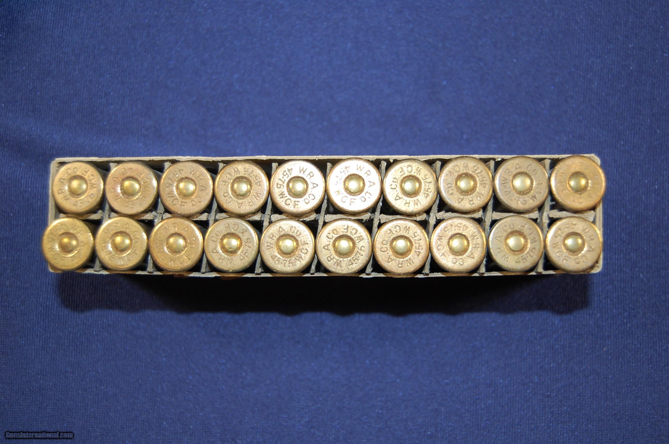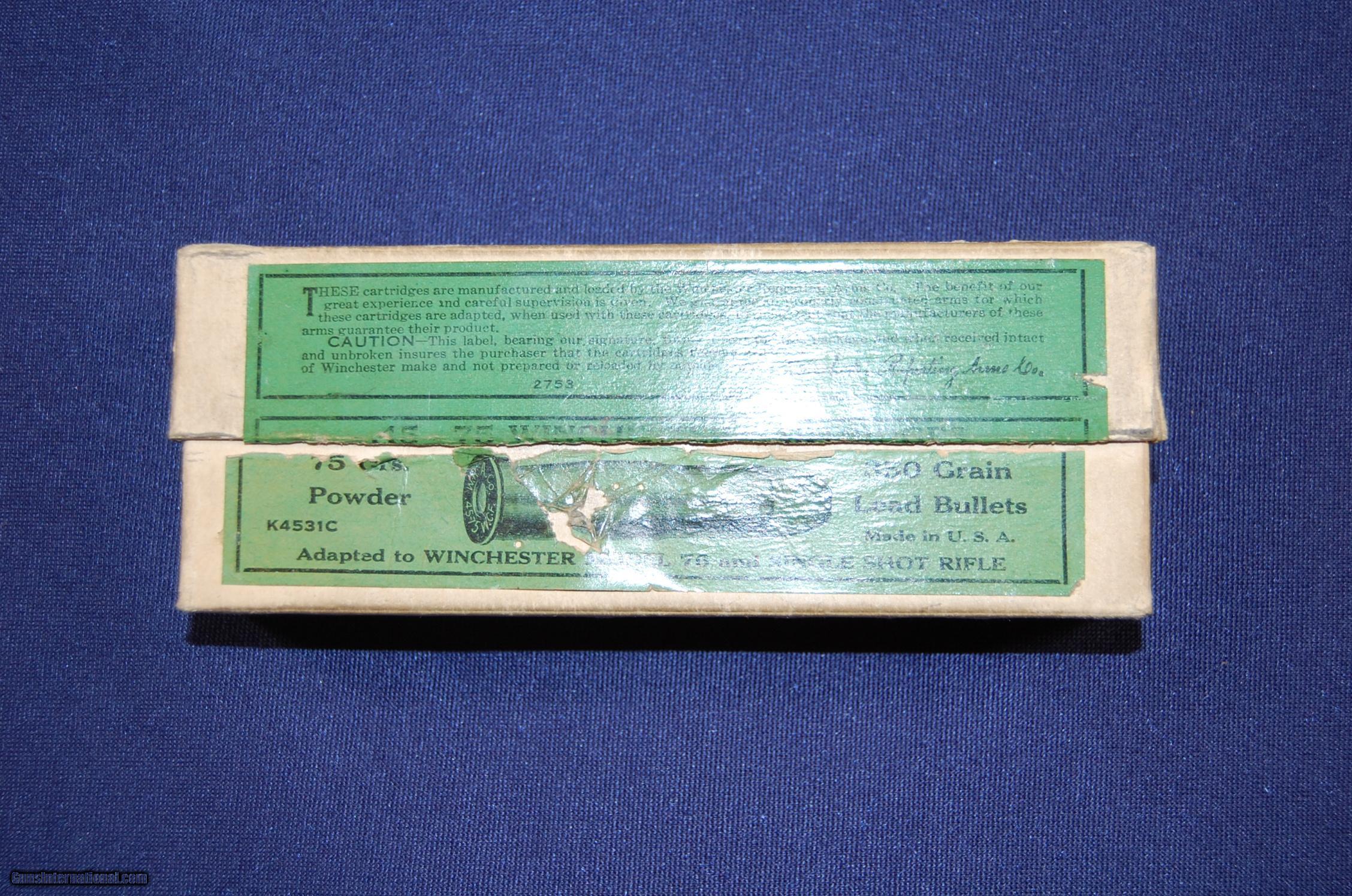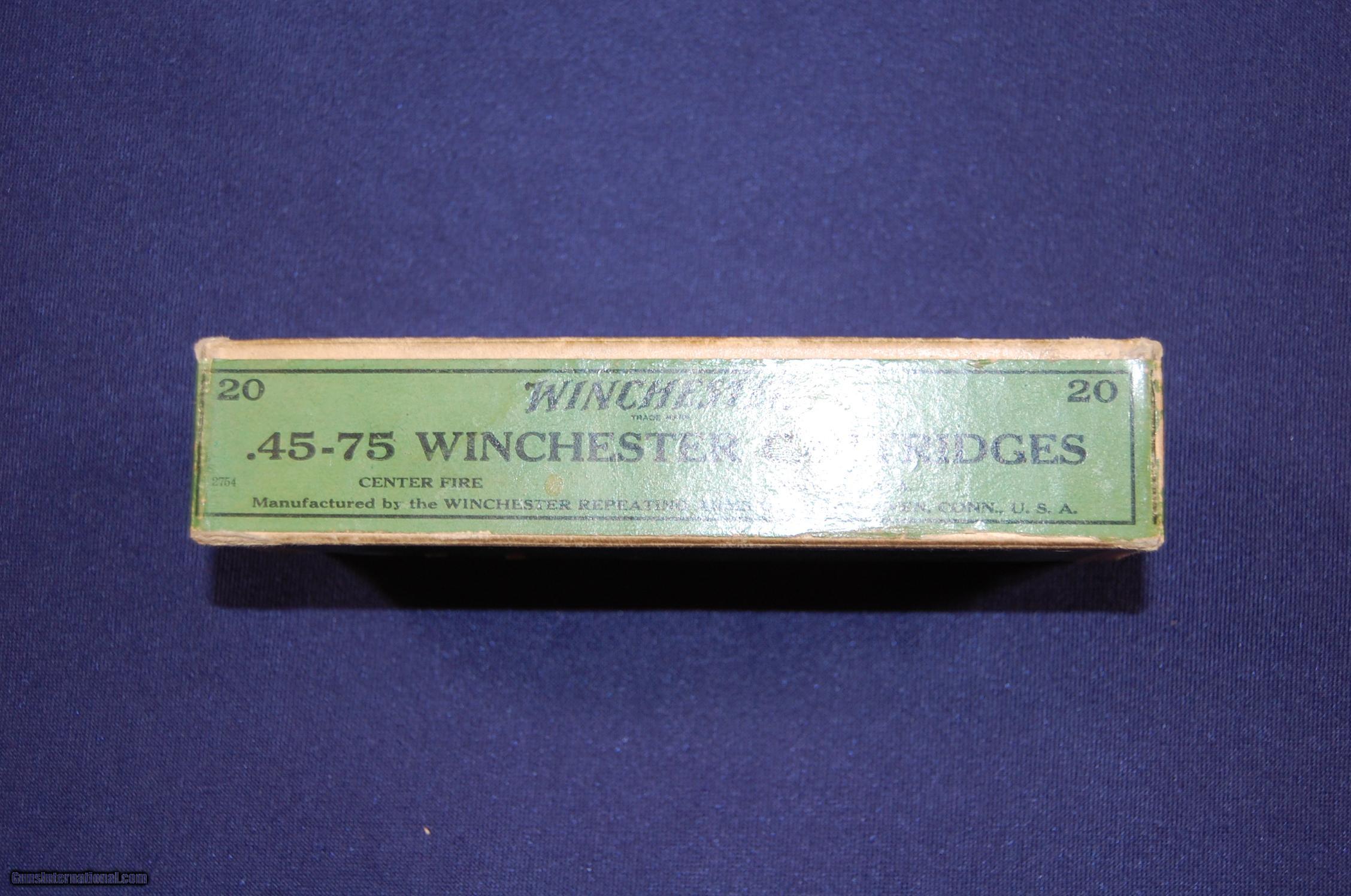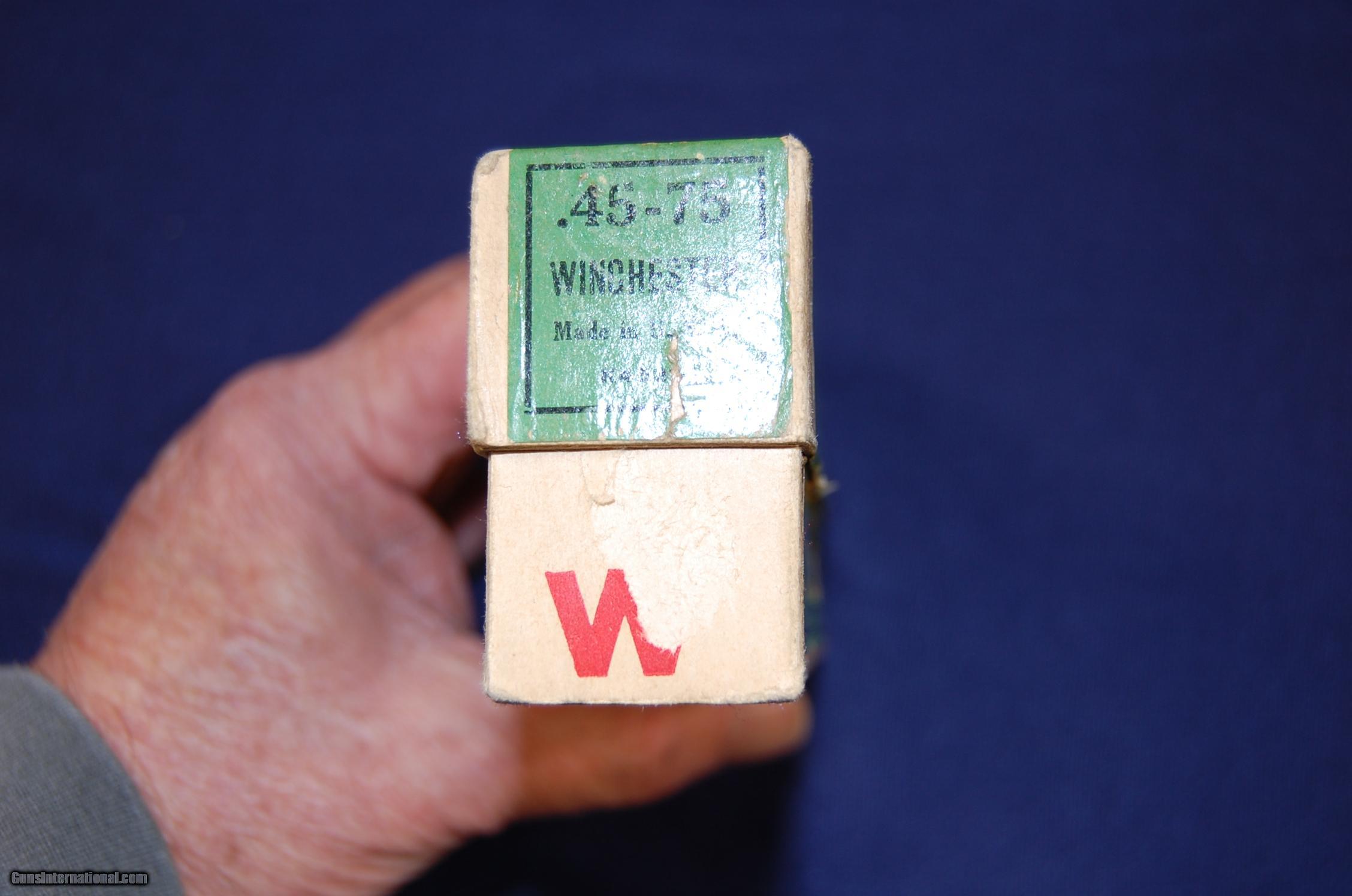 Description: Winchester 45-75 Cartridges 75 grain powder 350 grain Lead Bullets Full Box Red W on sides of box SOLD |